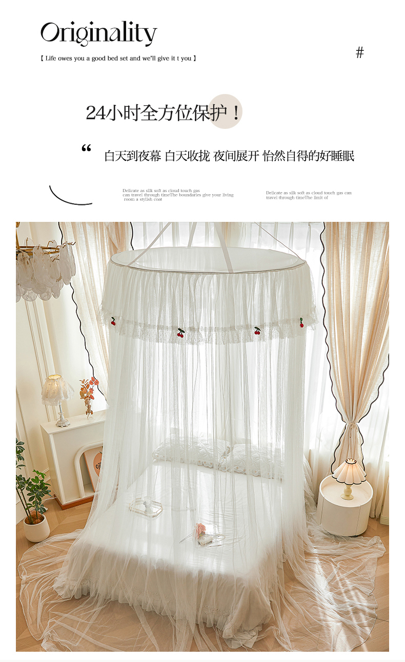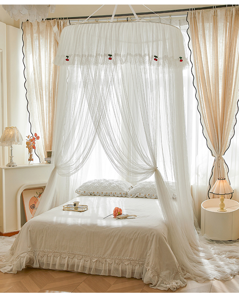 (总)雪姿家纺 2026新款刺绣花边落地宫廷外穿杆蚊帐-落地樱桃,刺绣花边樱桃-烟岚紫灰,刺绣花边樱桃-白色,刺绣花边樱桃-清爽茶绿,刺绣花边樱桃-温柔杏色,刺绣花边樱桃-温馨粉玉