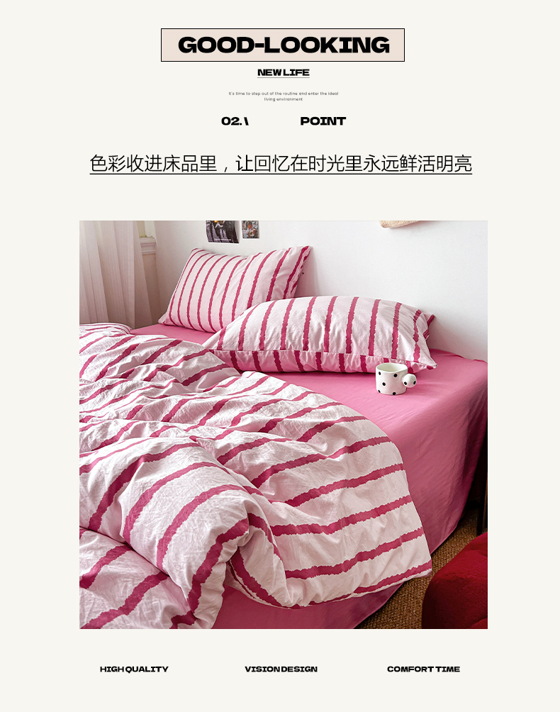 商品名称:逸林家纺《原希尔顿逸林》 2026新款简约印花古法水洗棉三件套拼色床单款学生三件套条纹被套单品三件套 墨染-粉