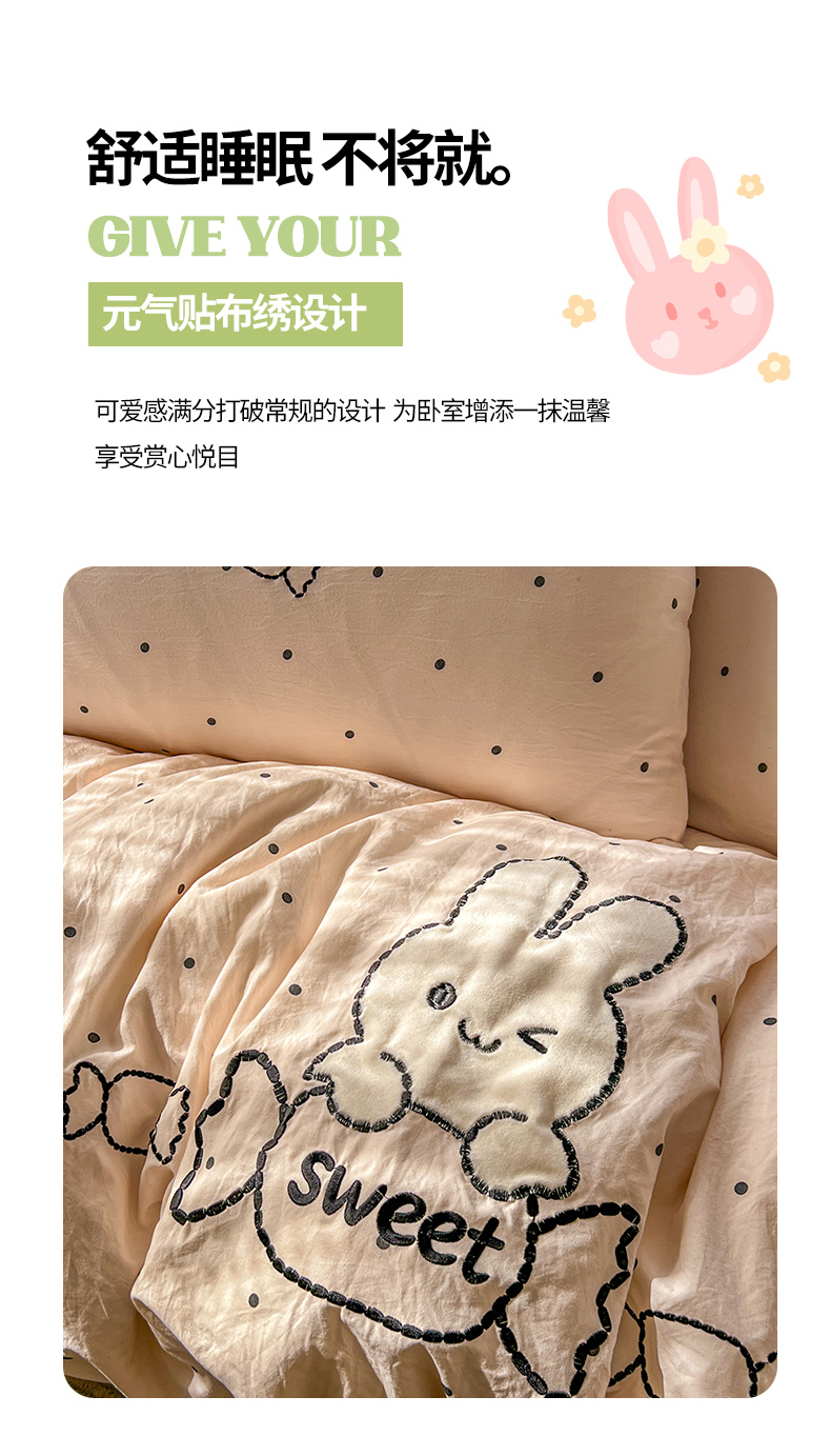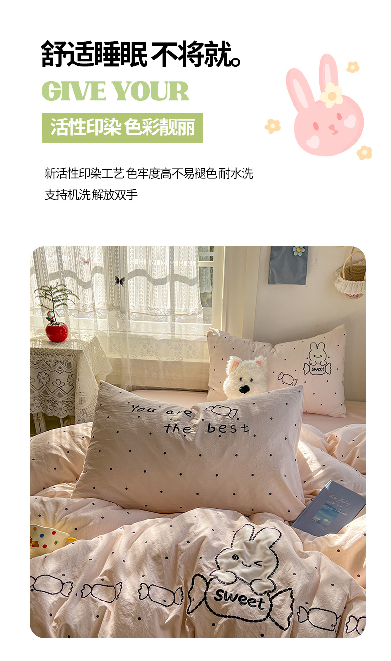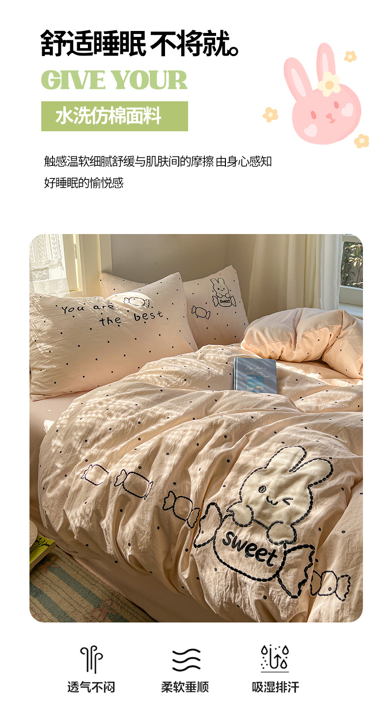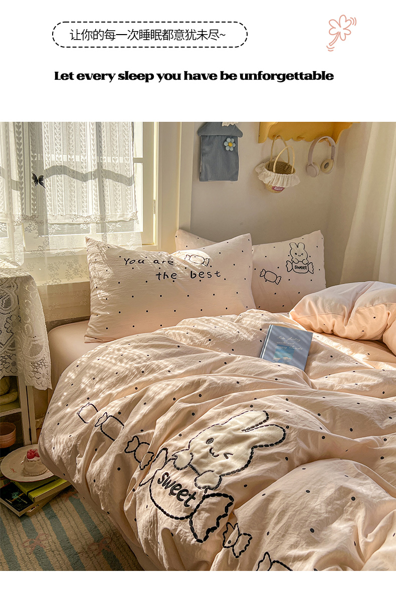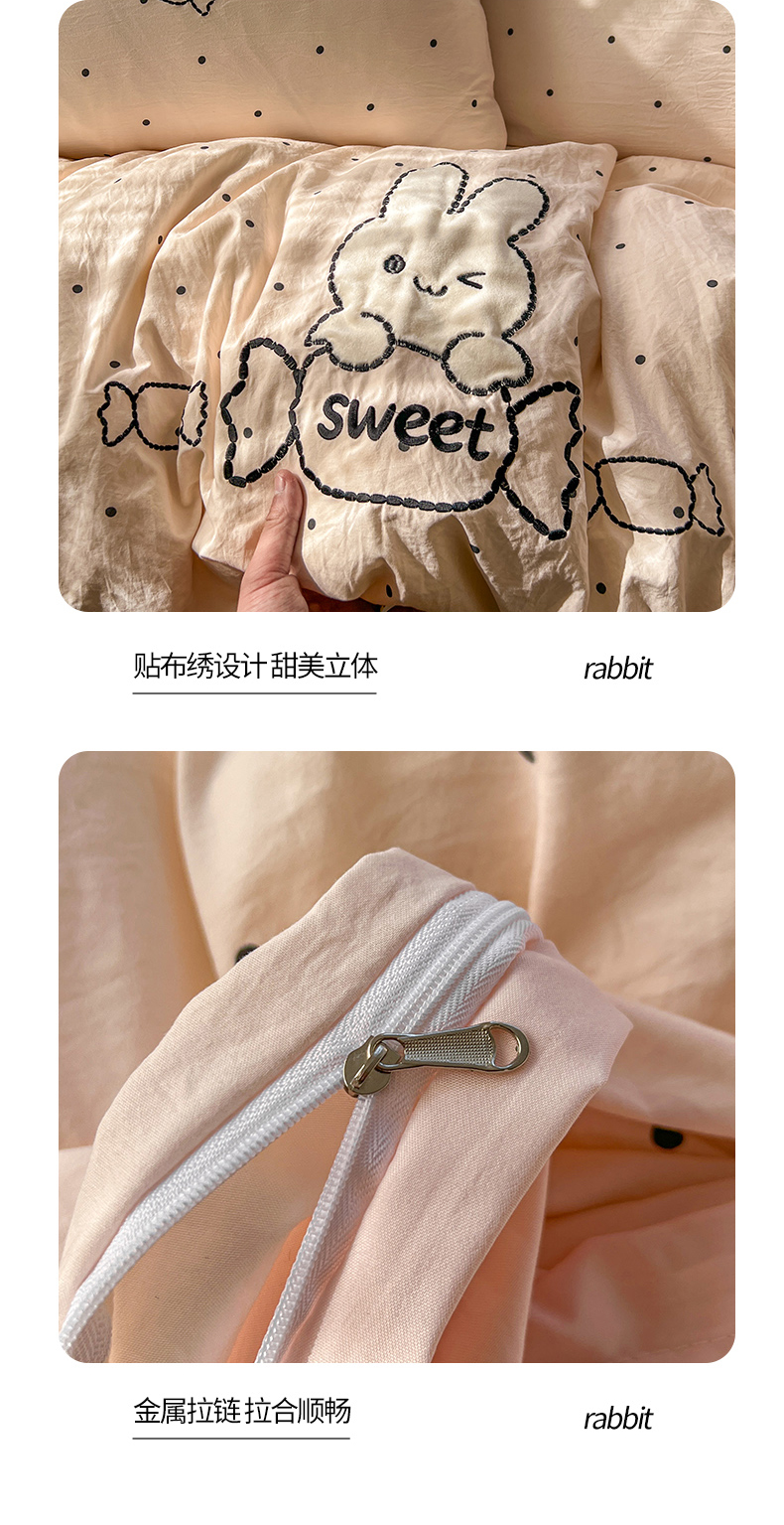 当前位置: 91家纺网 > 商品网购 > 床品套件 > 四件套 > 水洗棉四件套 > 贝凯瑞 2026新款仿棉木棉水洗棉绣花ins小清新床裙床单款四件套-糖果兔系列 糖果兔-糯米玉