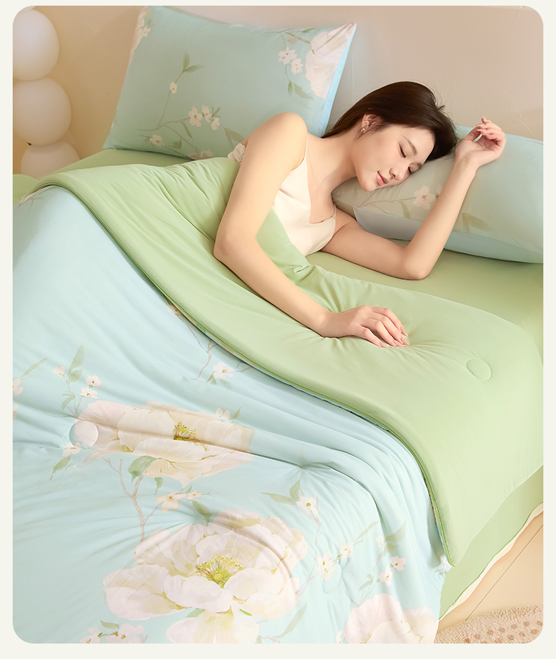 (总)恬思语家纺 2026春夏新品莱赛尔天丝印花蚕丝夏被夏凉被空调被,绮梦-玉,幸福里-绿