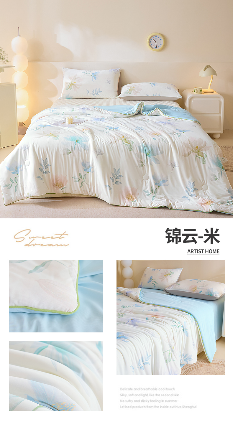 (总)恬思语家纺 2025新款凉感丝时尚彩绘夏凉被,淡雅云影,粉色梦幻,蓝绿云丝,浪漫飘带,清新水漾,柔和幻彩