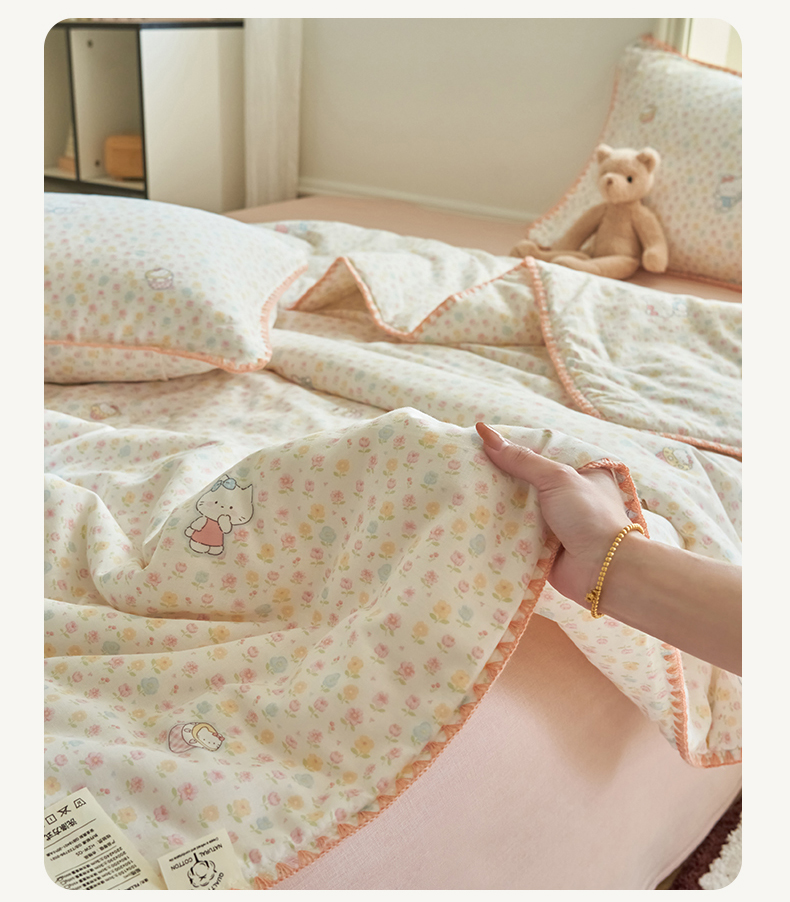 (总)恬思语家纺 2026春夏全棉双层纱棉花夏被空调被夏凉被四件套贝壳边系列,Ш櫻漫语,彩星芒,春晓-粉,春晓-绿,粉粉猫,花从兔-紫,咖啡狗,蓝汐-灰,南瓜派对,浅花町,阳光小马,云絮花-蓝,组合图仅供参考不可下单