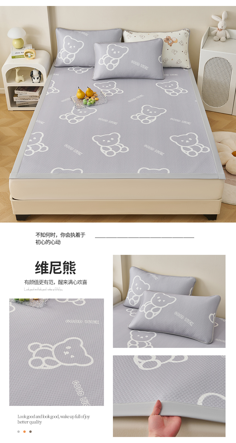 • 91家纺网 家纺一手货源 找家纺 (总)家品罗兰 2026新款夏季A类印花冰豆豆凉席三明治透气网冰丝凉席家用双人冰丝席床单-学生床,巴比兔,抱抱熊,饼干熊,海洋世界,卡皮巴拉,蘑菇乐园,甜甜圈,兔宝贝,维尼熊,小企鹅,熊猫家园,叶语