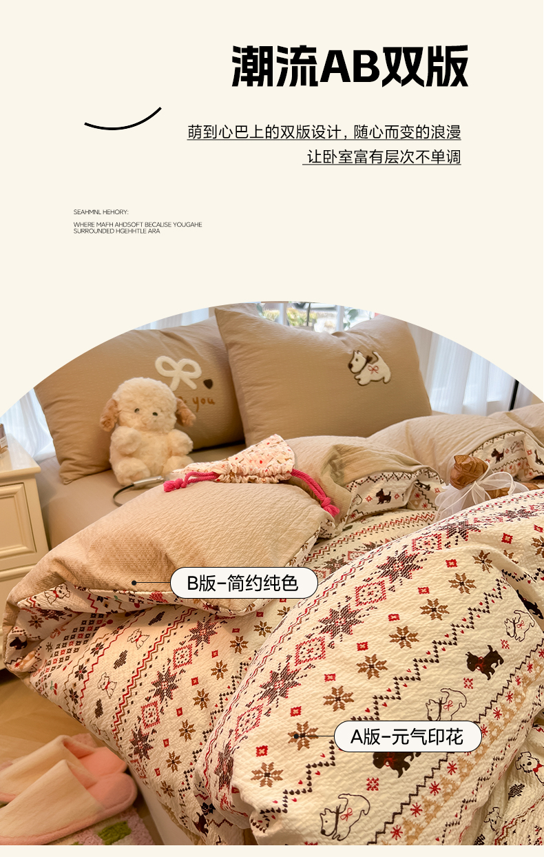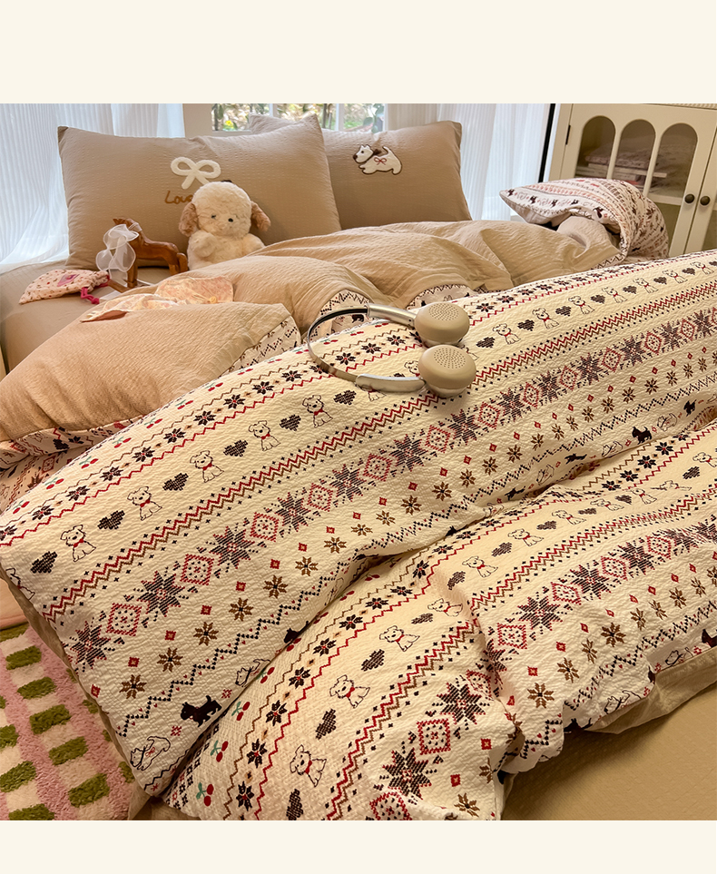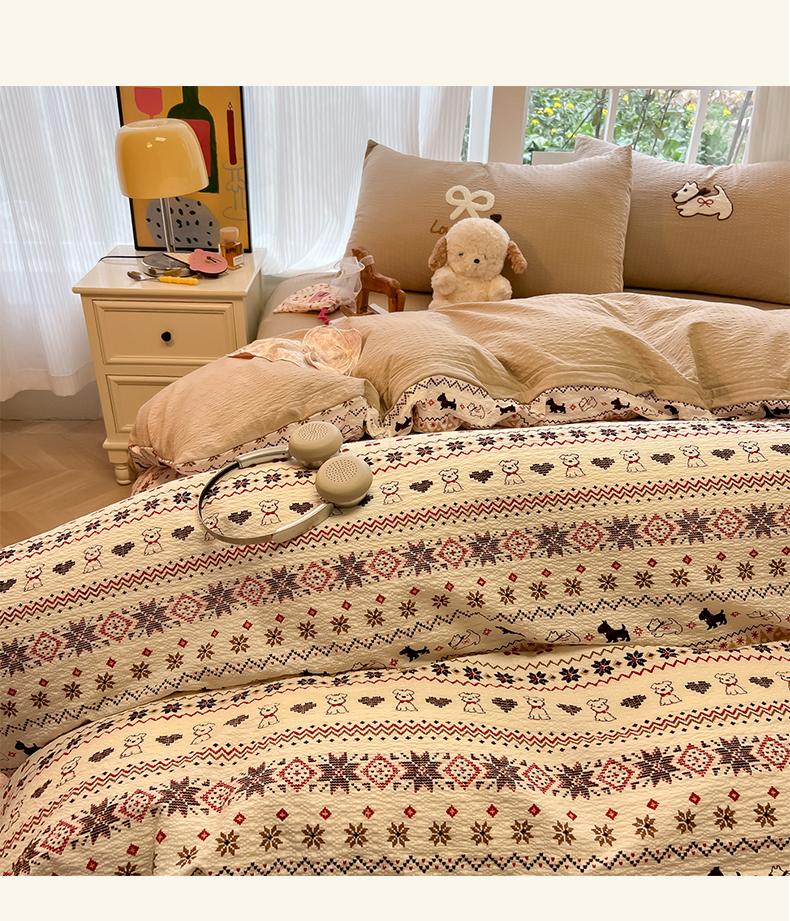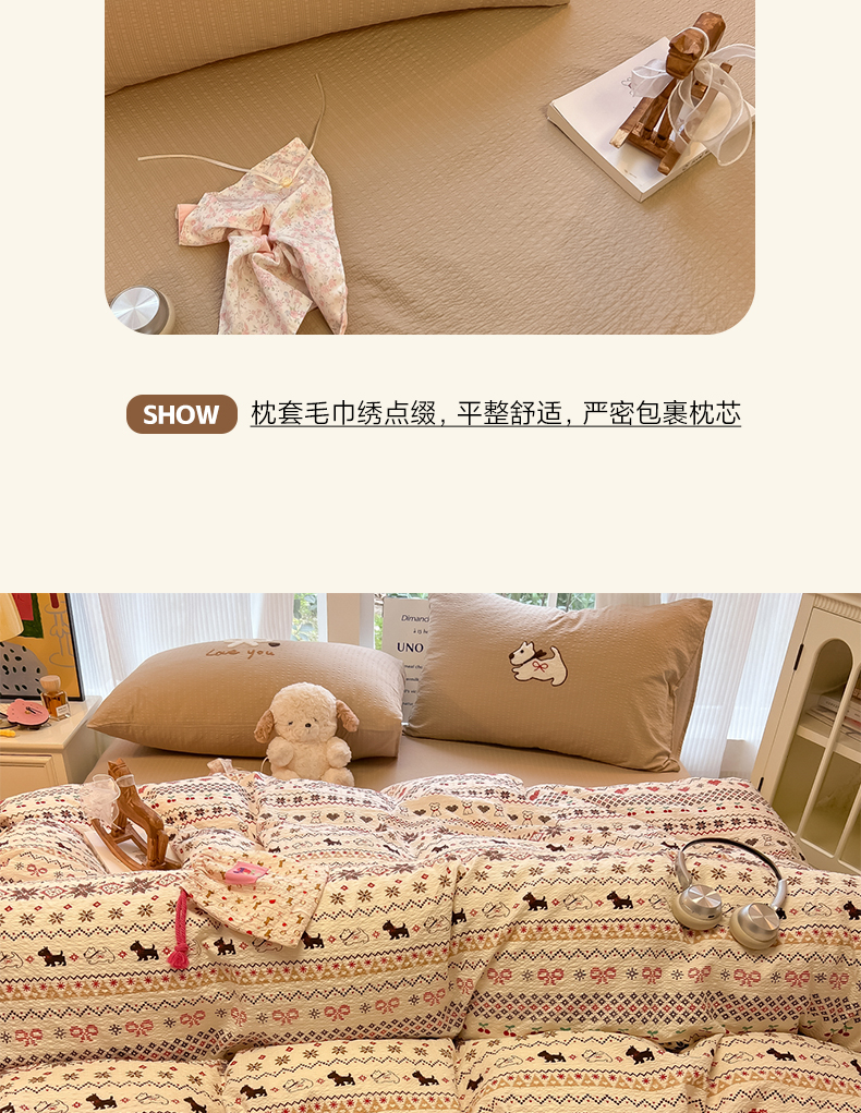 当前位置: 91家纺网 > 商品网购 > 床品套件 > 四件套 > 毛巾绣四件套 > 韩巢家纺 2026新款泡芙纱费尔岛毛巾绣四件套 萌物条条-毛巾绣