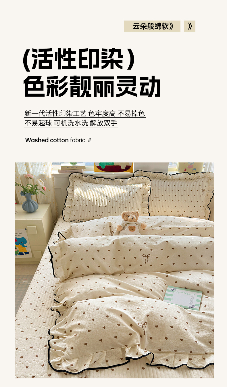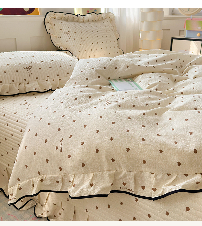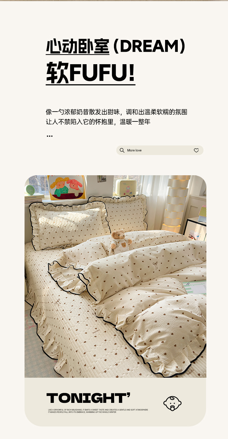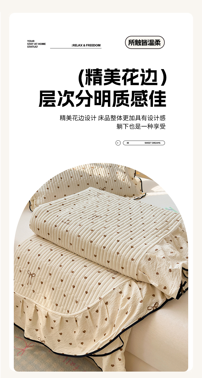 当前位置: 91家纺网 > 商品网购 > 床品套件 > 四件套 > 其它四件套 > 壹和 2026新款A类云感花边款双层纱床盖款和床单款四件套单床盖单被套 焦糖爱心