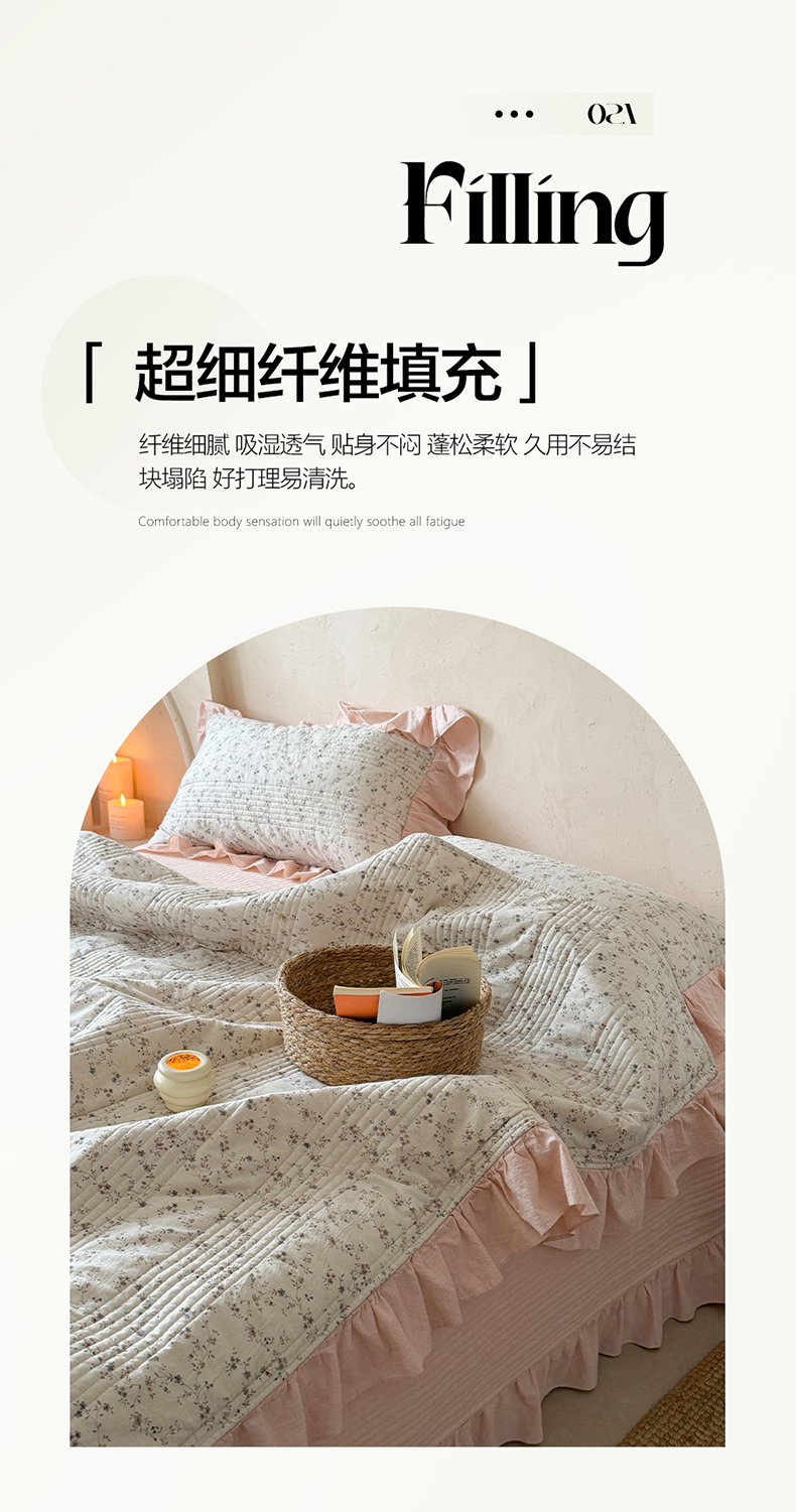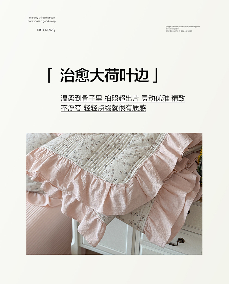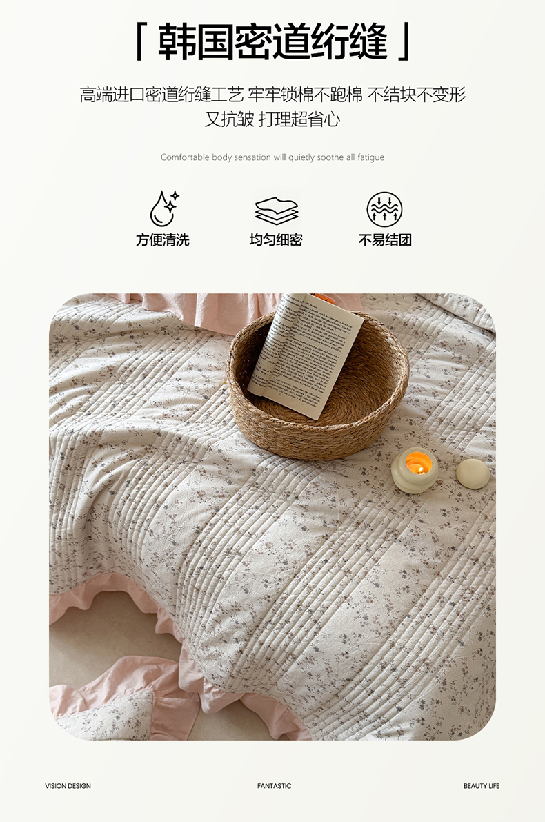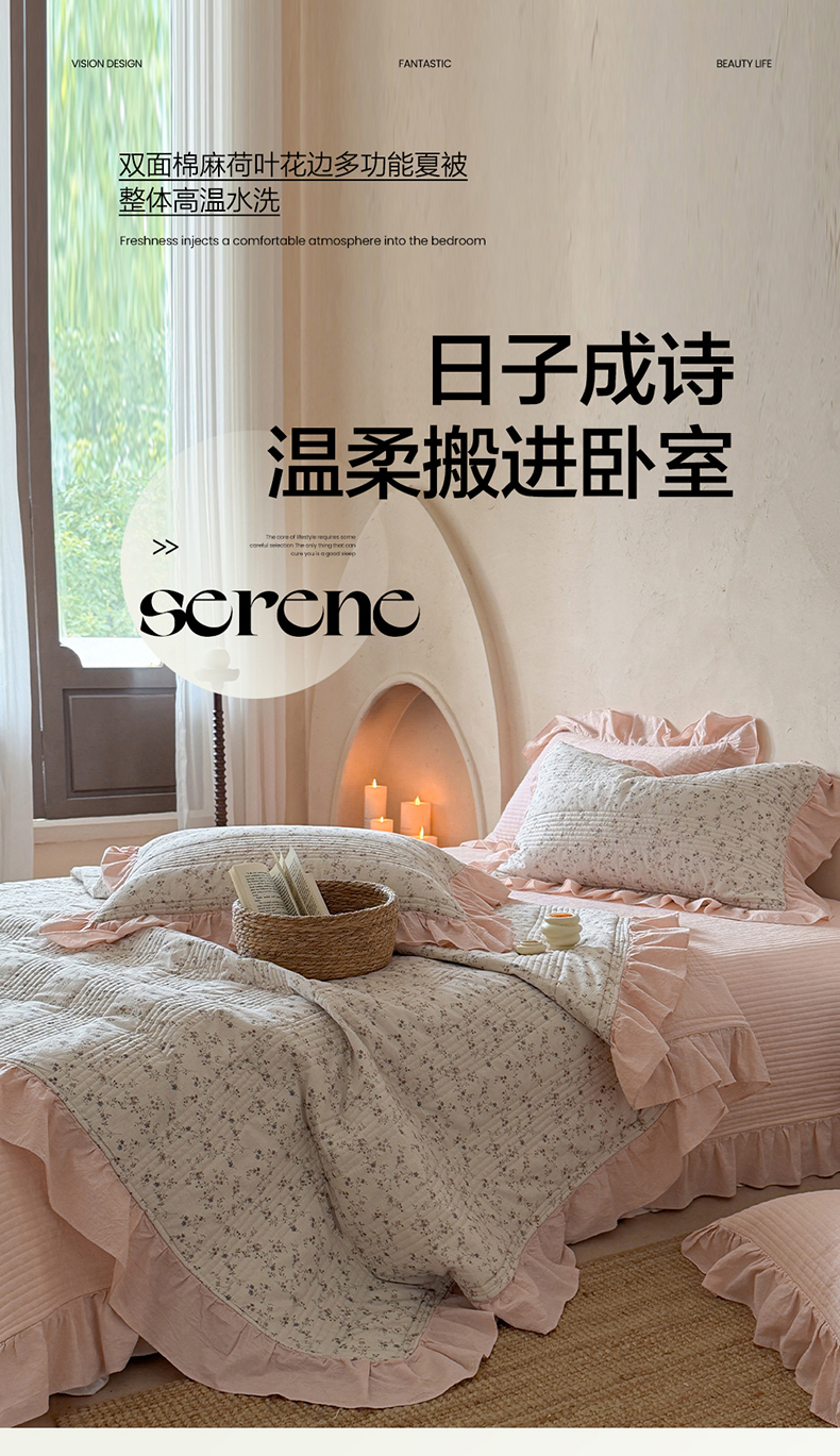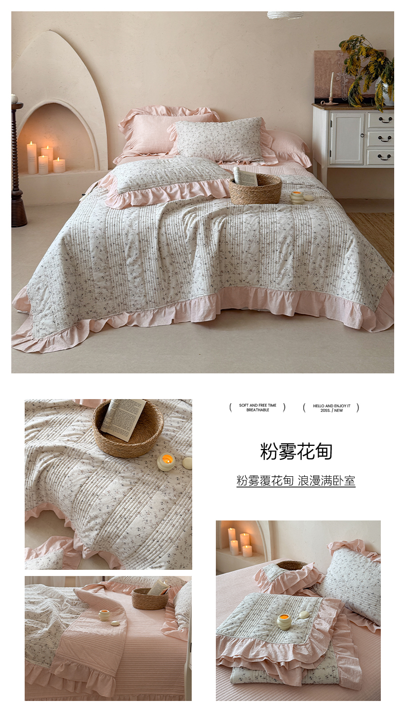 (总)漫调家纺 2026春夏新品双面棉麻法式荷叶边高温水洗夏被可配夏被四件套床单床盖四件套(夏被四件套咨询微信),粉雾花甸,蓝雾花影,奶杏枝蔓,青枝野果,组合