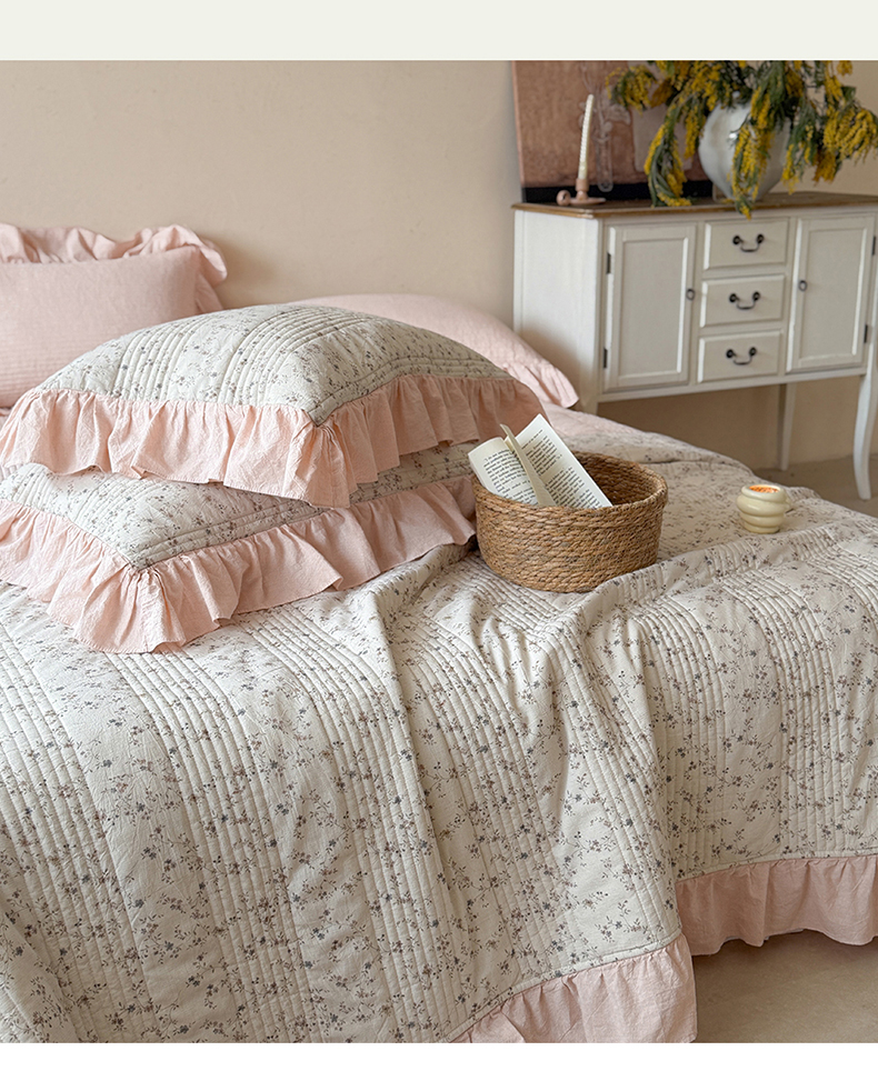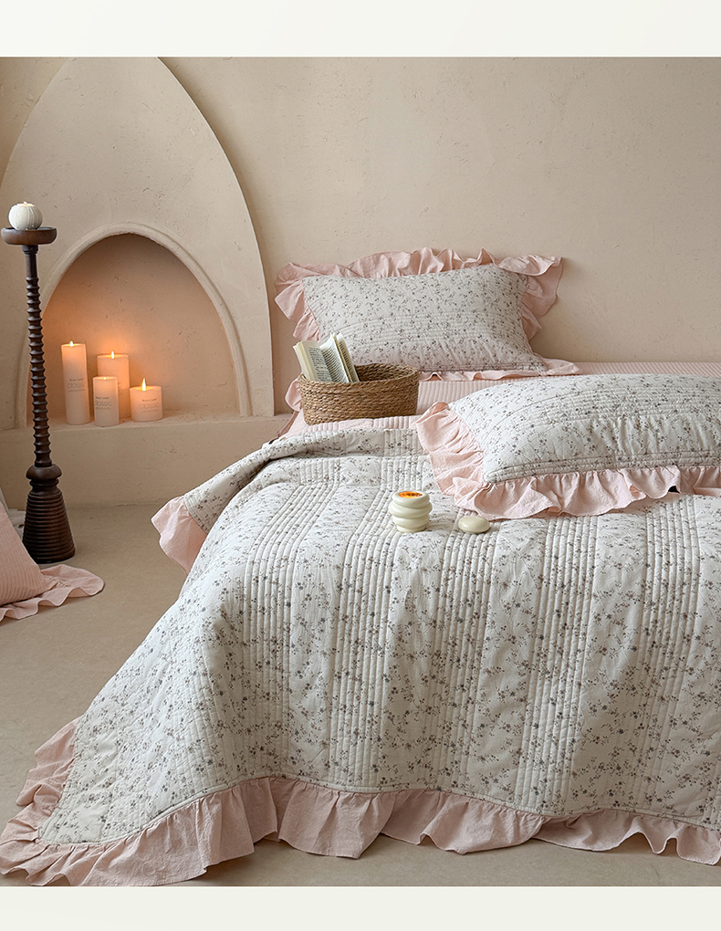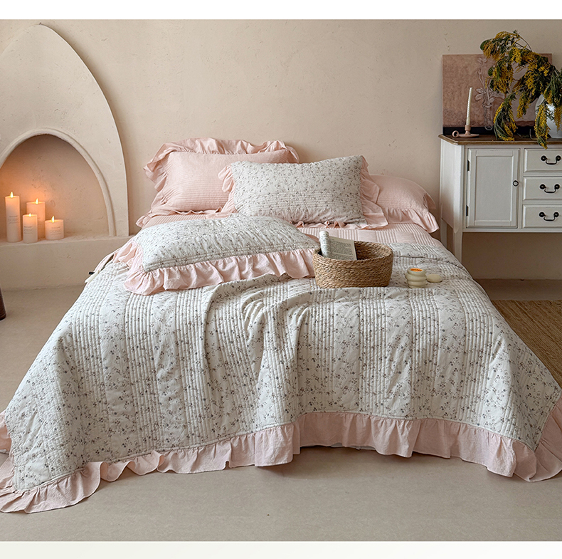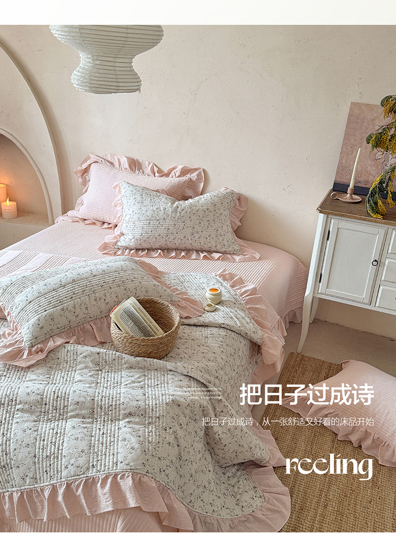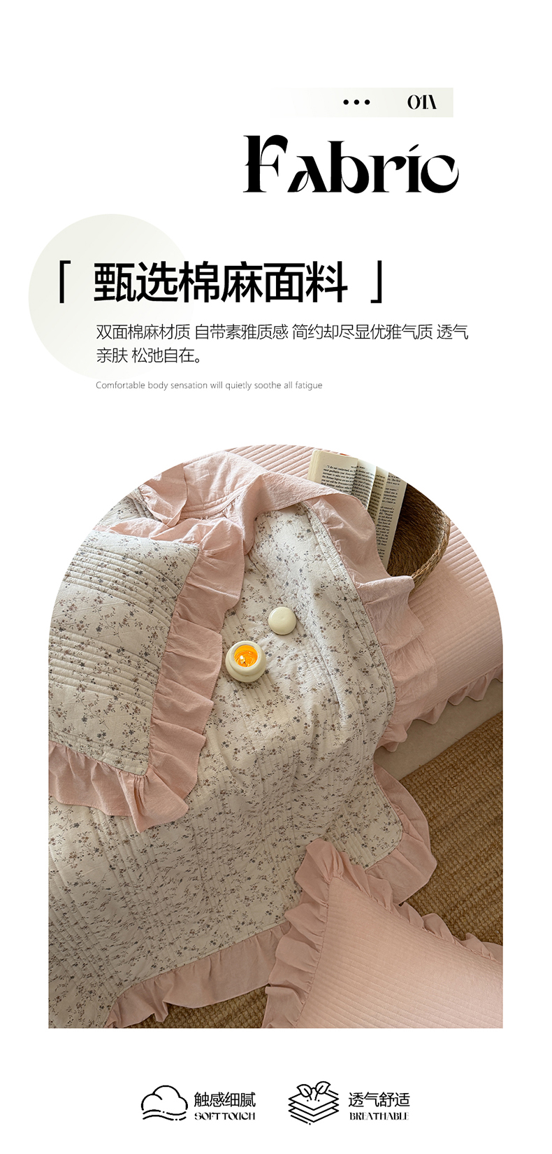 漫调家纺 2026春夏新品双面棉麻法式荷叶边高温水洗夏被可配夏被四件套床单床盖四件套 组合
