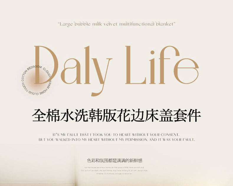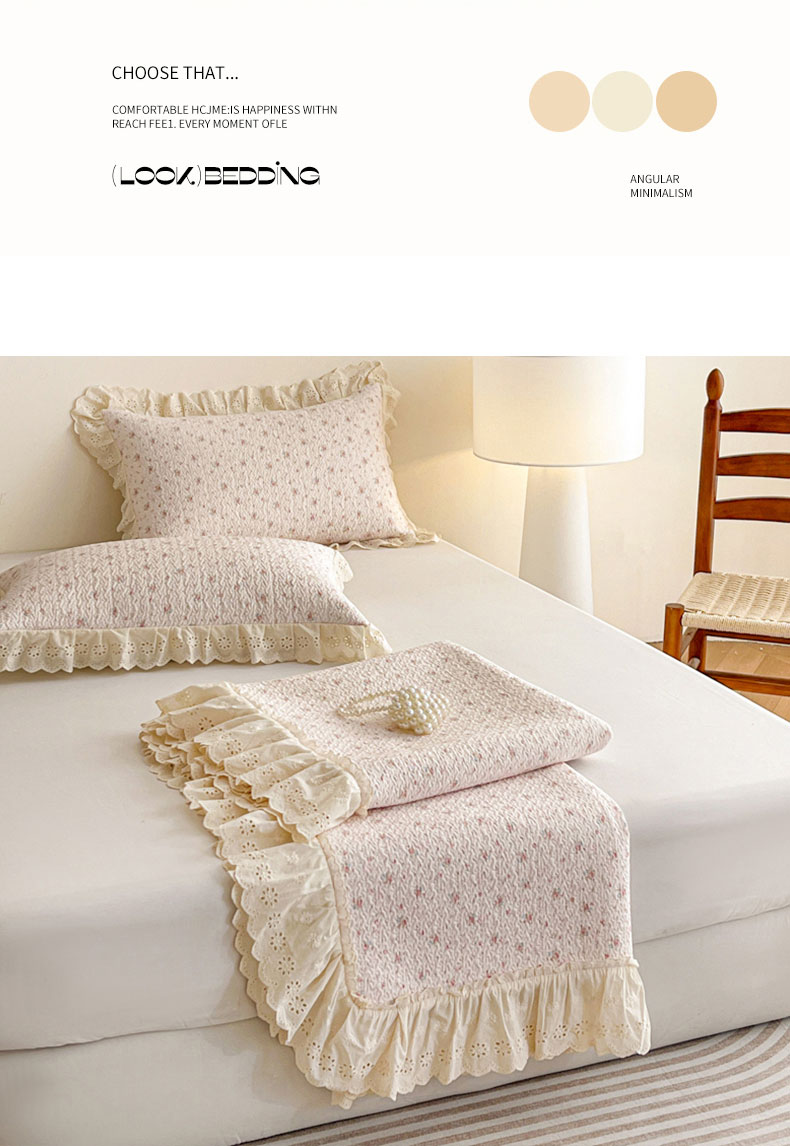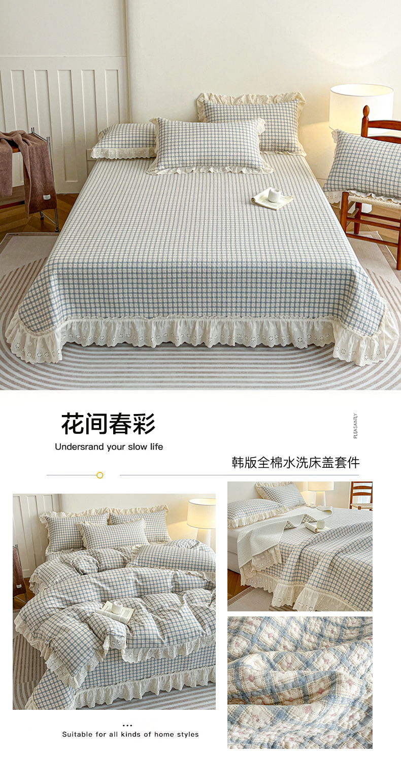 当前位置: 91家纺网 > 商品网购 > 床品套件 > 四件套 > 全棉普通四件套 > 羽爱家纺 2026新款全棉水洗韩版花边床盖四件套 花茵淡