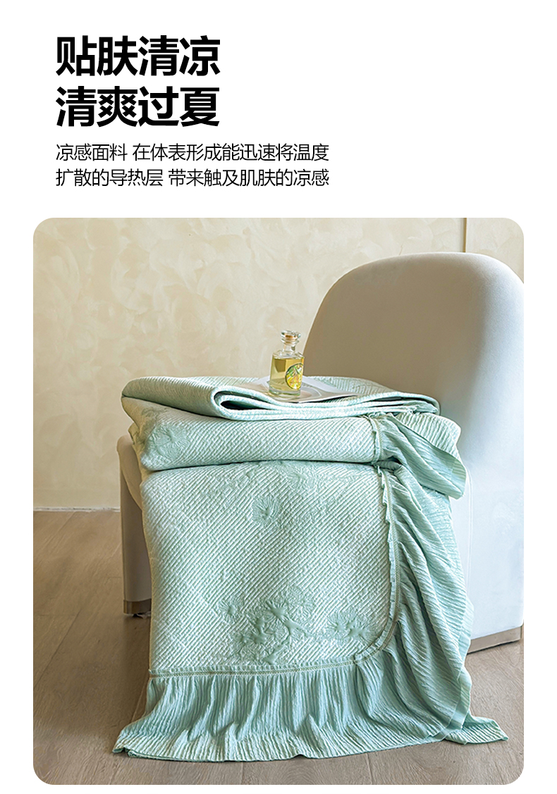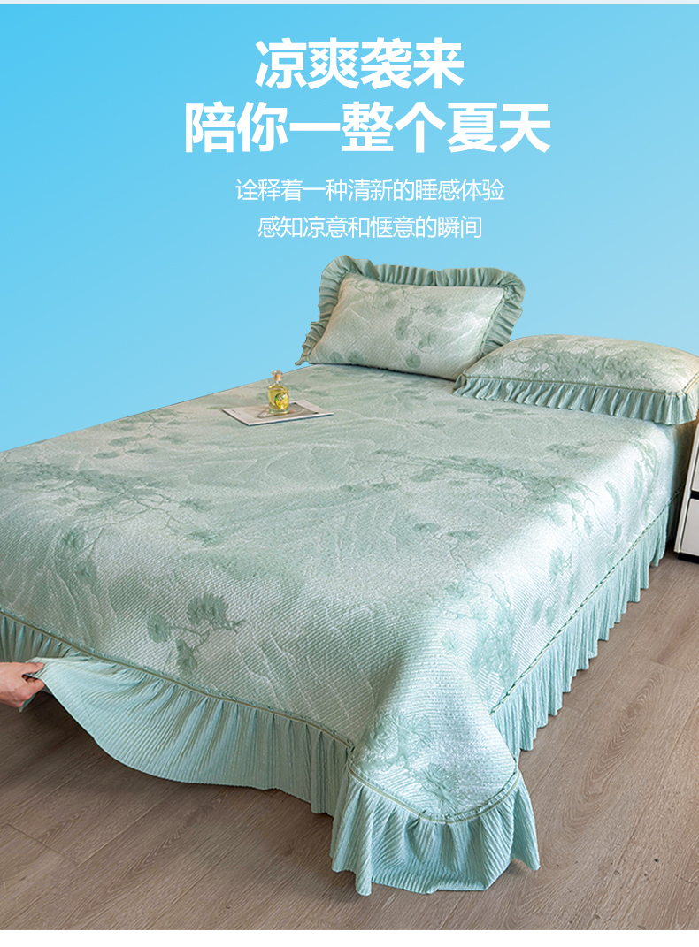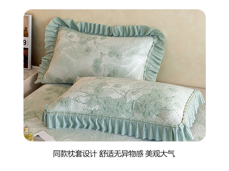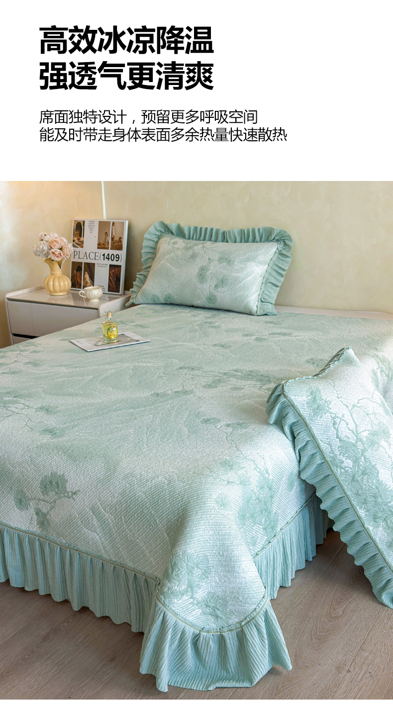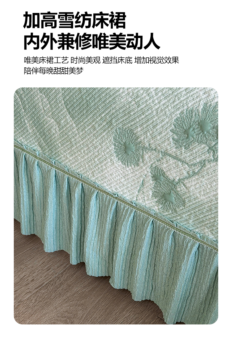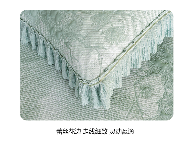 商品名称:慕木家纺 2026新款A类乙纶双面提花560克冰豆豆花边床盖款床裙迎客松系列(提供买家秀) 迎客松-绿