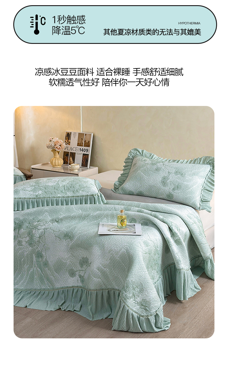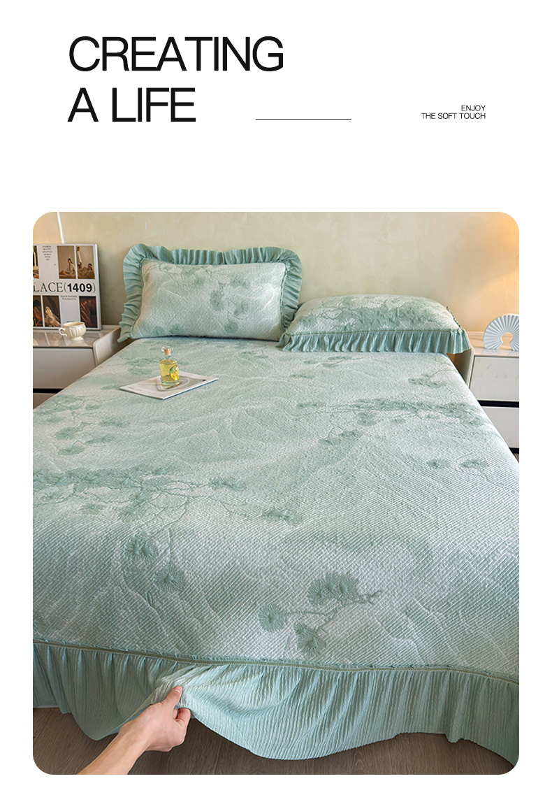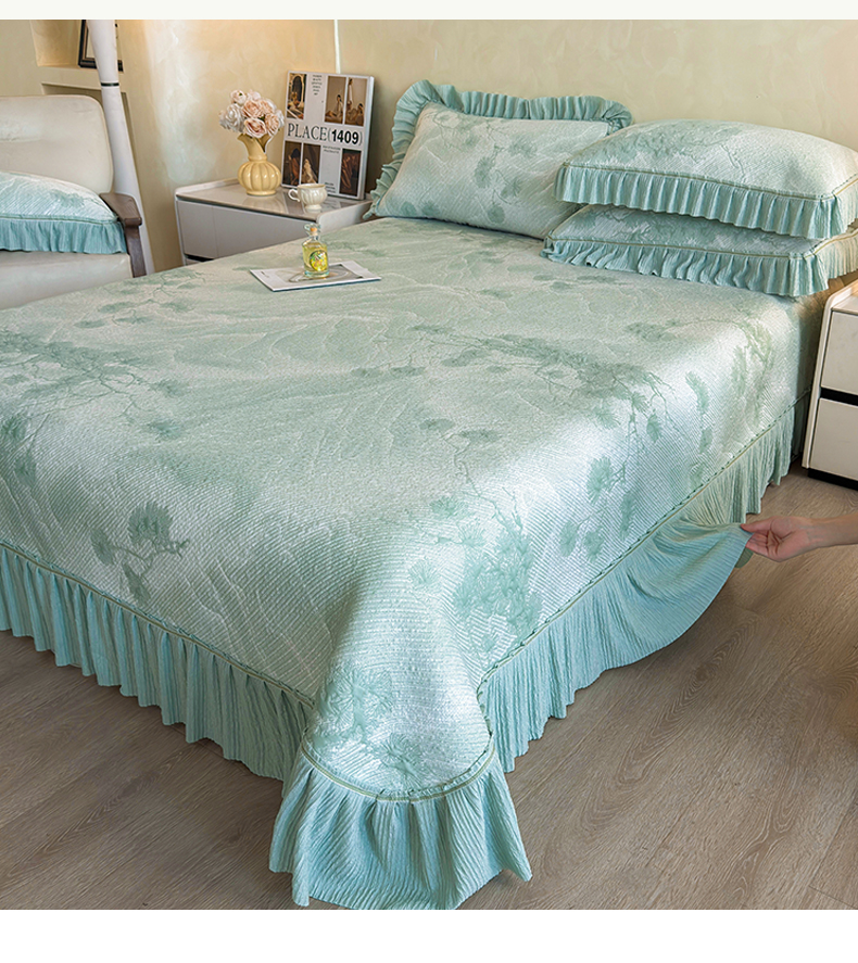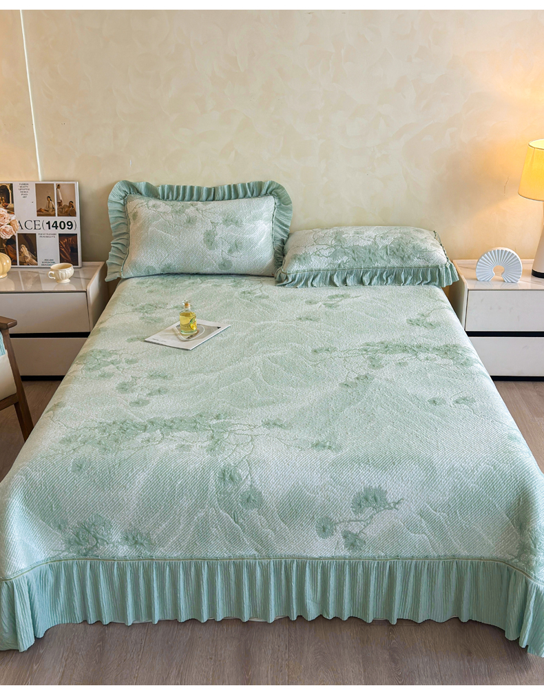 慕木家纺 2026新款A类乙纶双面提花560克冰豆豆花边床盖款床裙迎客松系列(提供买家秀) 迎客松-绿