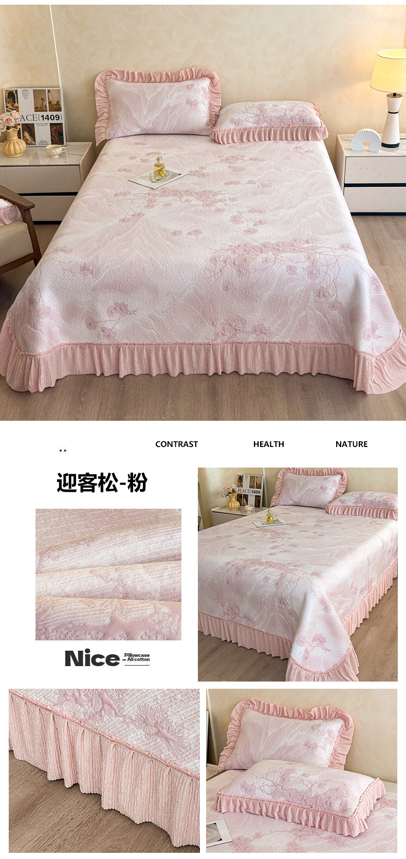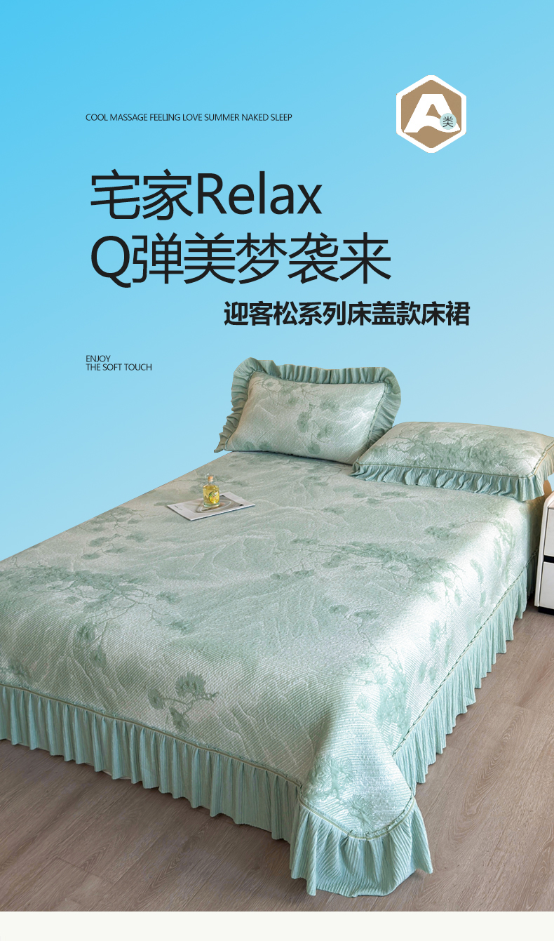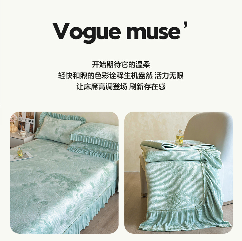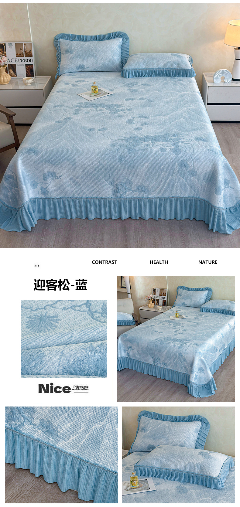 (总)慕木家纺 2026新款A类乙纶双面提花560克冰豆豆花边床盖款床裙迎客松系列(提供买家秀),迎客松-蓝,迎客松-绿,迎客松-粉,迎客松-灰