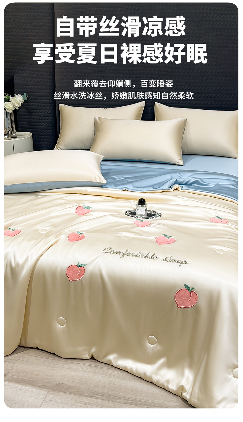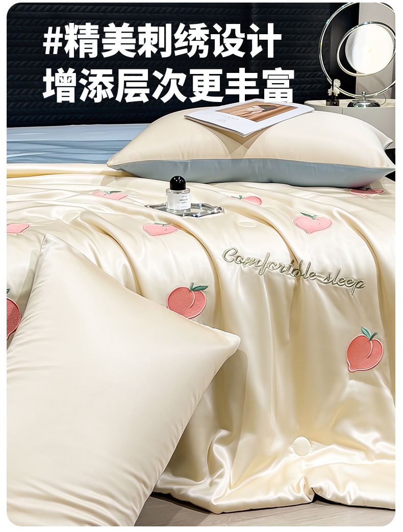 • 91家纺网 家纺一手货源 找家纺 爱彼家纺 2026夏季新款水洗冰丝轻奢刺绣凉感夏被夏凉被空调被 桃子-奶白蓝