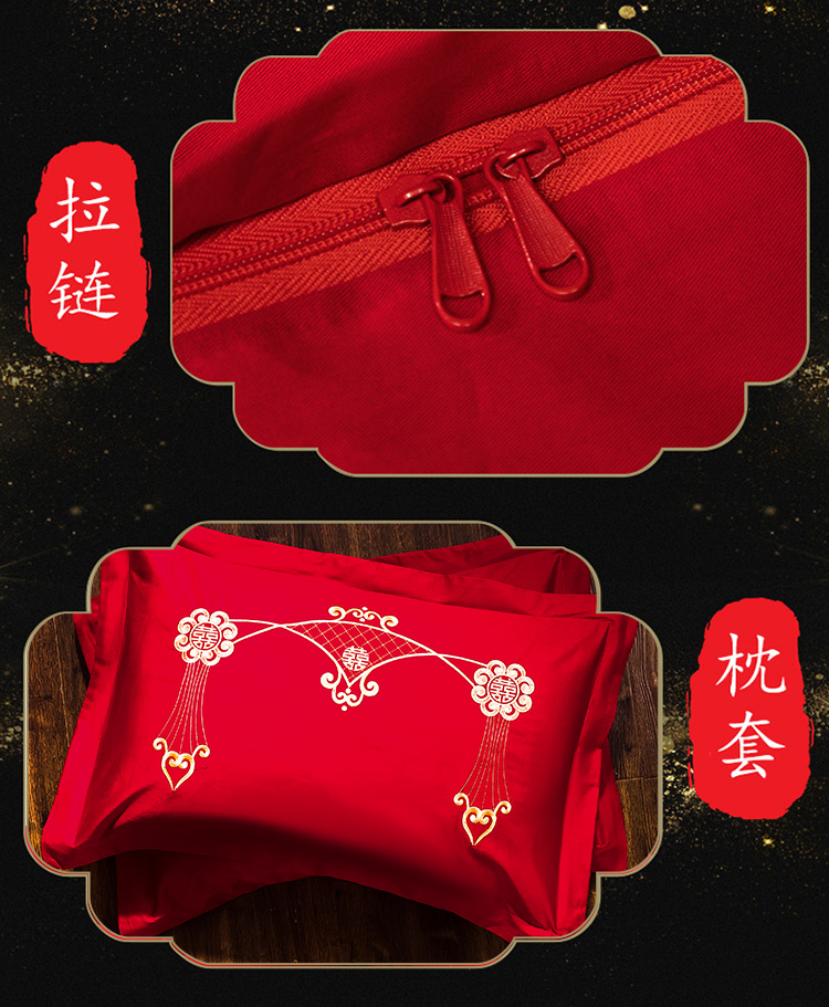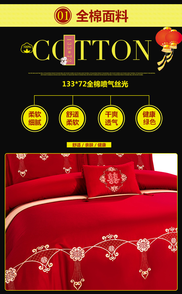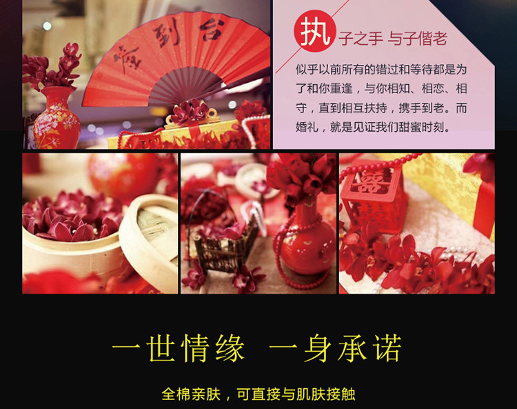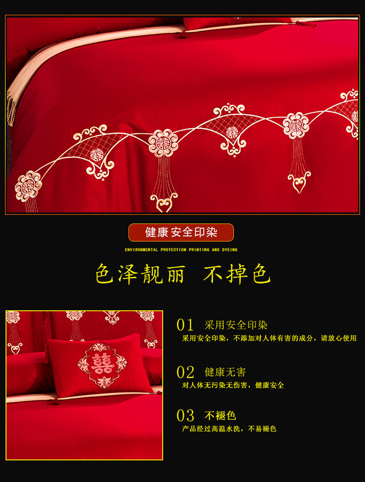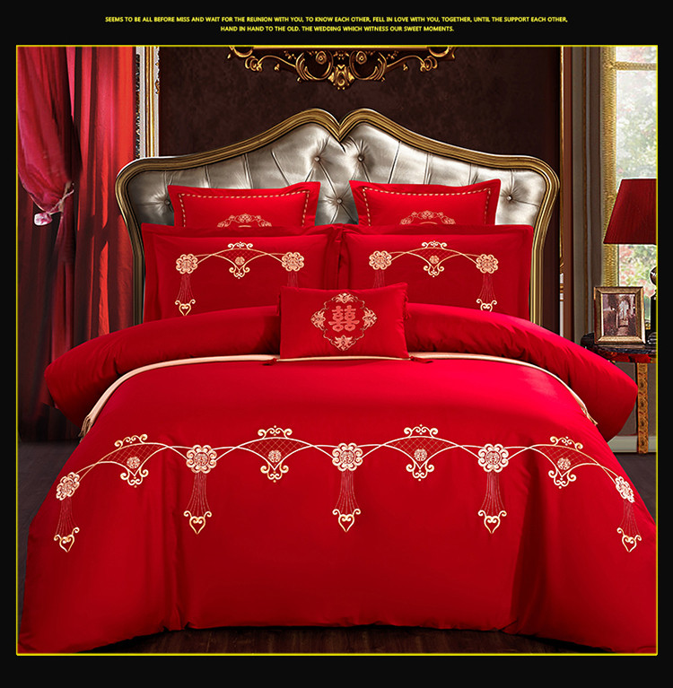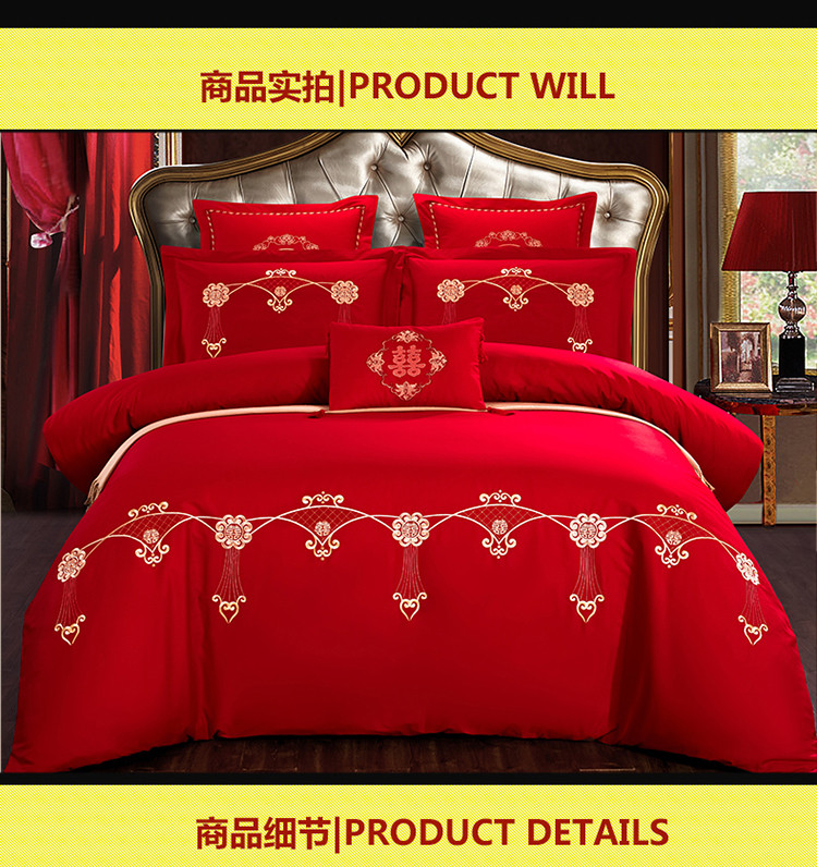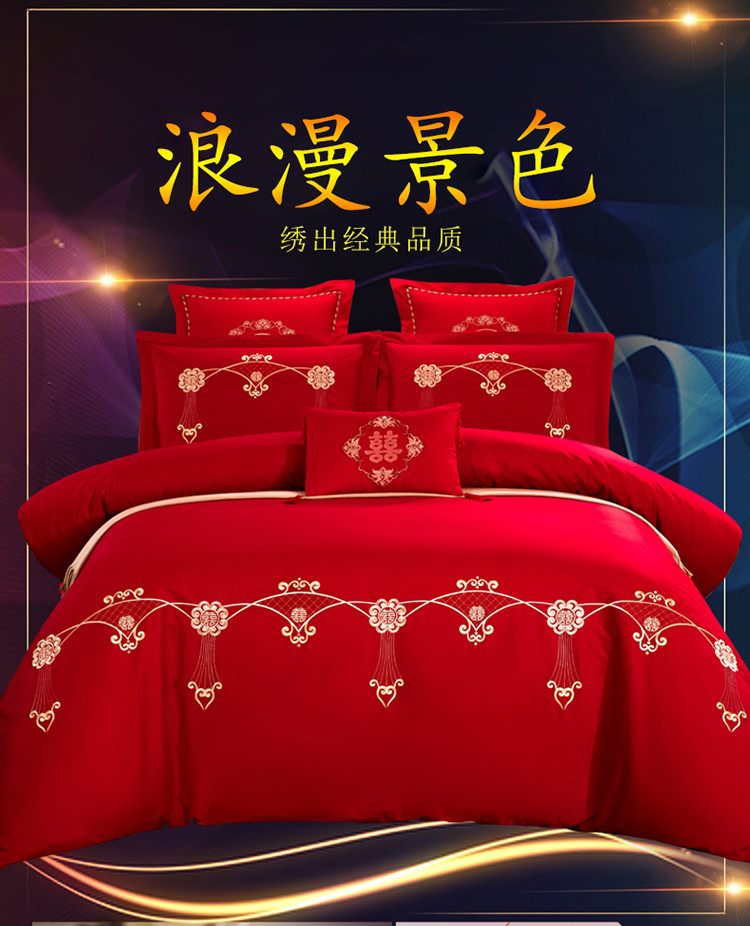 商品名称:慕她家纺 简约婚庆四件套大红色刺绣全棉纯棉六多件套浪漫景色