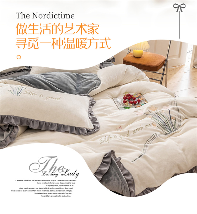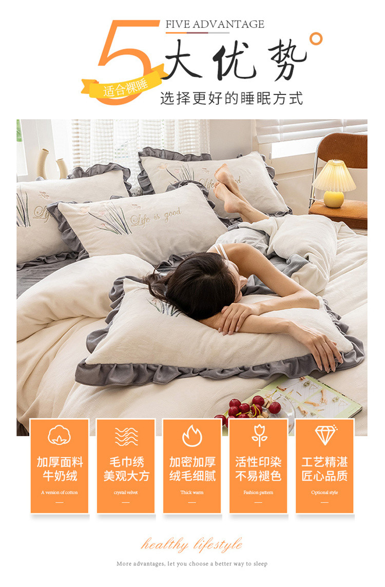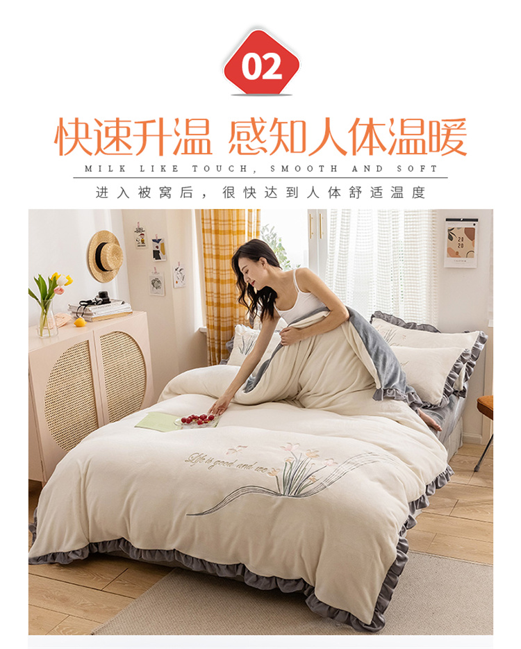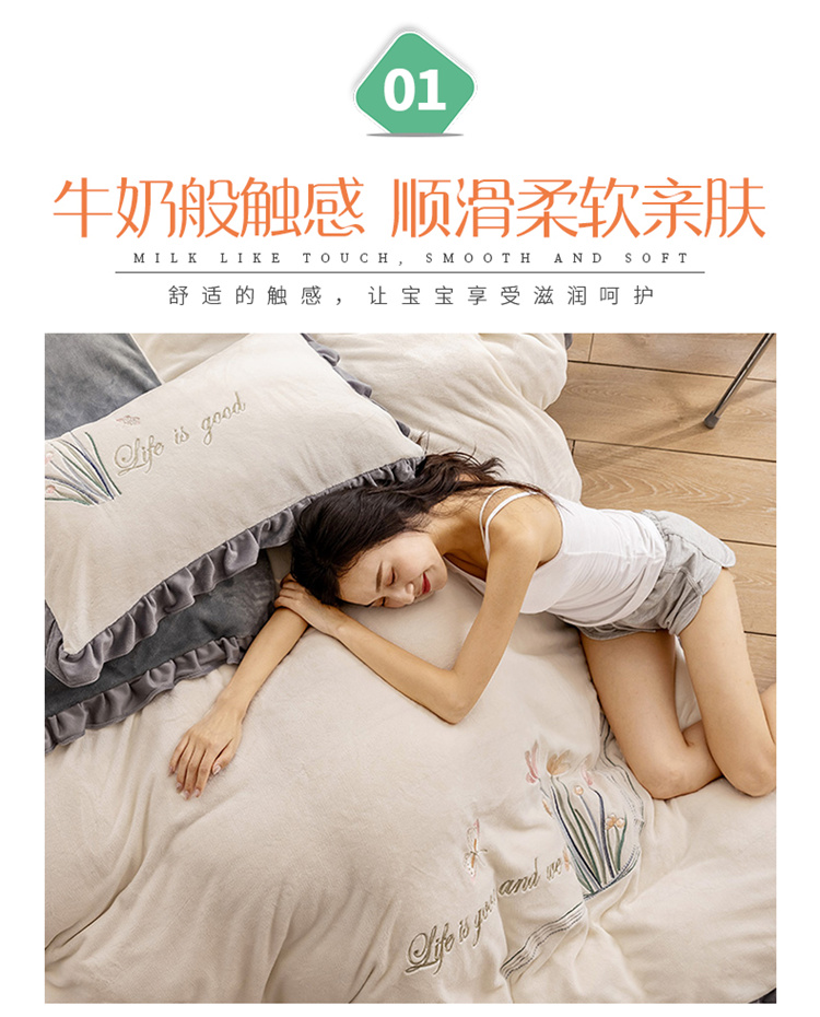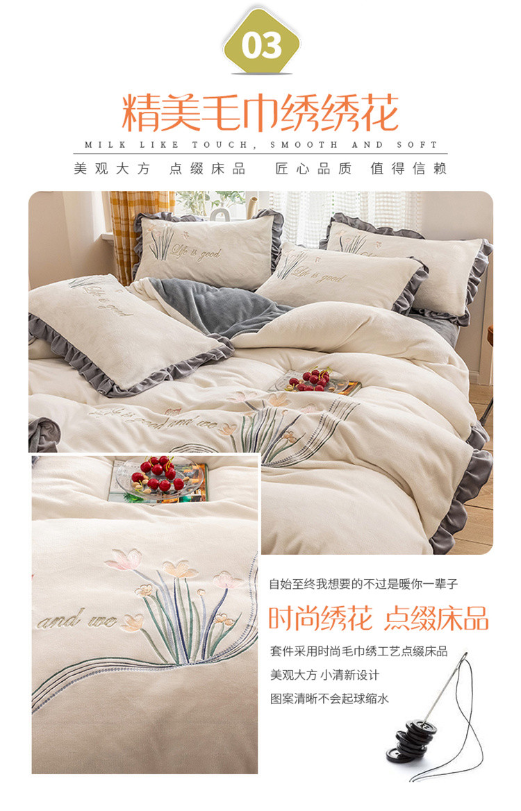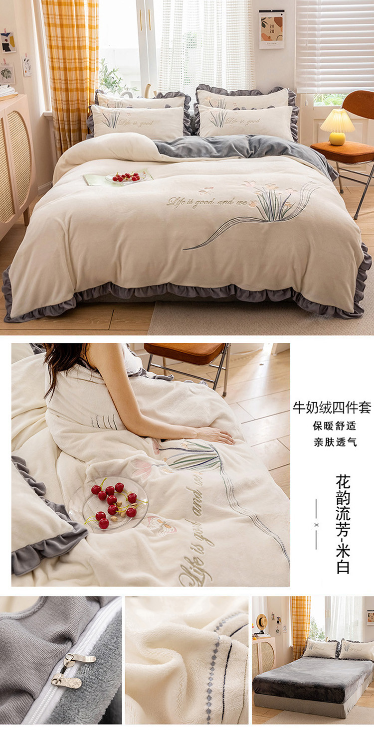雅萱 2022新款230g高克重纯色绣花牛奶绒四件套 花韵流芳-米白