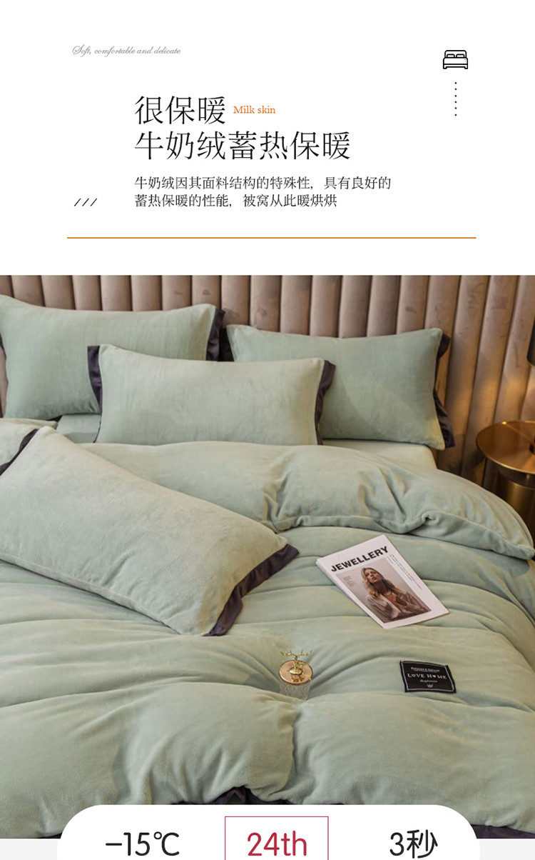 商品名称:大米家居 新款高克重宽边牛奶宝宝绒法莱亲肤绒四件套荣耀薄荷绿