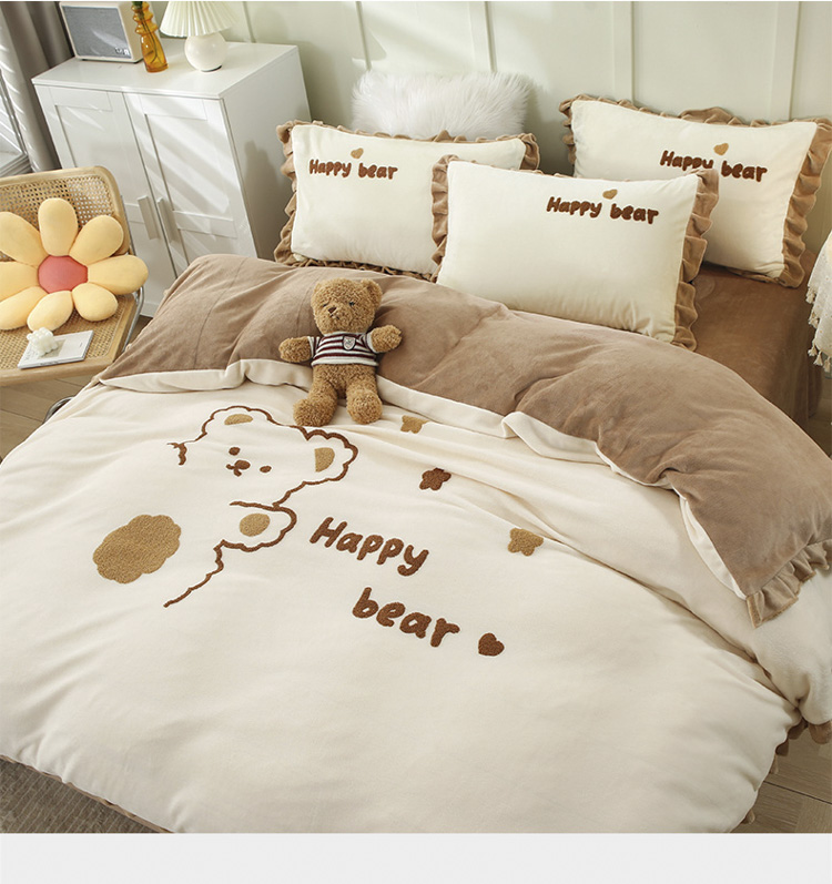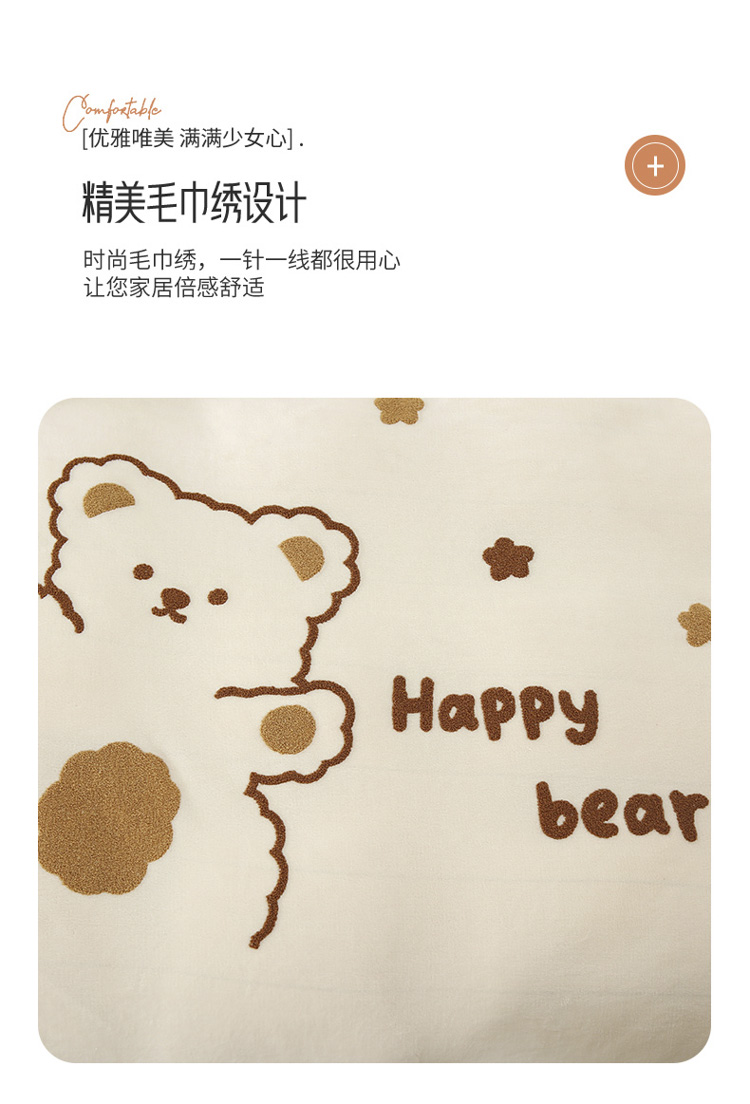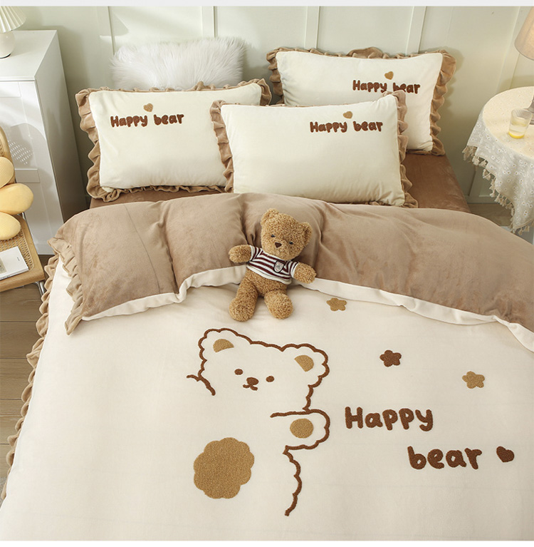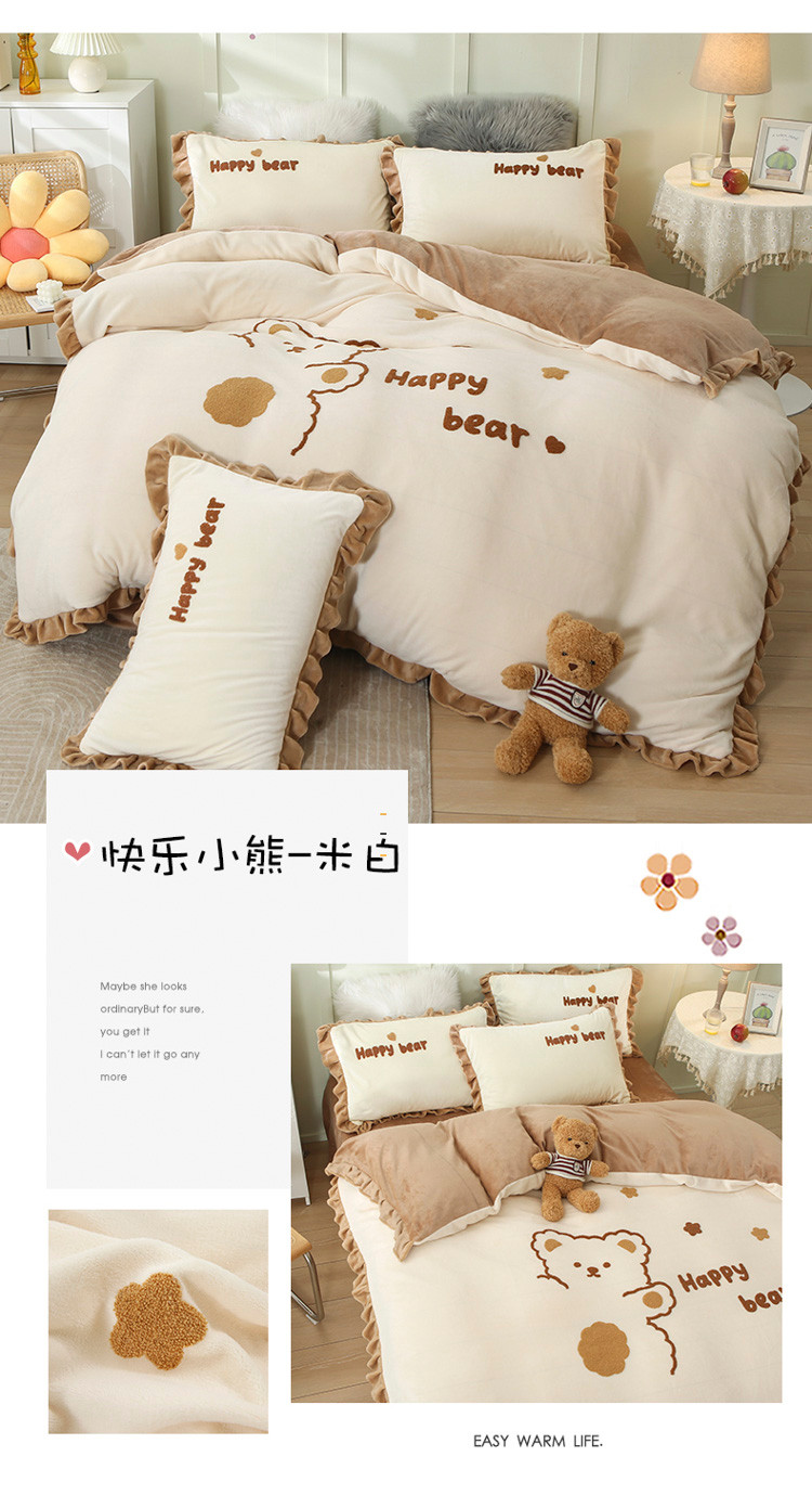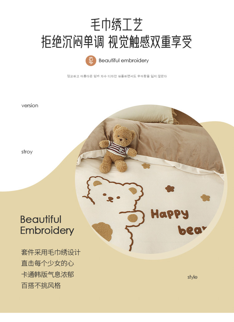 沐辰 2021新款韩版毛巾绣加厚牛奶绒四件套 快乐小熊-米白