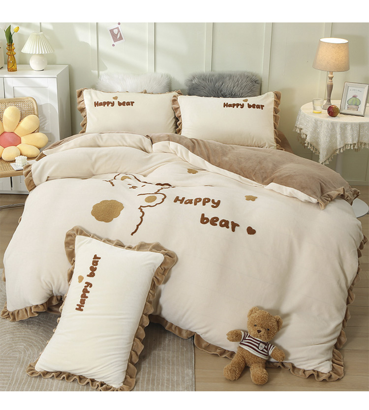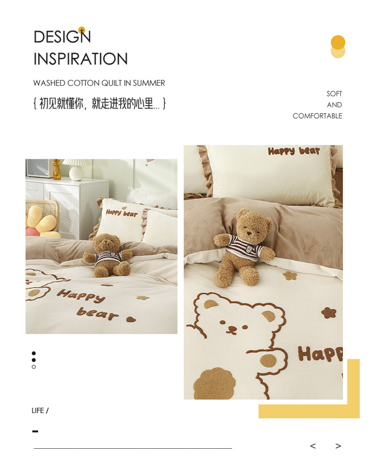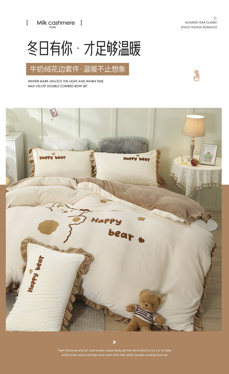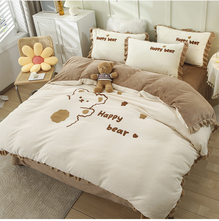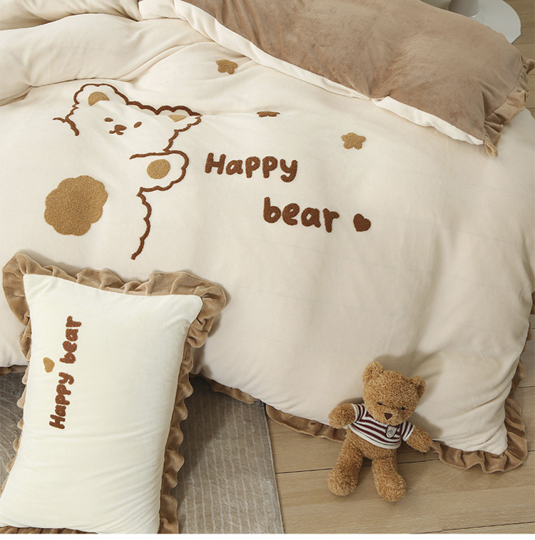 沐辰 2021新款韩版毛巾绣加厚牛奶绒四件套 快乐小熊-米白