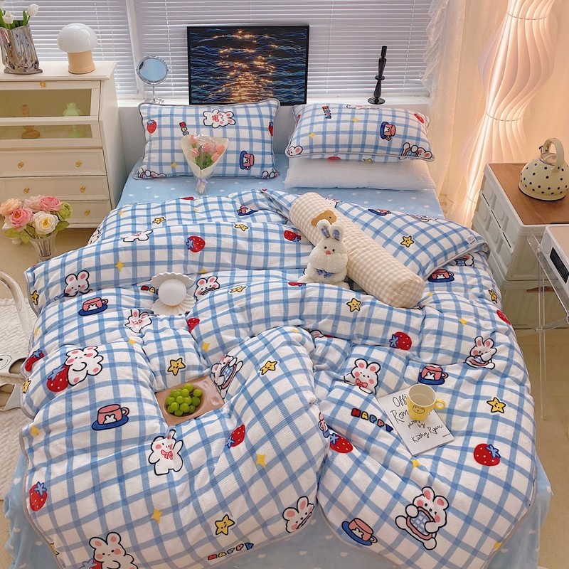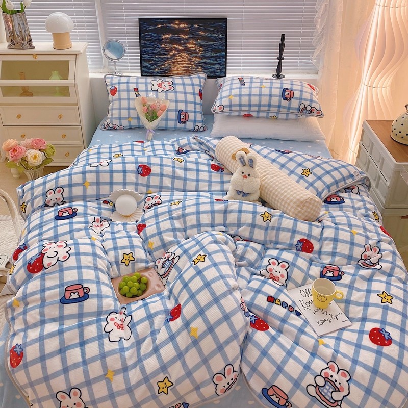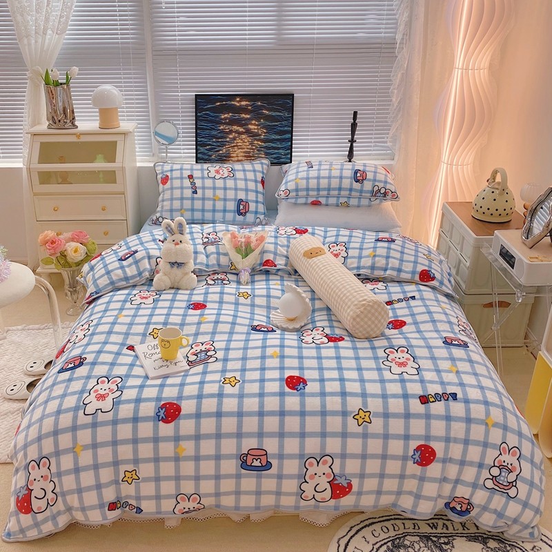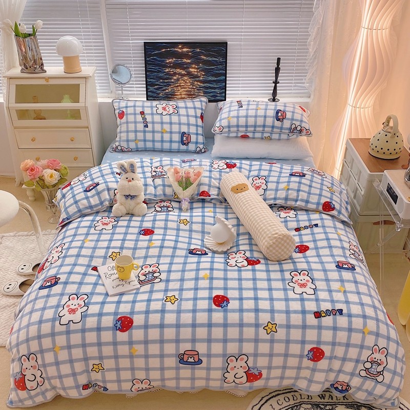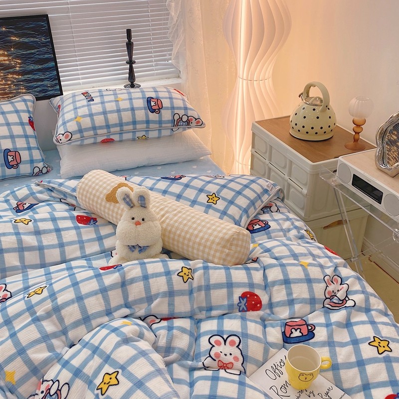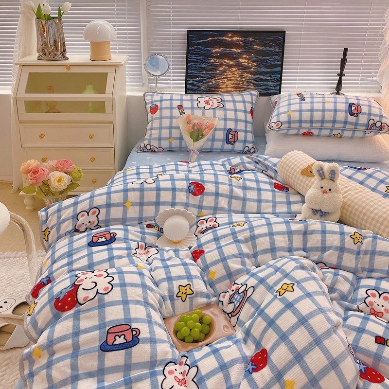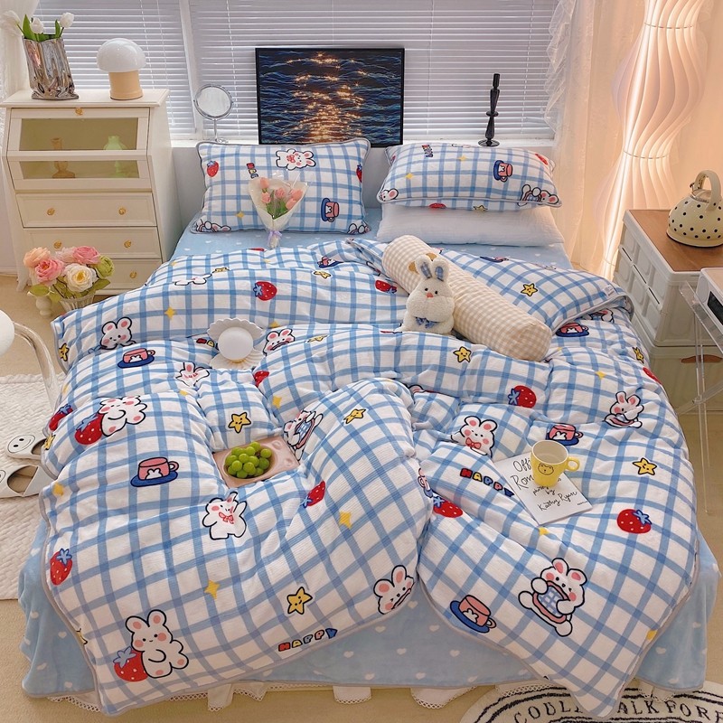 顾里家纺2021新款ins韩国高端保暖牛奶绒四件套蓝格小兔