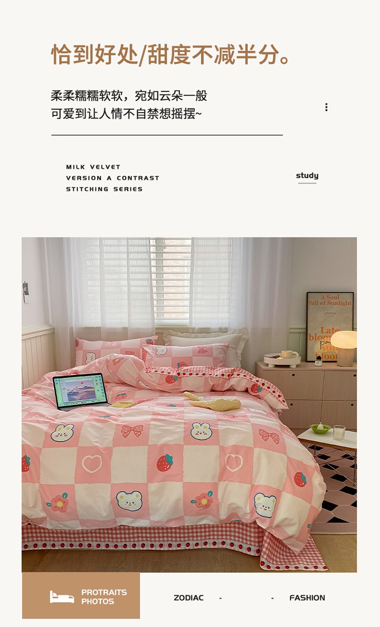 (总)雅居纺家纺 2025新款高克重牛奶绒印花四件套,M粉,爱心恐龙,粉粉桃,粉色竖条,乖乖兔,蝴蝶结-粉,蝴蝶结-蓝,幻境-粉,简约绿条,经典豹纹,咖色竖条,开心龙,蓝墨花朵,蓝色竖条,蓝色小兔,蓝条猫咪,浪漫花香,秘境小兔,时尚爱心,树叶小兔子,竖条小花,四宫格,仙草,小煤球,幸运兔,休闲小兔,宇航熊