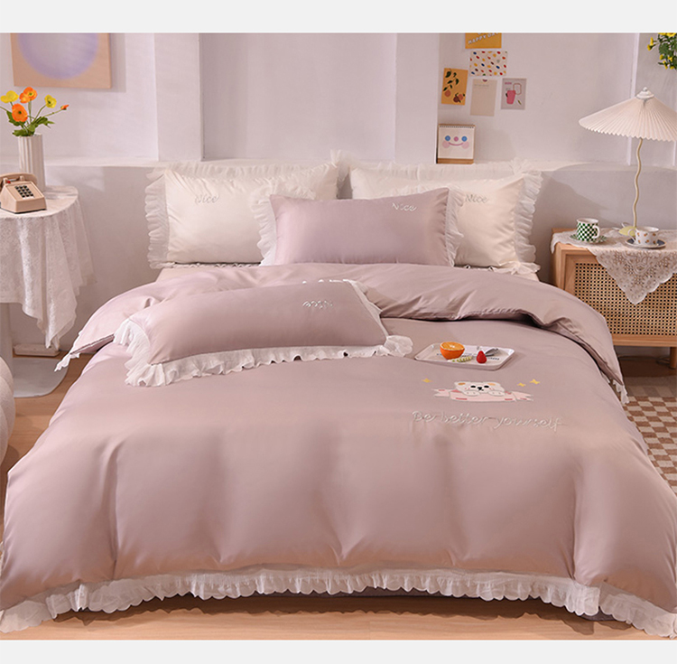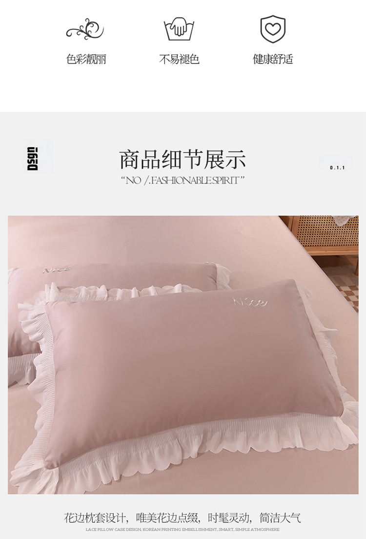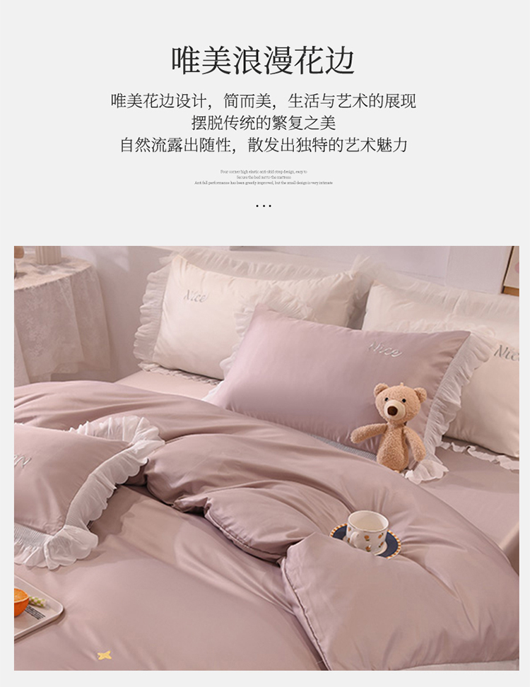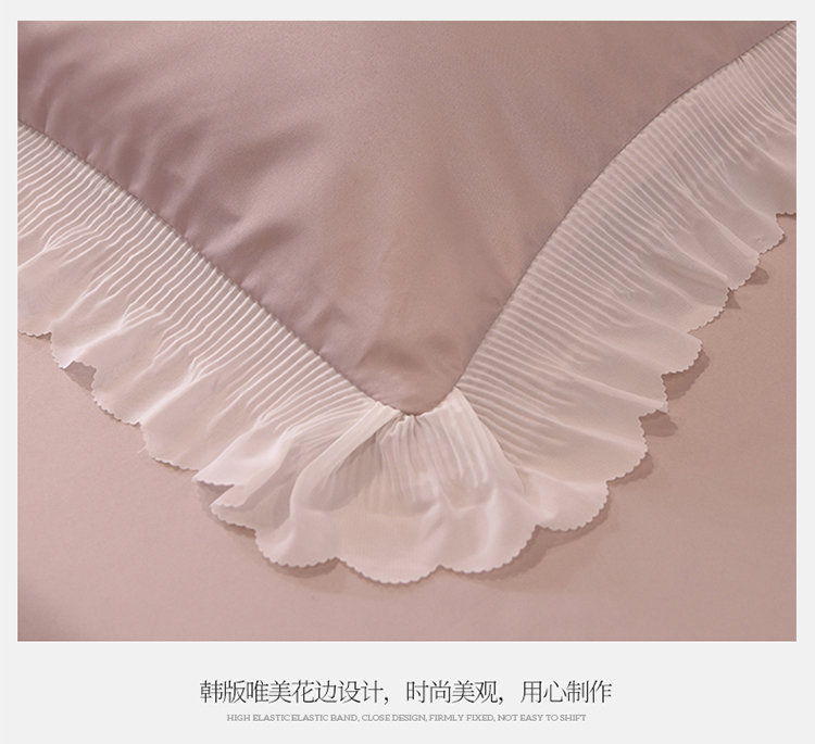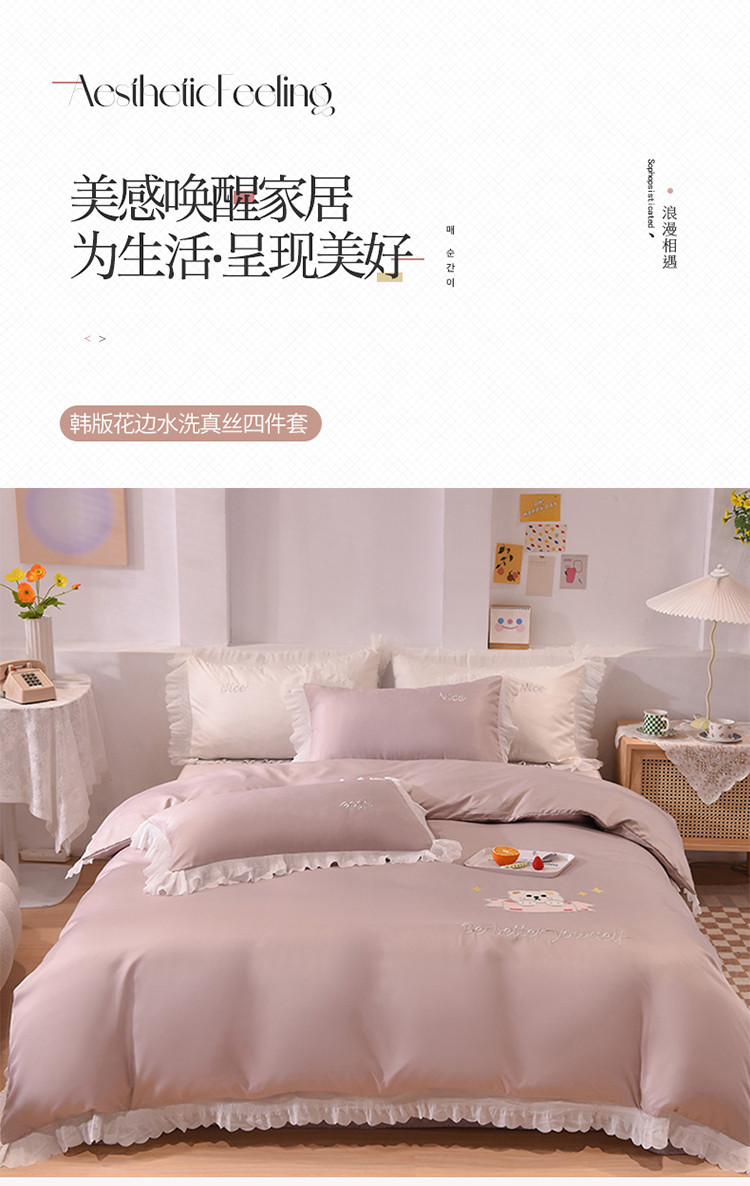 艾米家居 2025新款韩版双层花边轻奢浮雕系列水洗冰丝四件套 豆沙花边,豆沙花边