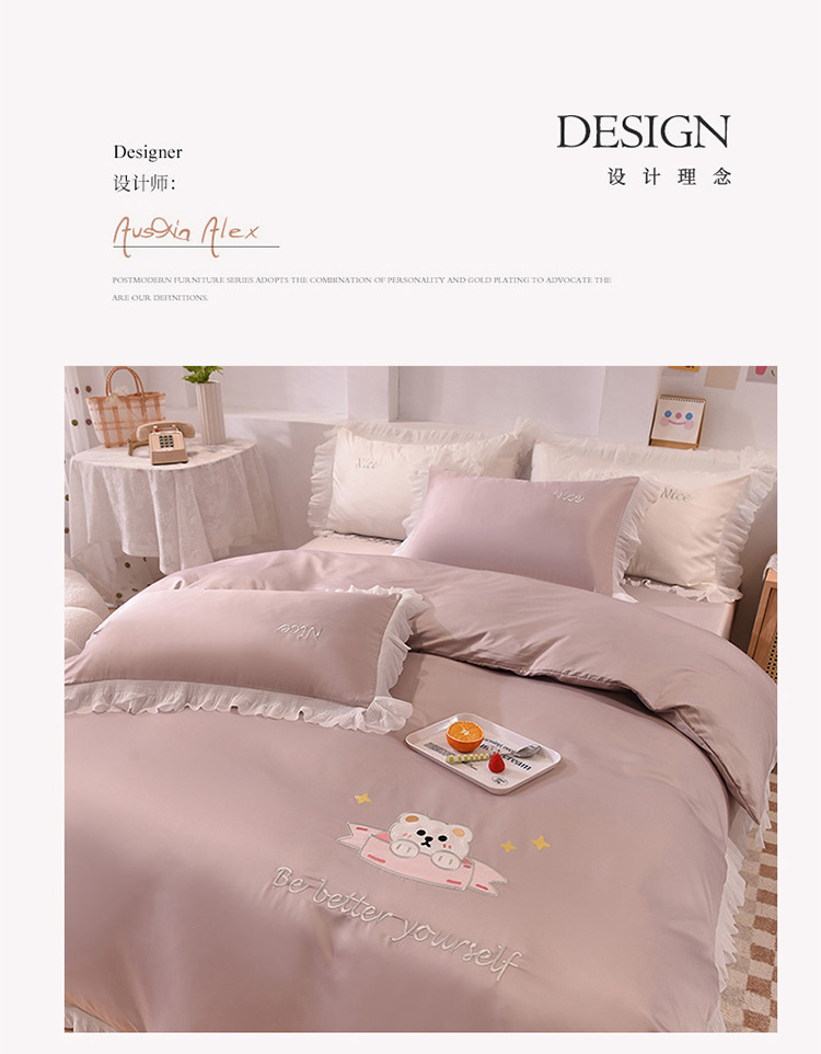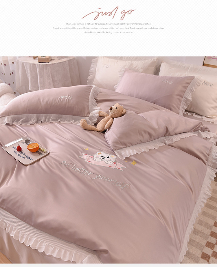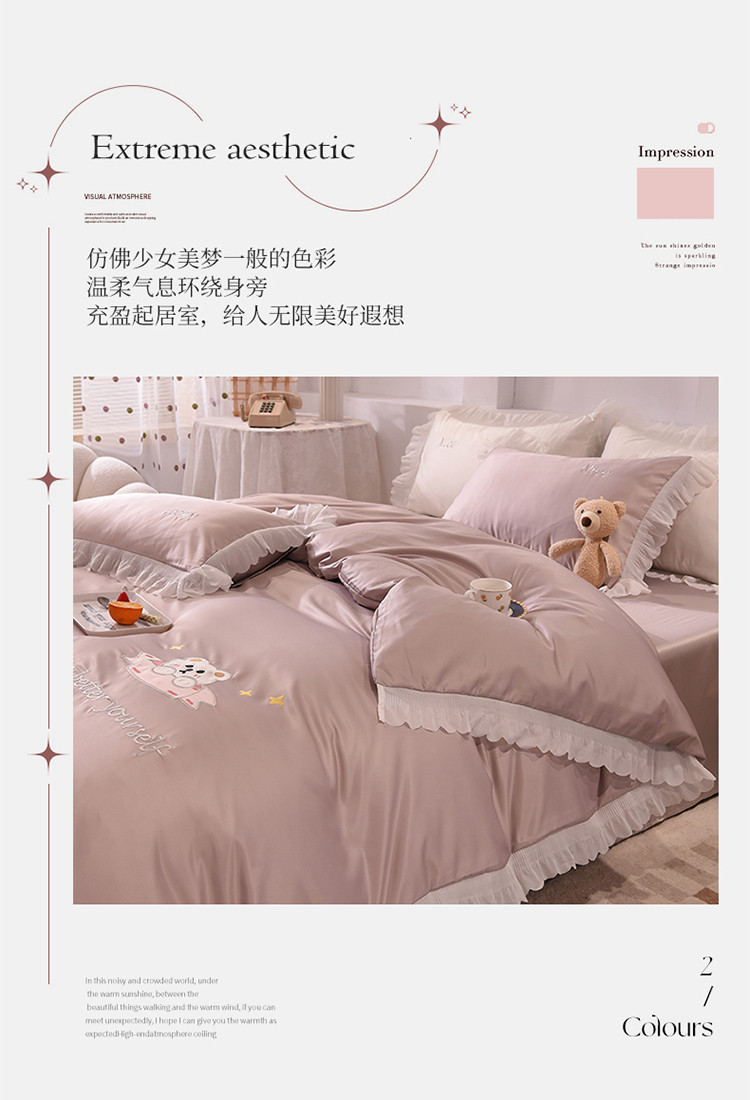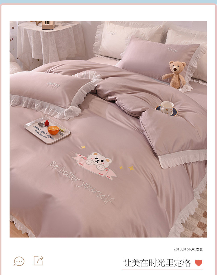 总艾米家居2025新款水洗真丝雪纺花边贴布绣四件套-达菲小熊,白色,薄荷绿,宾利蓝,淡粉,豆沙,鹅黄,灰色,天蓝,香槟,玉色