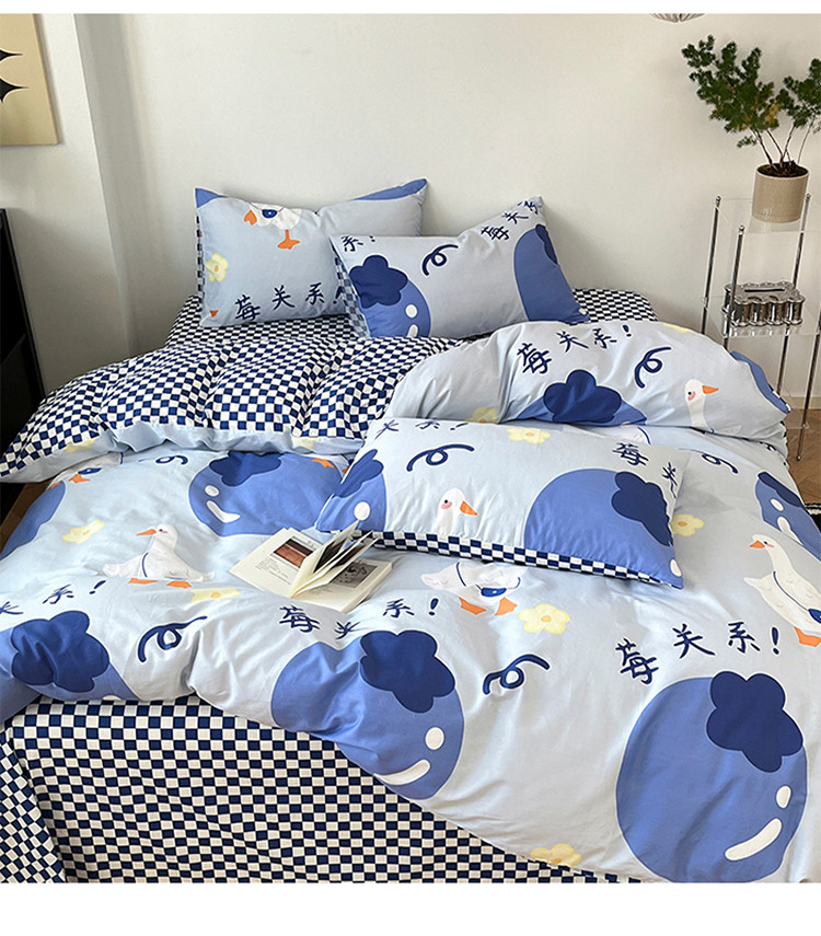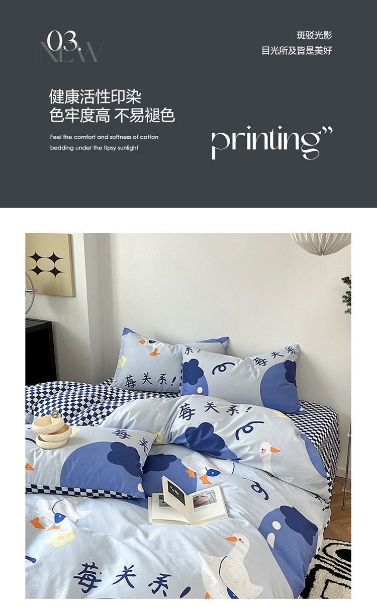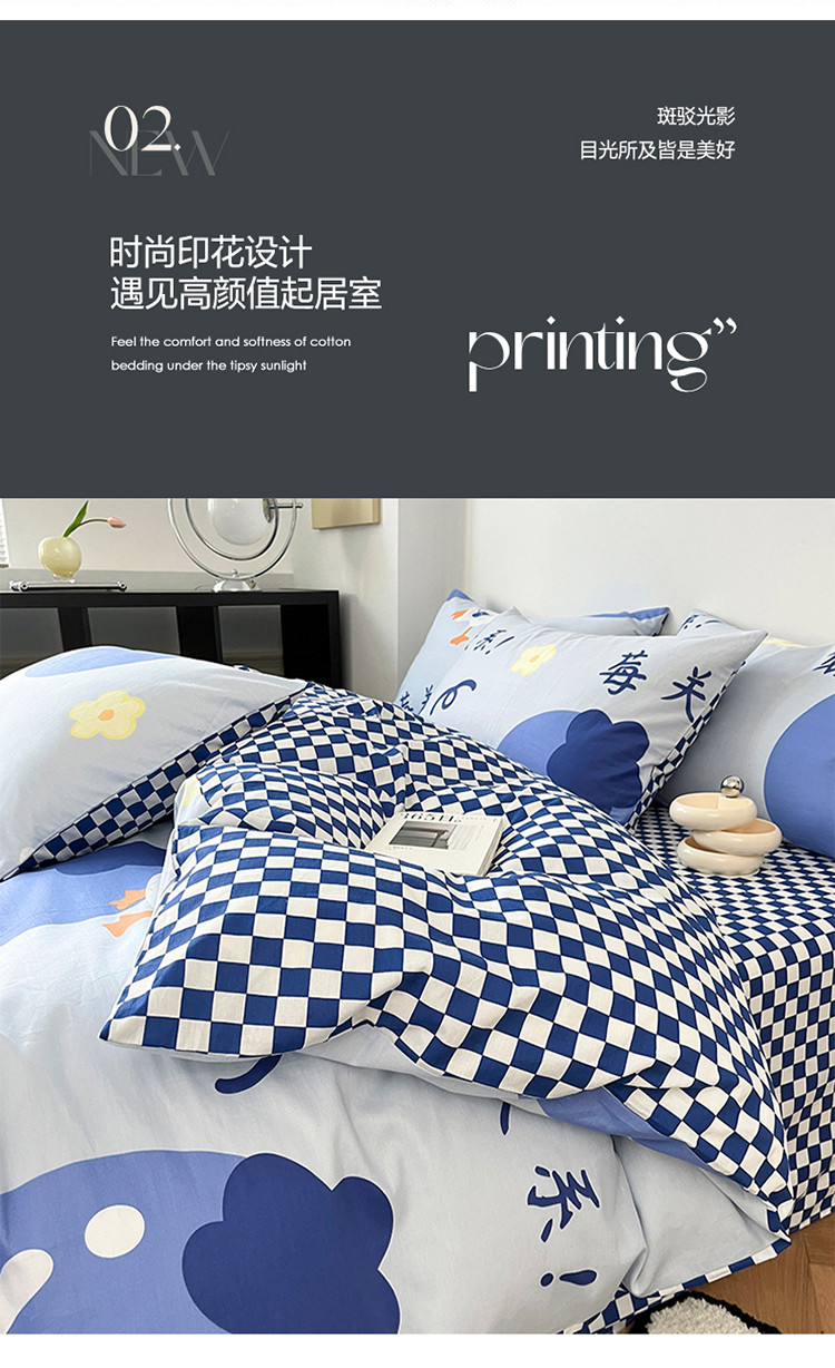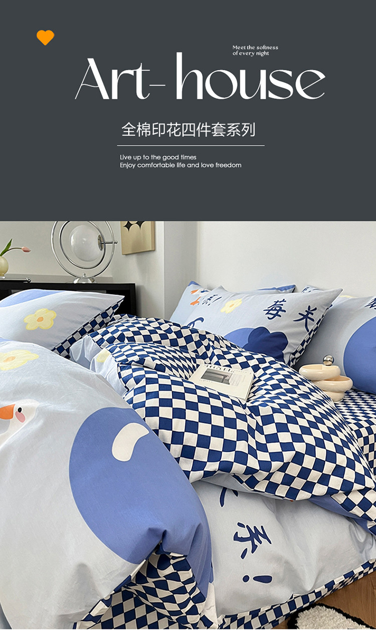 (总)雅居纺家纺 2022新款13070全棉印花四件套,草莓蝴蝶结,俄罗斯方块,黑白蝴蝶结,很嗨兔,可爱小兔,快乐花海,牛奶纹,胖胖鸭,棋盘格,日月争辉,西部恐龙,小情调,小桃桃