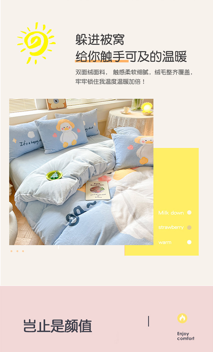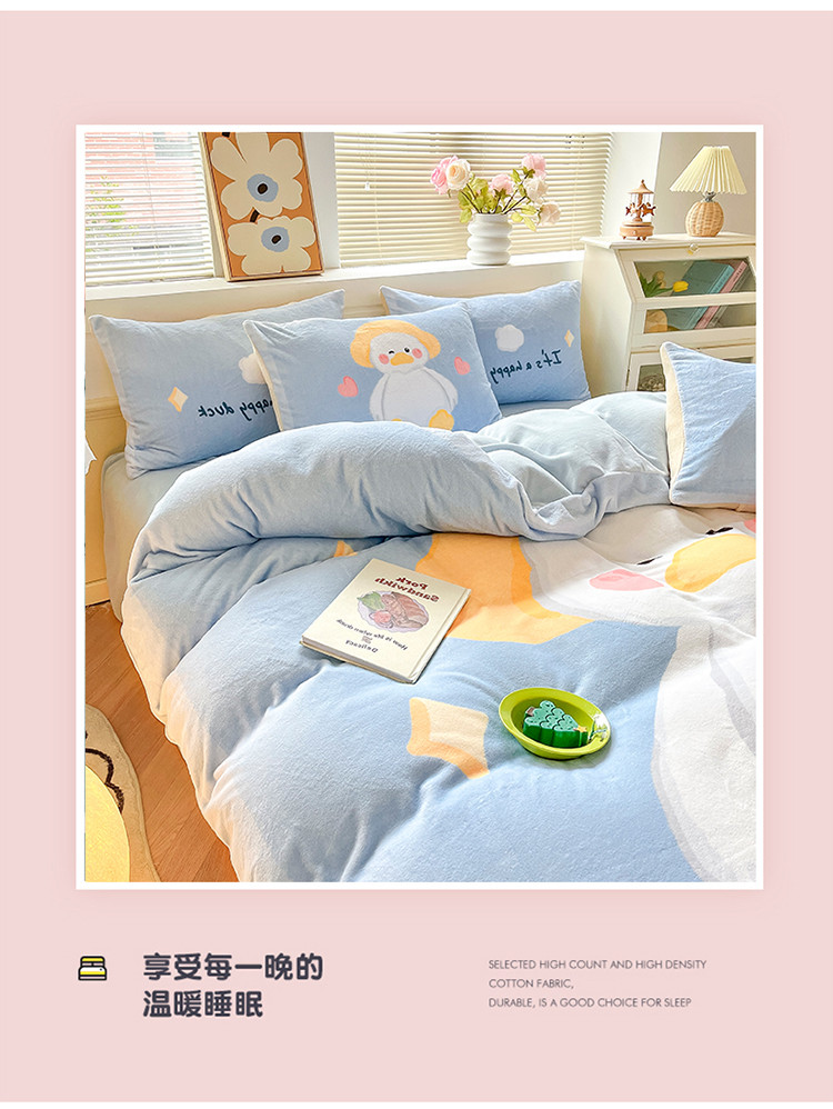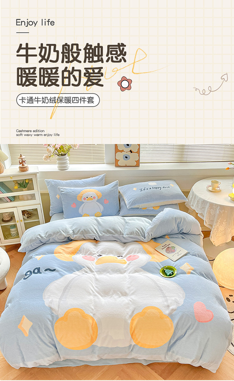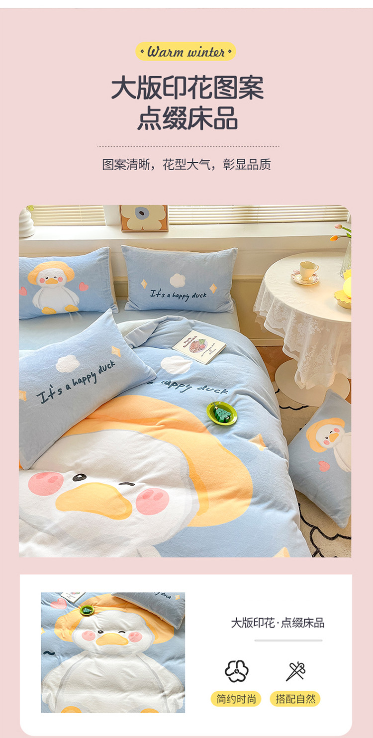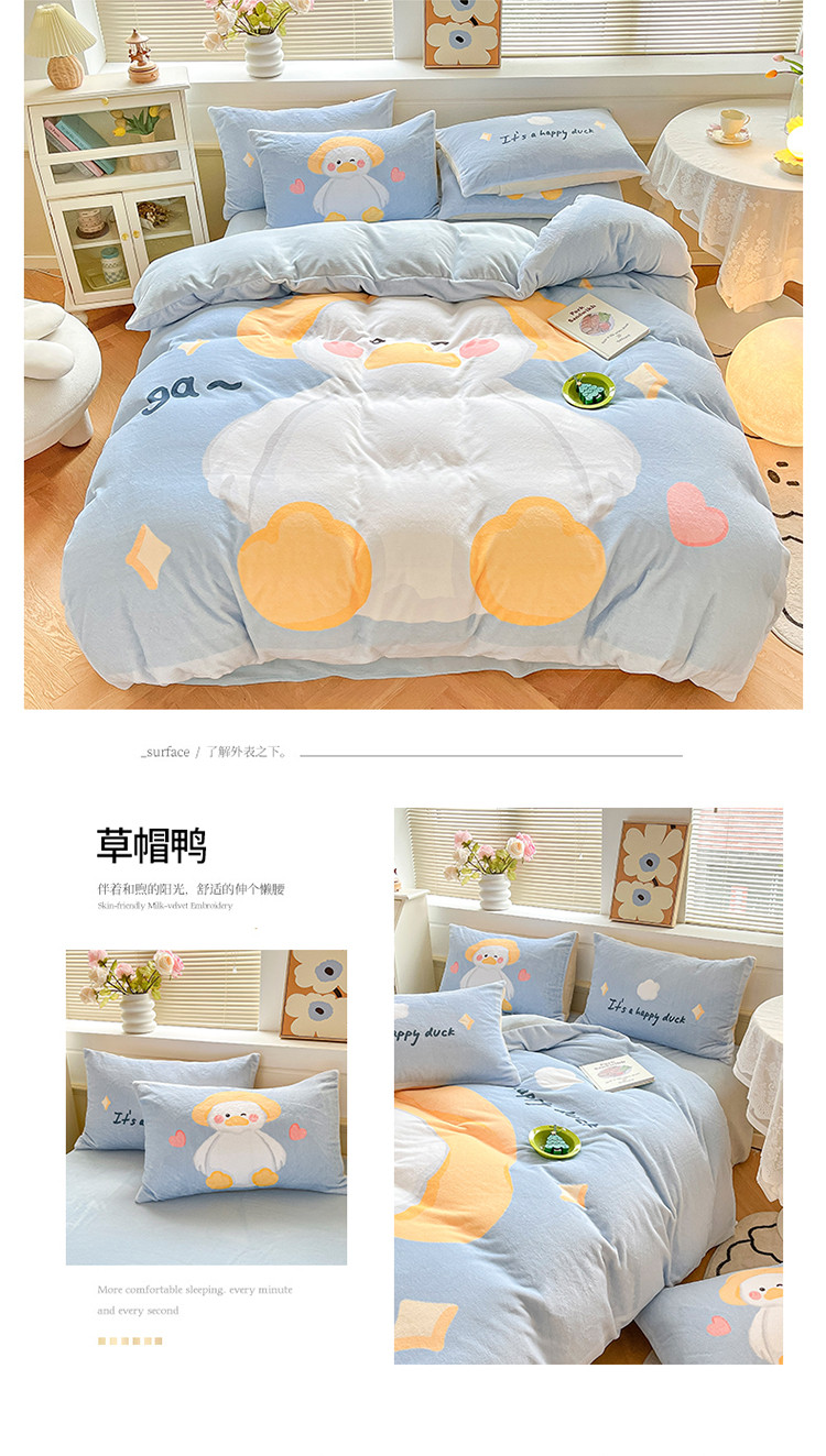 川悦生活 2022新款大版牛奶绒卡通工艺款四件套 草帽鸭