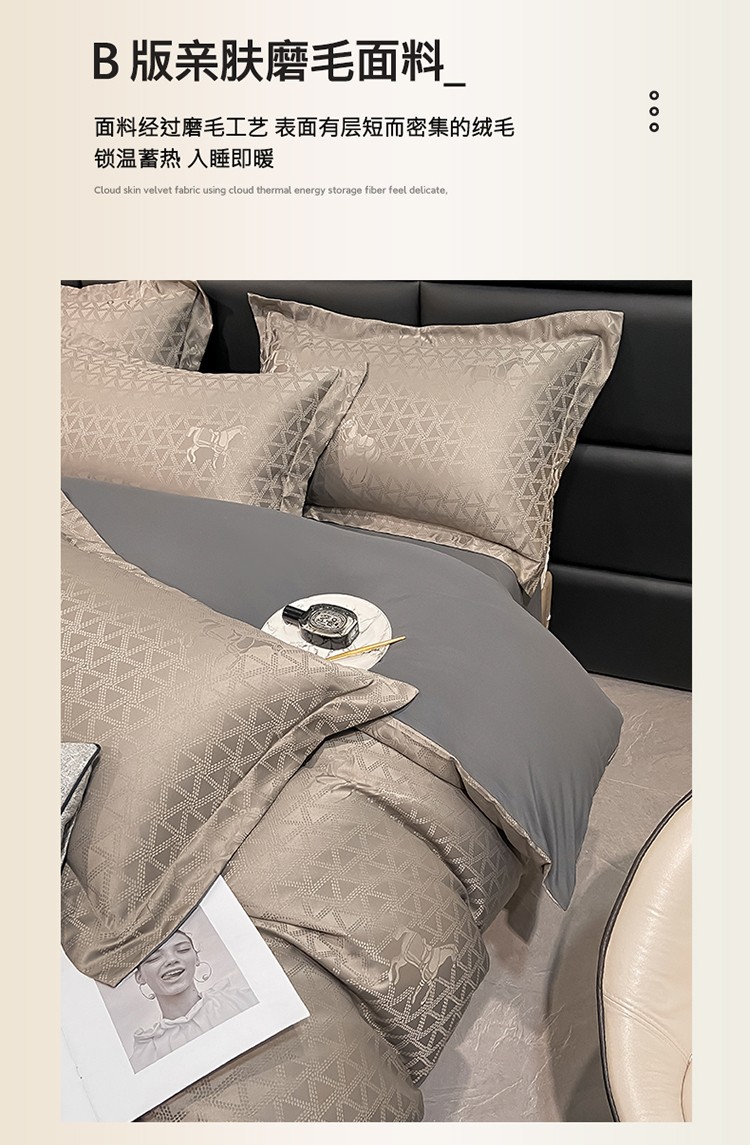 (总)遇见家居生活馆 2025新款A类牛奶绒雕花四件套-羽飞舞,卡诺粉+香槟,奶芋色+经典灰,奶芋色+杏仁,香草灰+经典灰,婴儿蓝+星辰灰