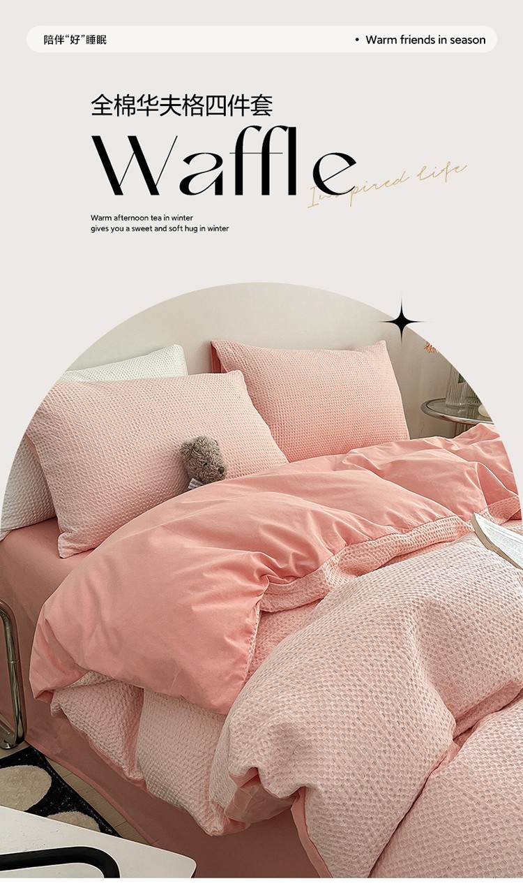 雅居纺 2023新款全棉华夫格四件套 华夫格柔粉