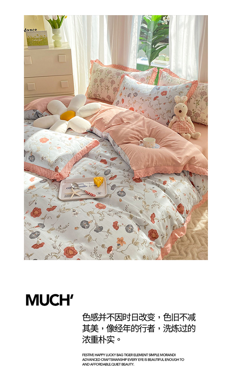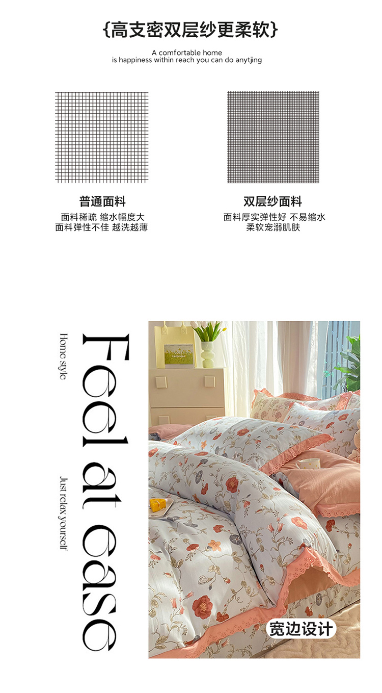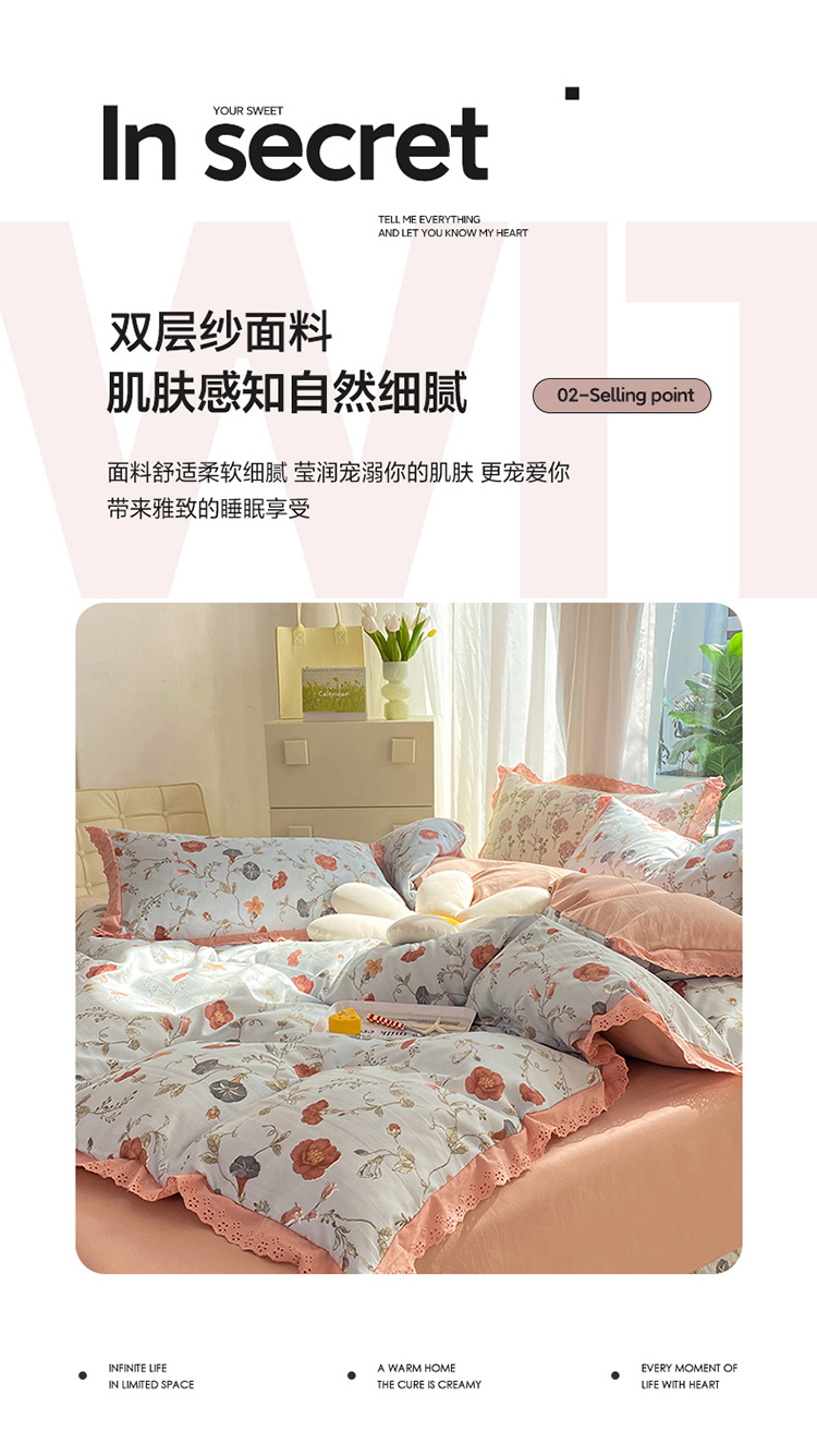 艾米家居 2025新款韩版双层花边轻奢浮雕系列水洗冰丝四件套 豆沙花边,豆沙花边