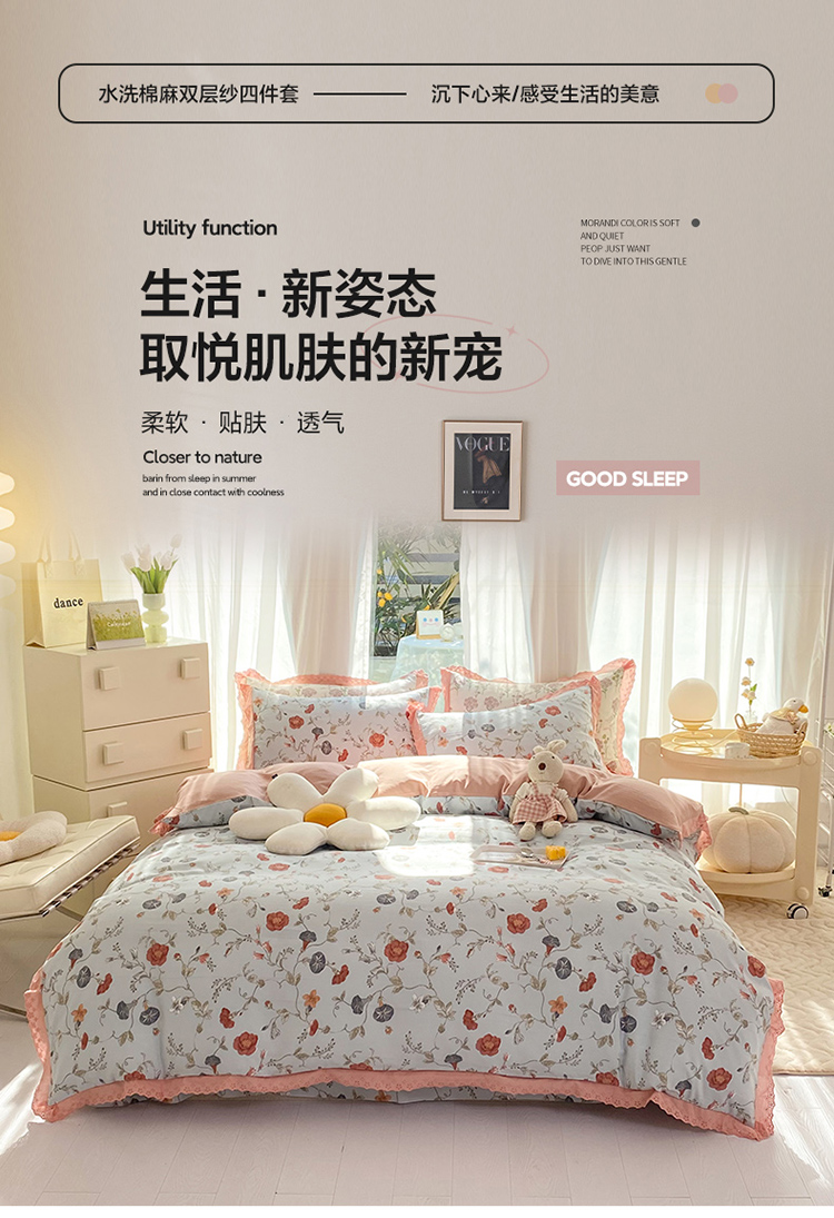 (总)艾米 2023新款水洗棉麻双层纱系列四件套,暗香,饼干熊,菠萝兔,沉香,繁花,芳华,花海,花满夫橘色,快乐熊,流年,梦萝,千寻,牵牛花豆沙,牵牛花蓝,水墨,四叶草,童趣乐园,薰衣草豆沙,薰衣草紫,月野