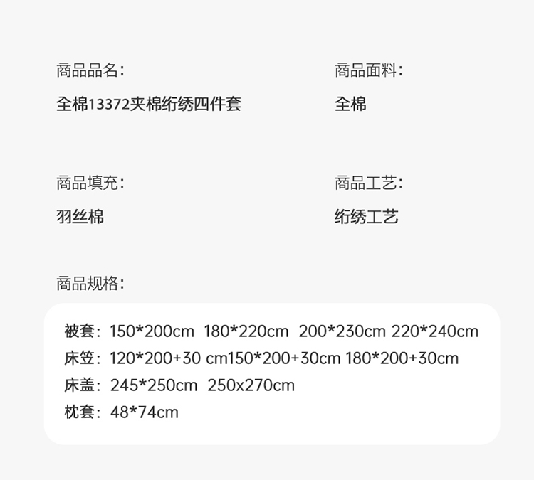 1.8m床盖款四件套(床盖245X250, 被套220X240) | ¥260.00 |