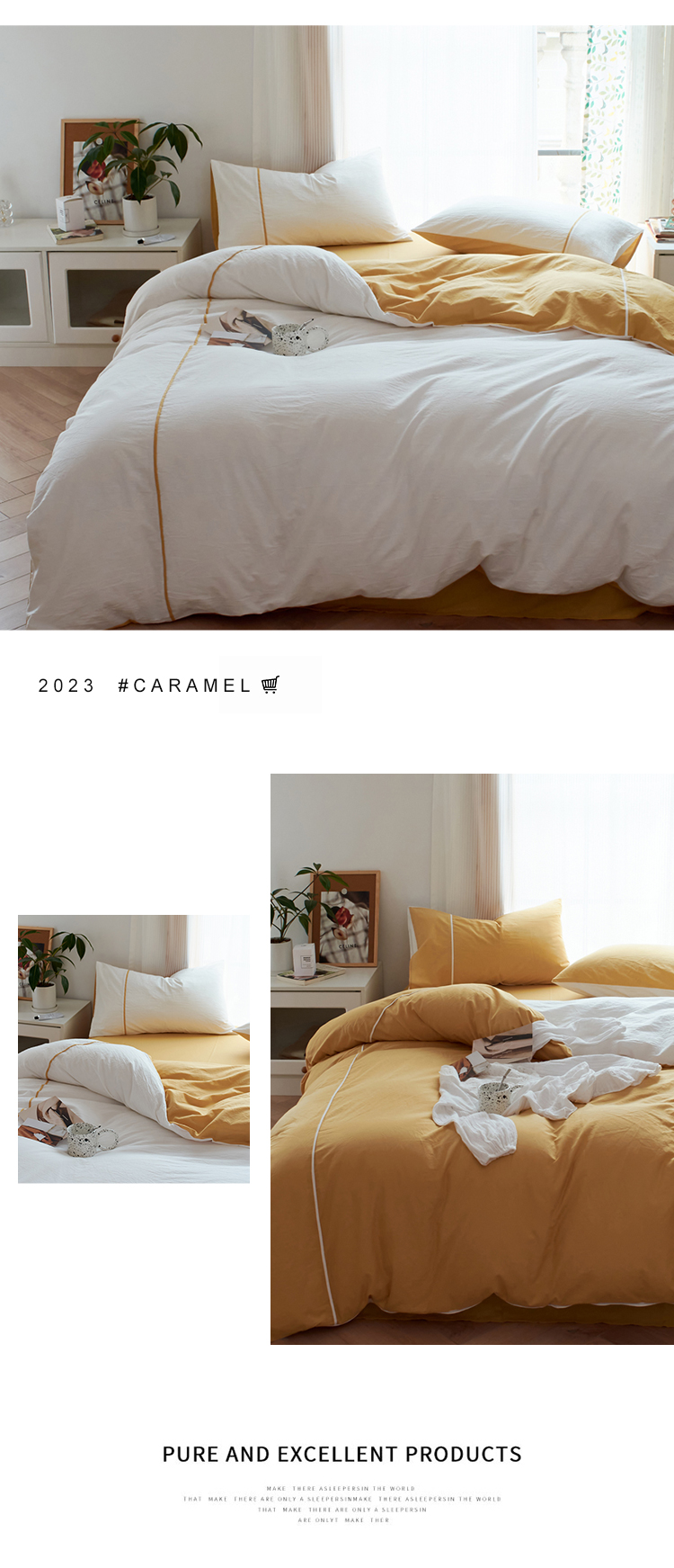 纯棉水洗棉四件套纯色简约全棉被套工艺款床单床笠学生直播爆款 嵌线-芒果