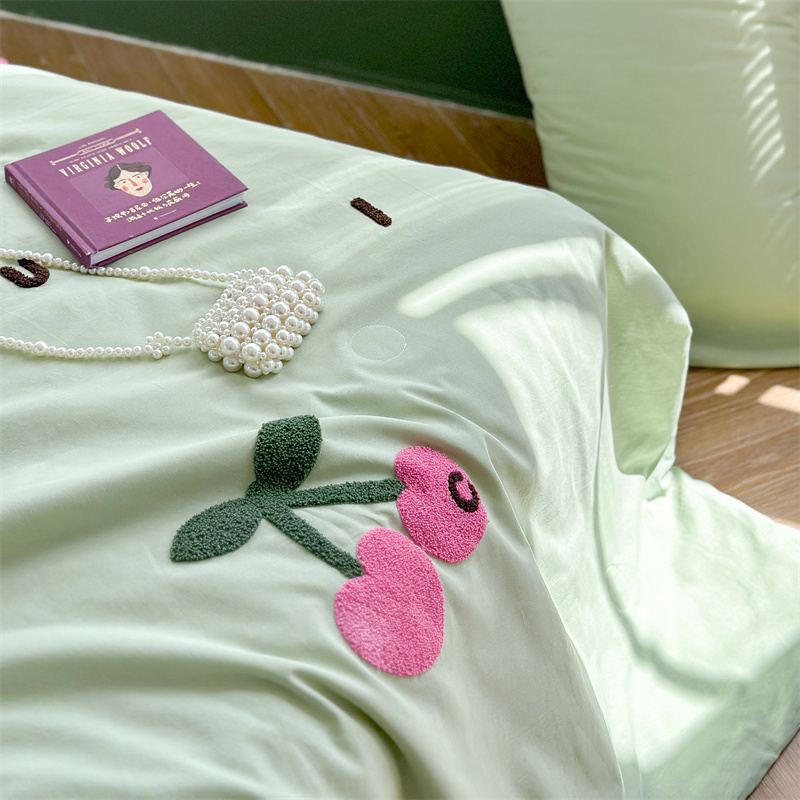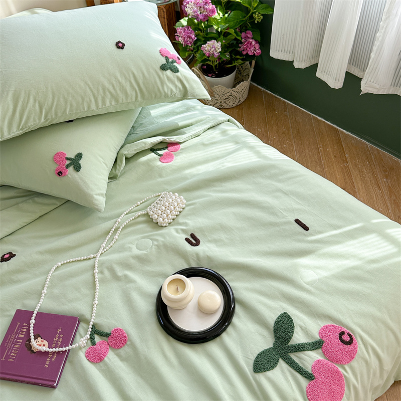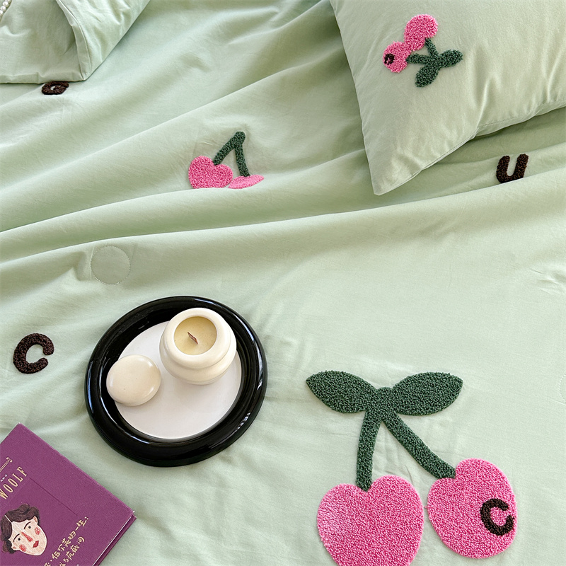 柚子YOUTH 2023新款马卡龙全棉水洗棉毛巾绣夏被四件套 红樱桃