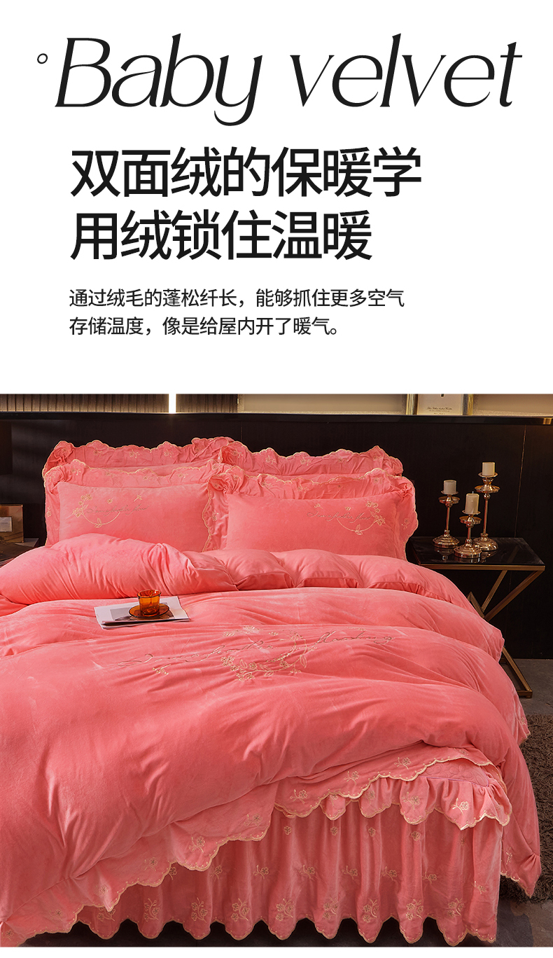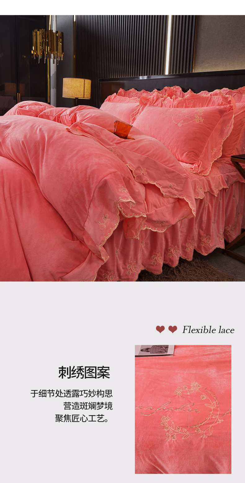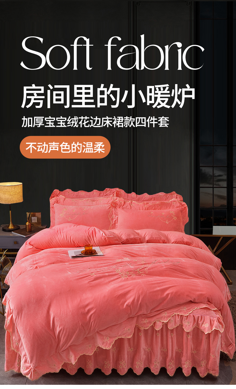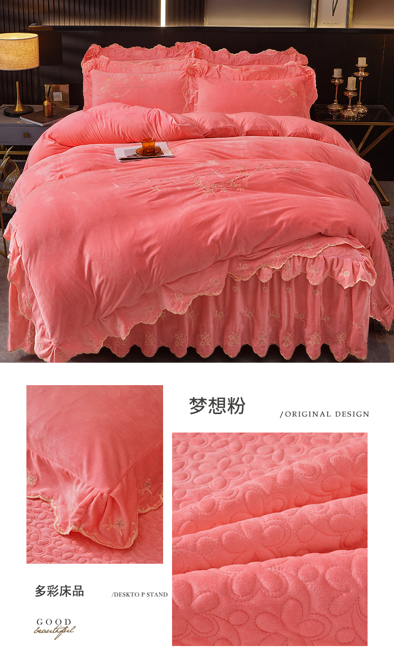 当前位置: 91家纺网 > 商品网购 > 床品套件 > 四件套 > 宝宝绒四件套 > 2023 恒爱家纺 花好月圆宝宝绒床裙四件套 梦想粉