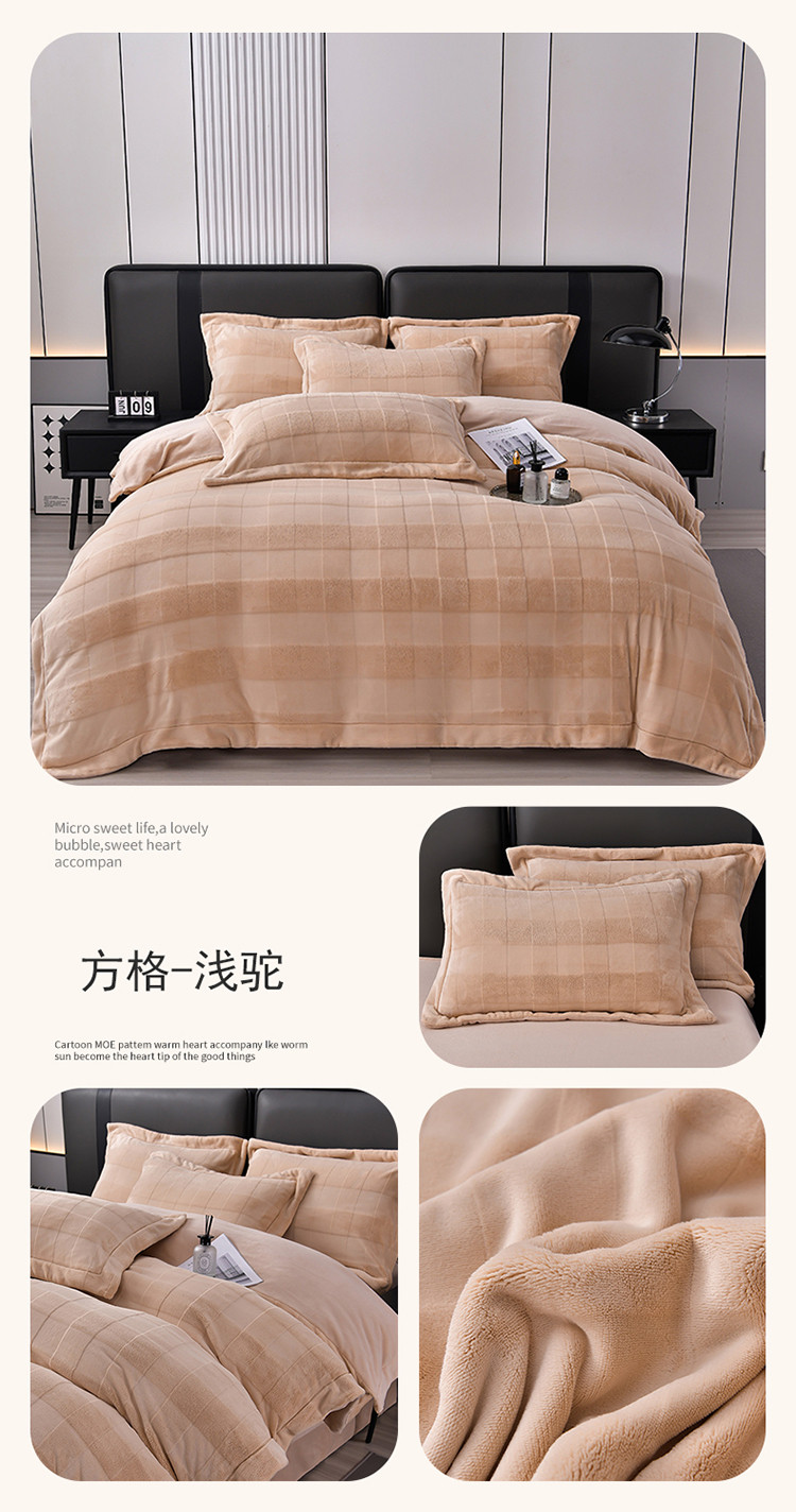 席之家 2023新款加厚保暖立体剪花方格兔毛绒四件套-简爱款方格-浅驼