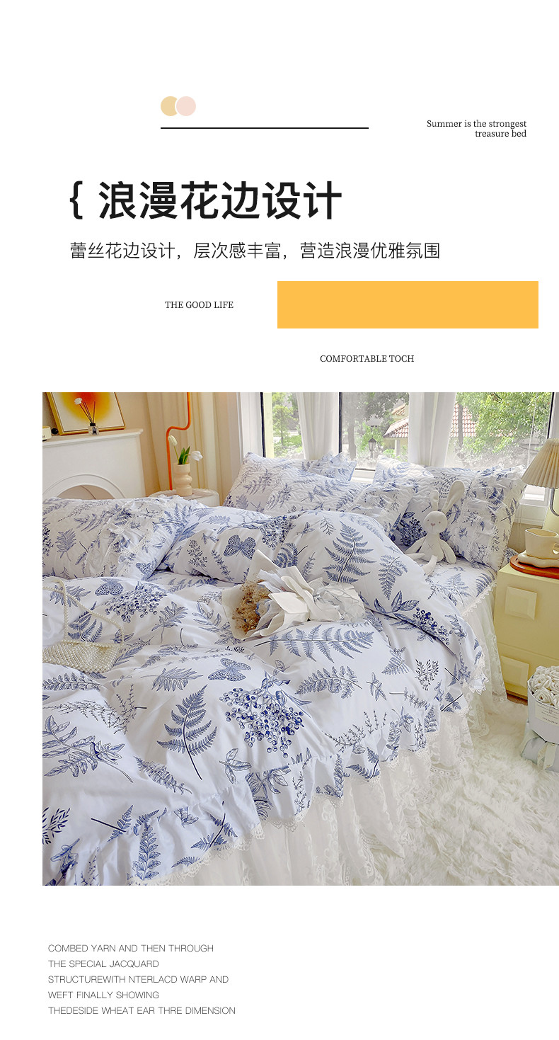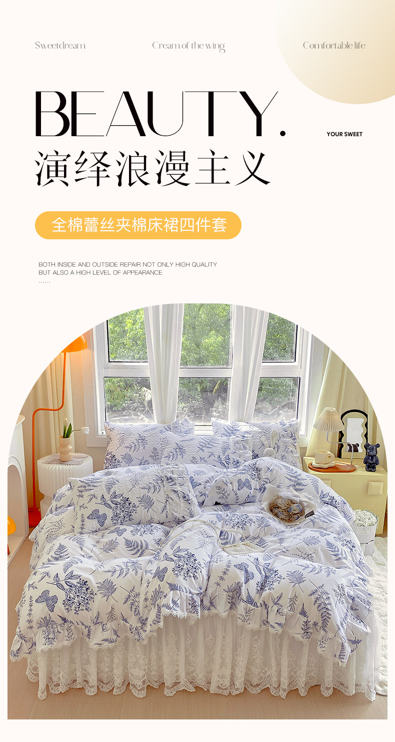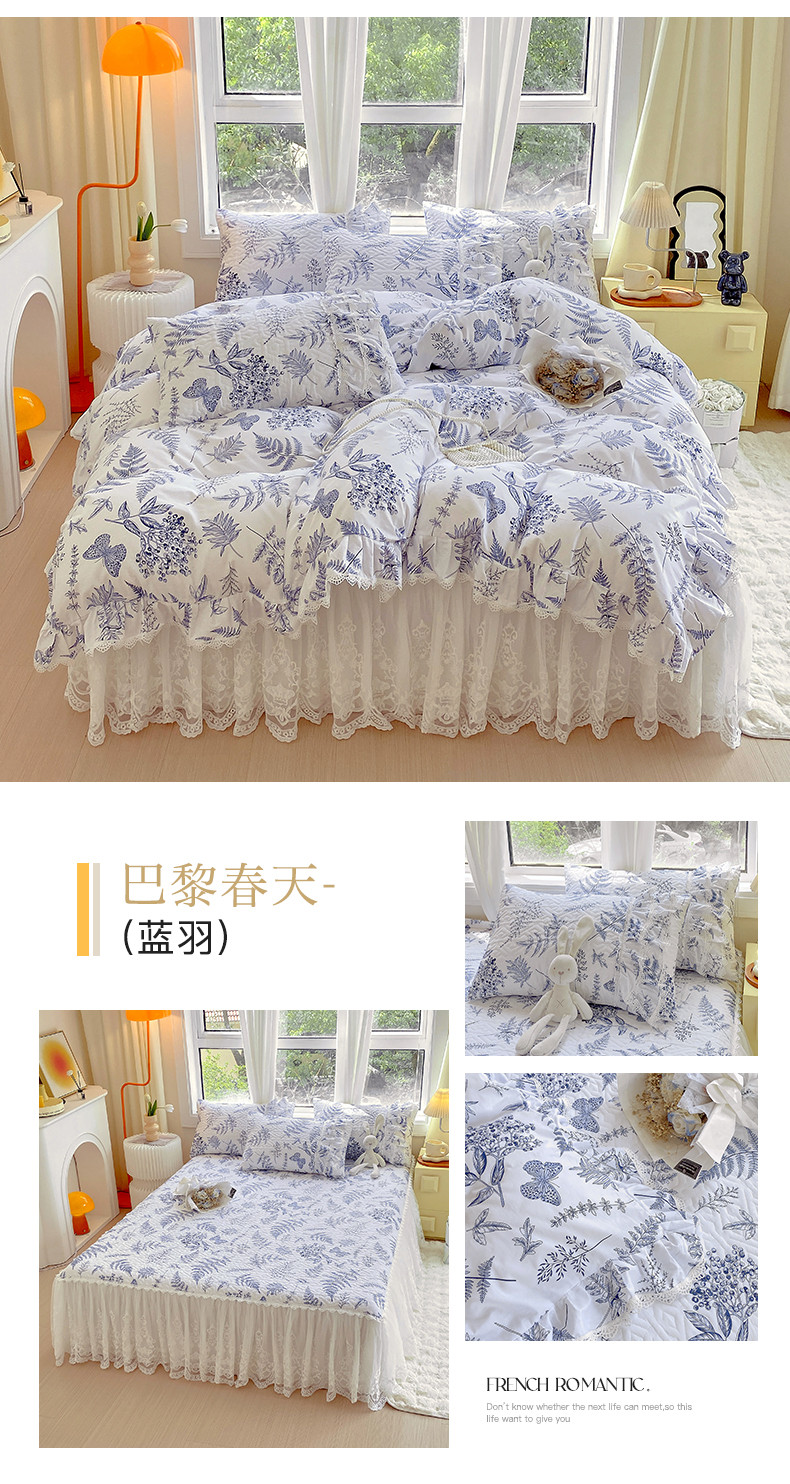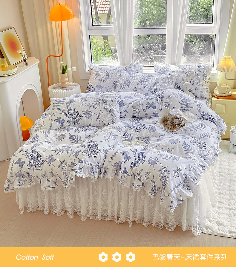当前位置: 91家纺网 > 商品网购 > 床品套件 > 四件套 > 全棉普通四件套 > 罗艺轩 2024新款全棉蕾丝夹棉床裙巴黎春天系列四件套 蓝羽