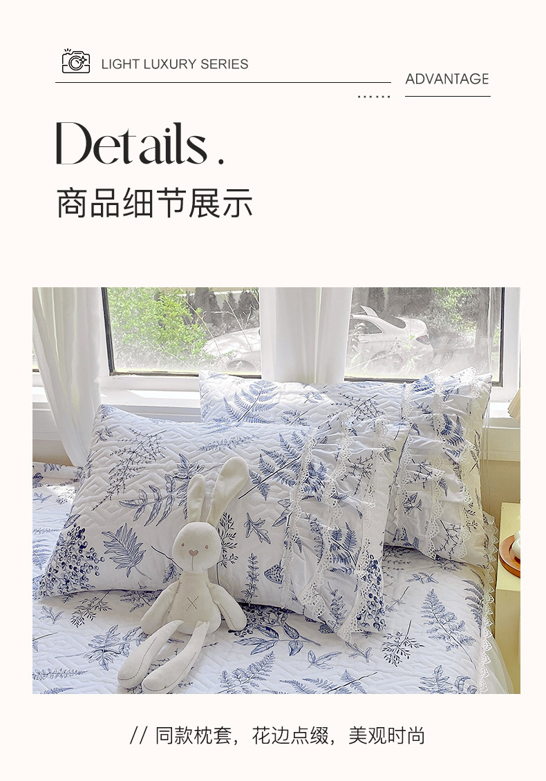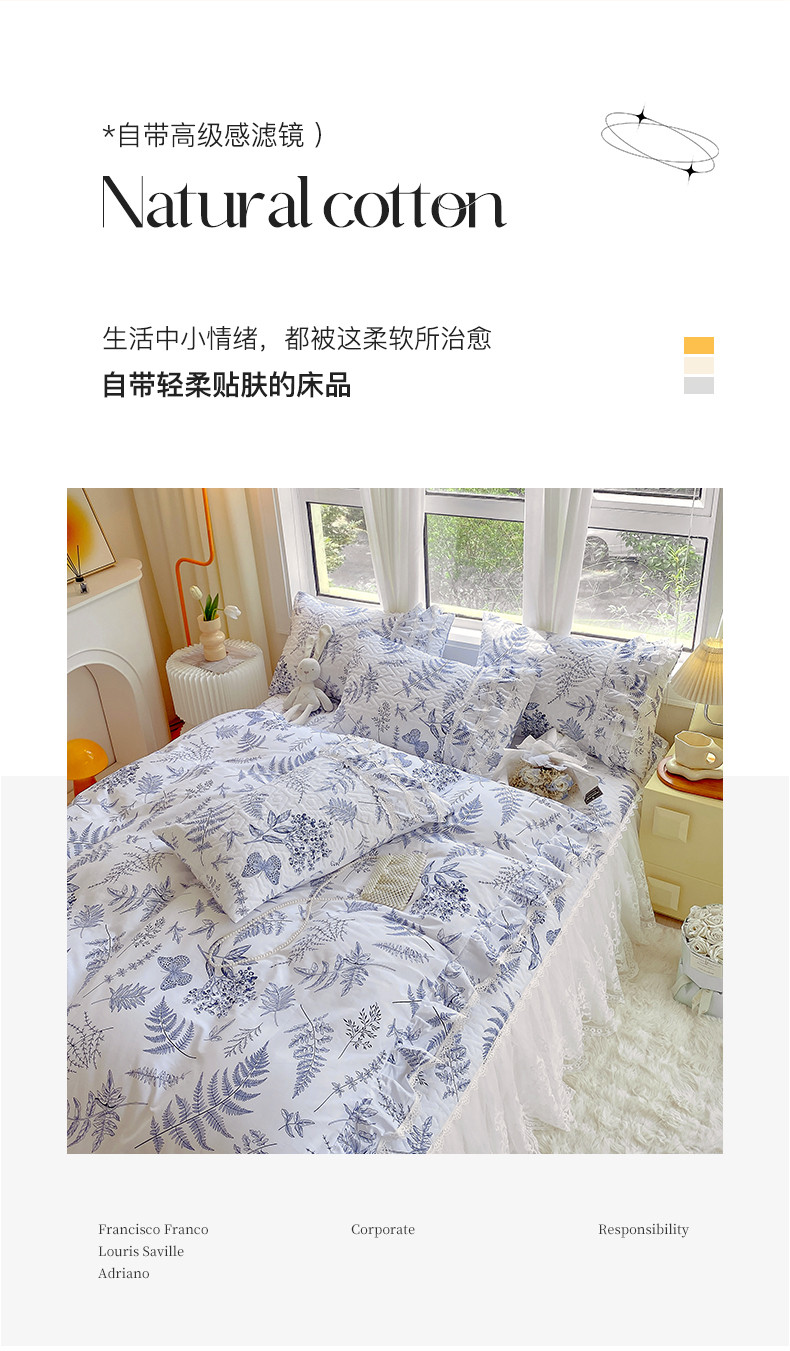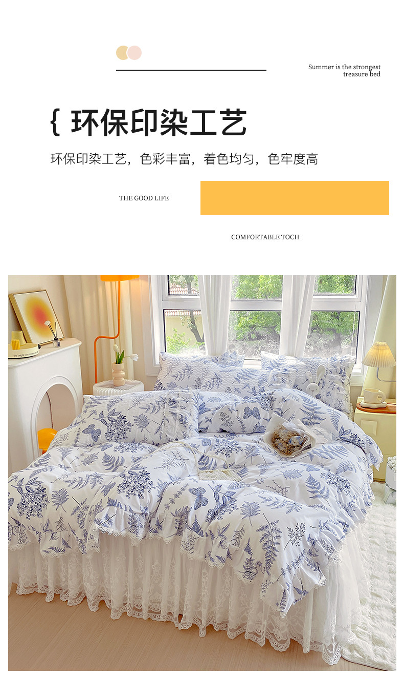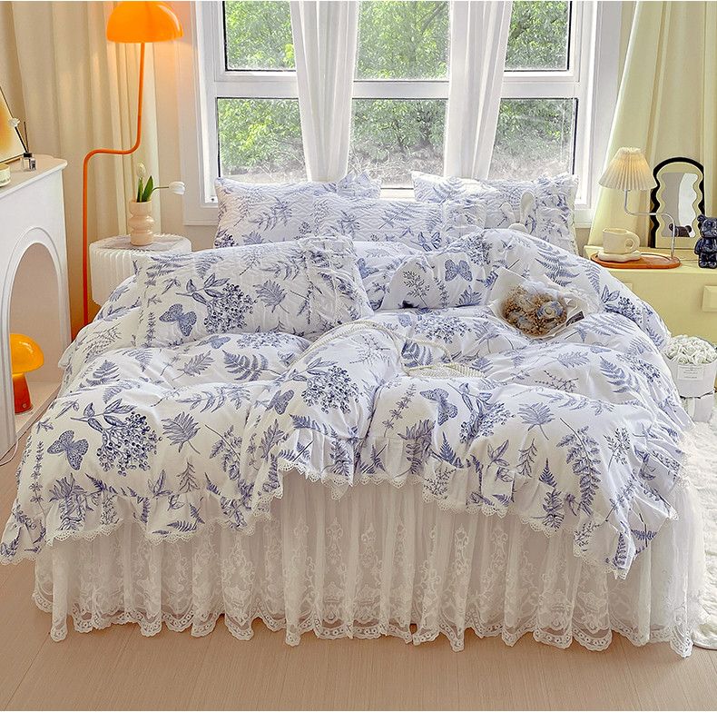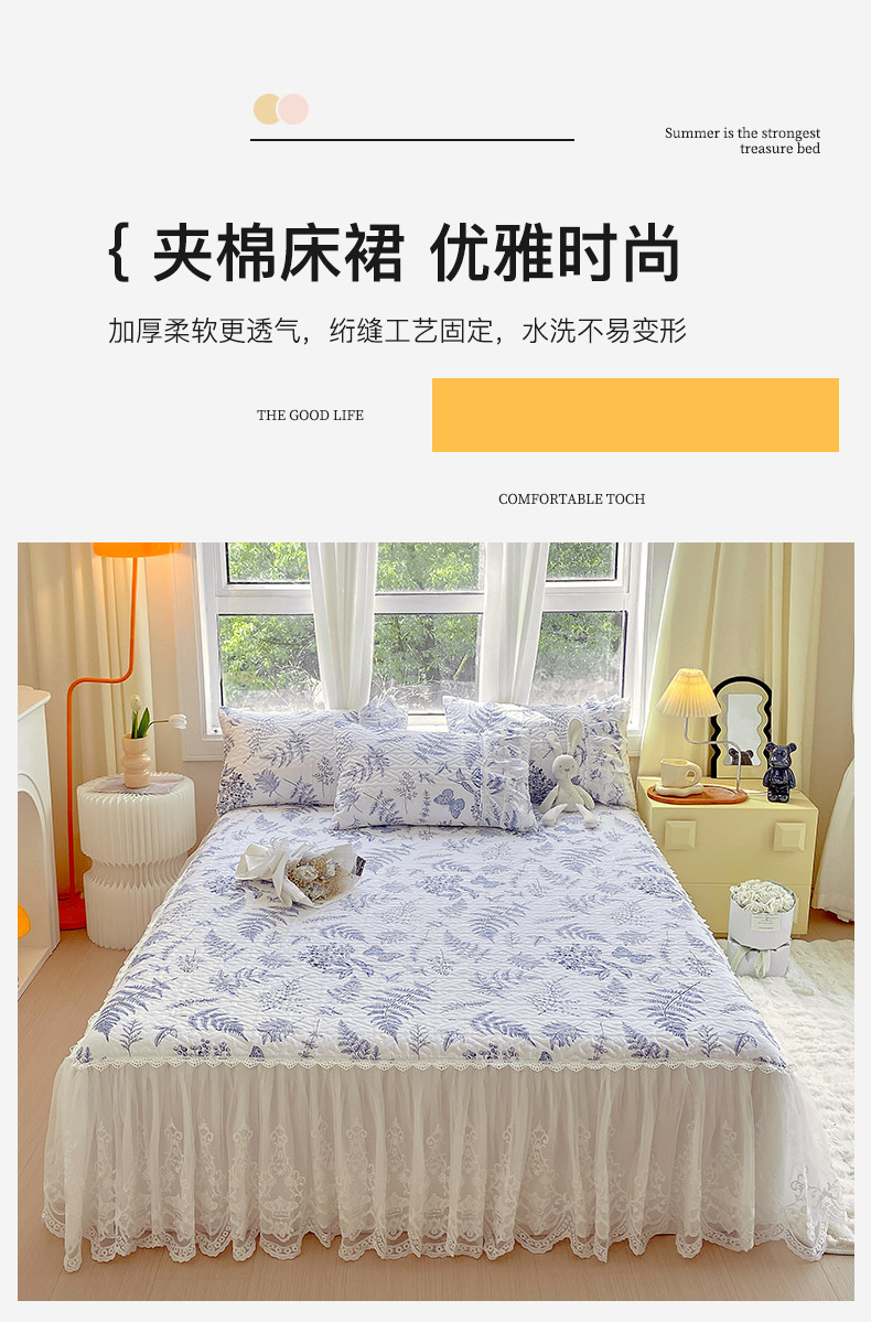 当前位置: 91家纺网 > 商品网购 > 床品套件 > 四件套 > 全棉普通四件套 > 罗艺轩 2024新款全棉蕾丝夹棉床裙巴黎春天系列四件套 蓝羽
