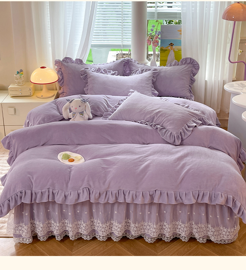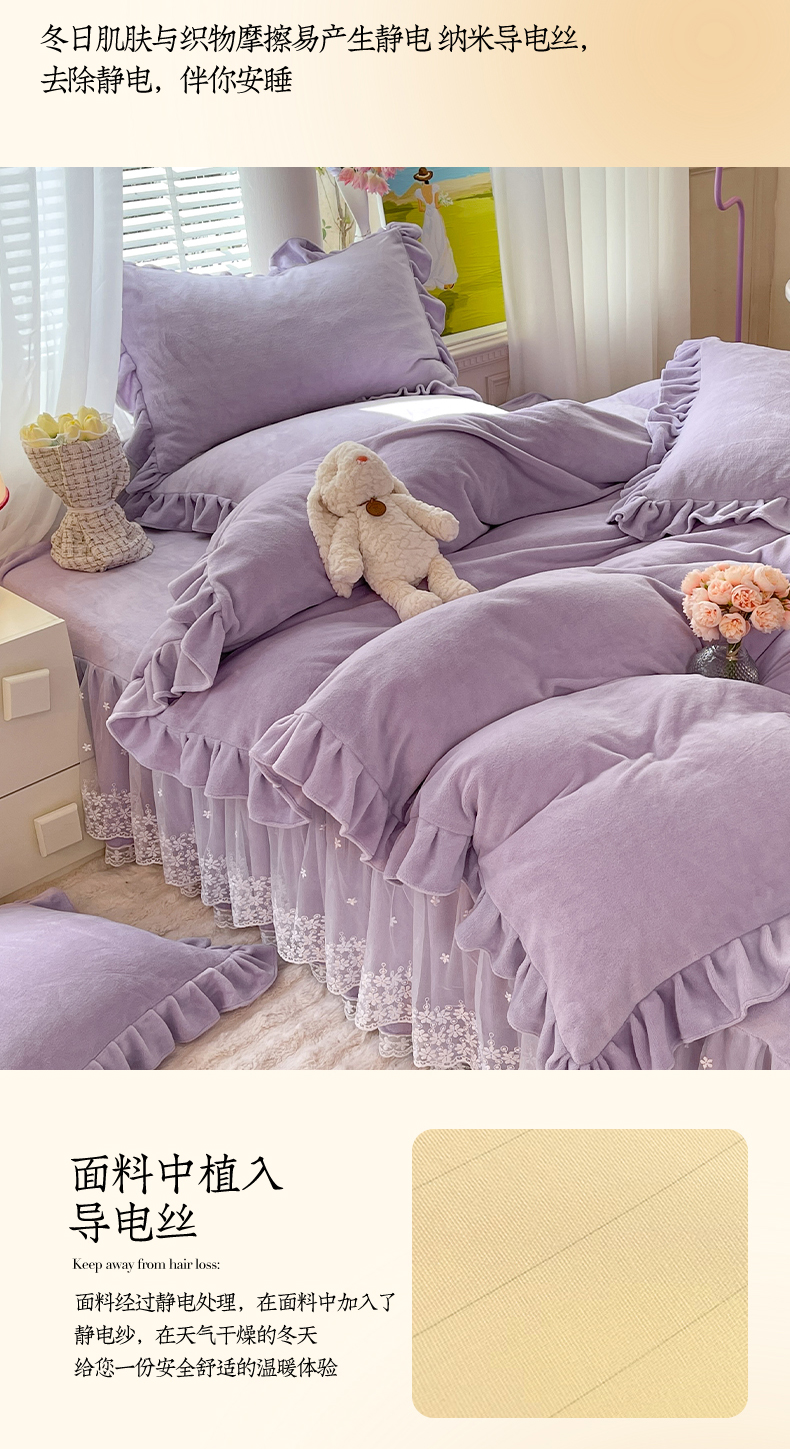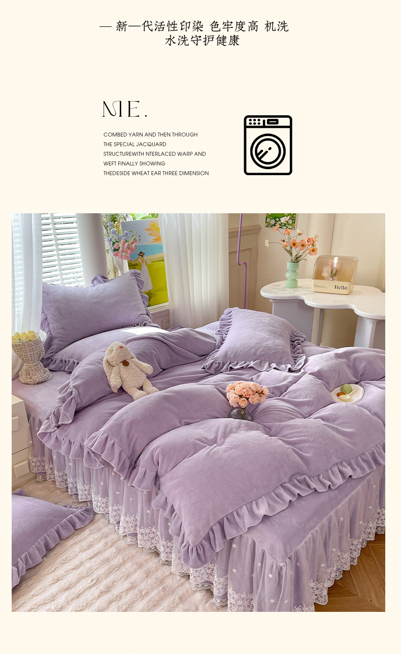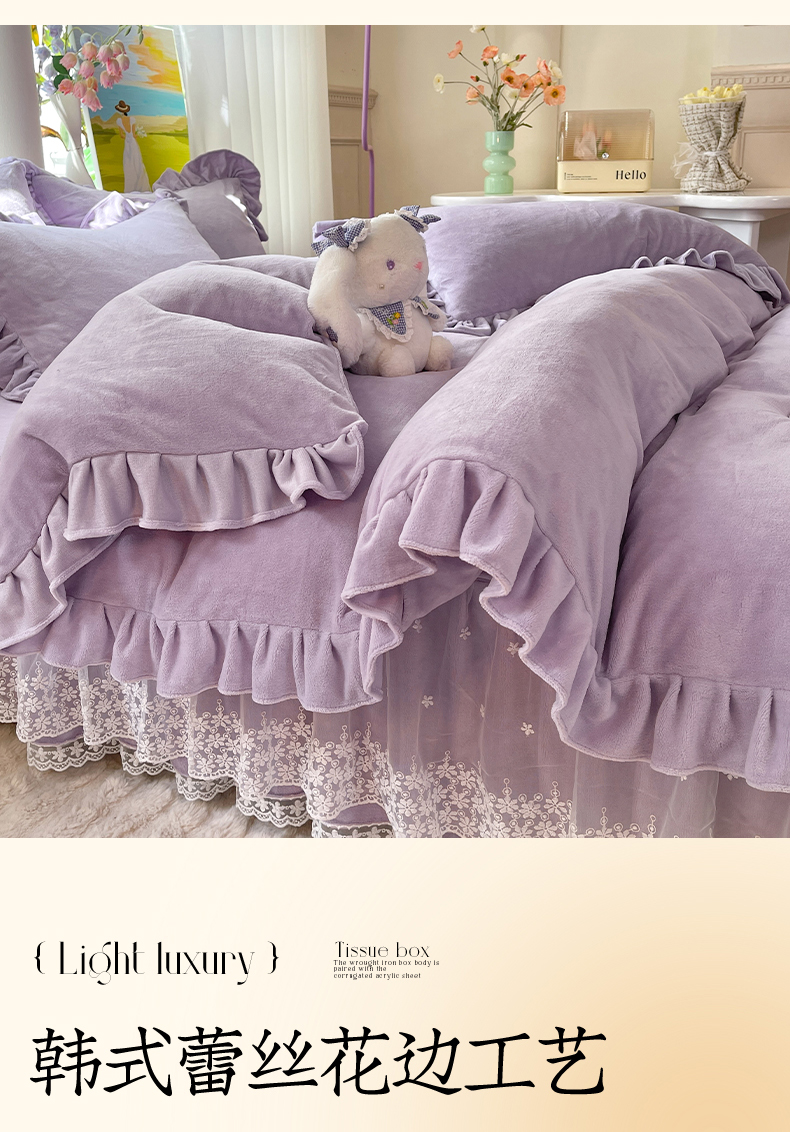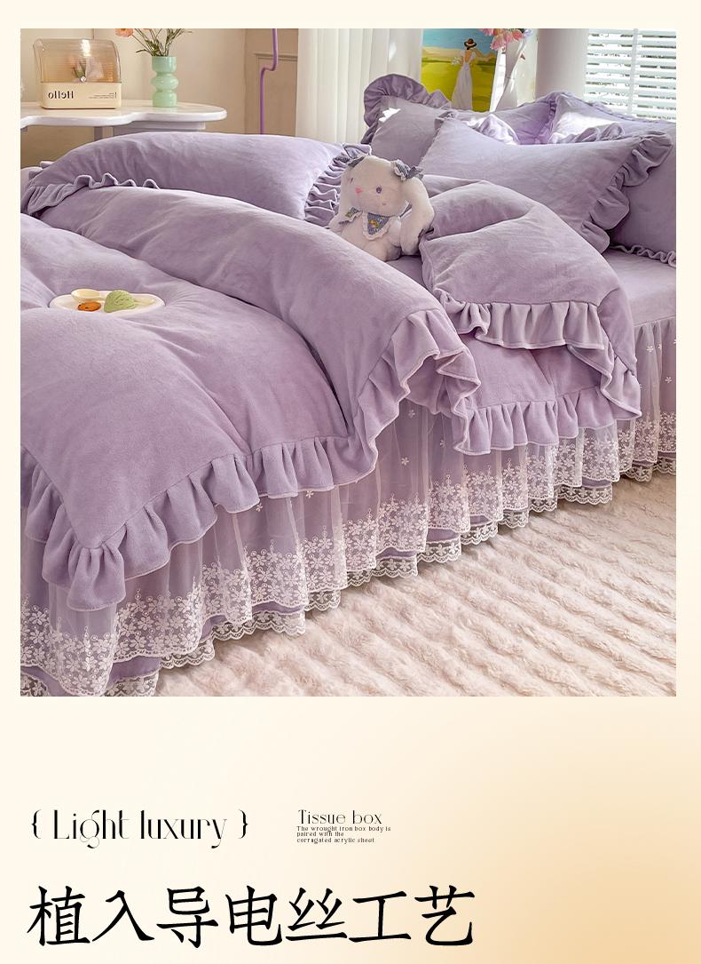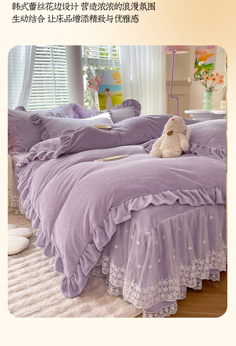 商品名称:【8斤重】2025新款秋冬加厚牛奶绒床裙款四件套法式浪漫蕾丝花边工艺-遇见系列 遇见-浪漫紫