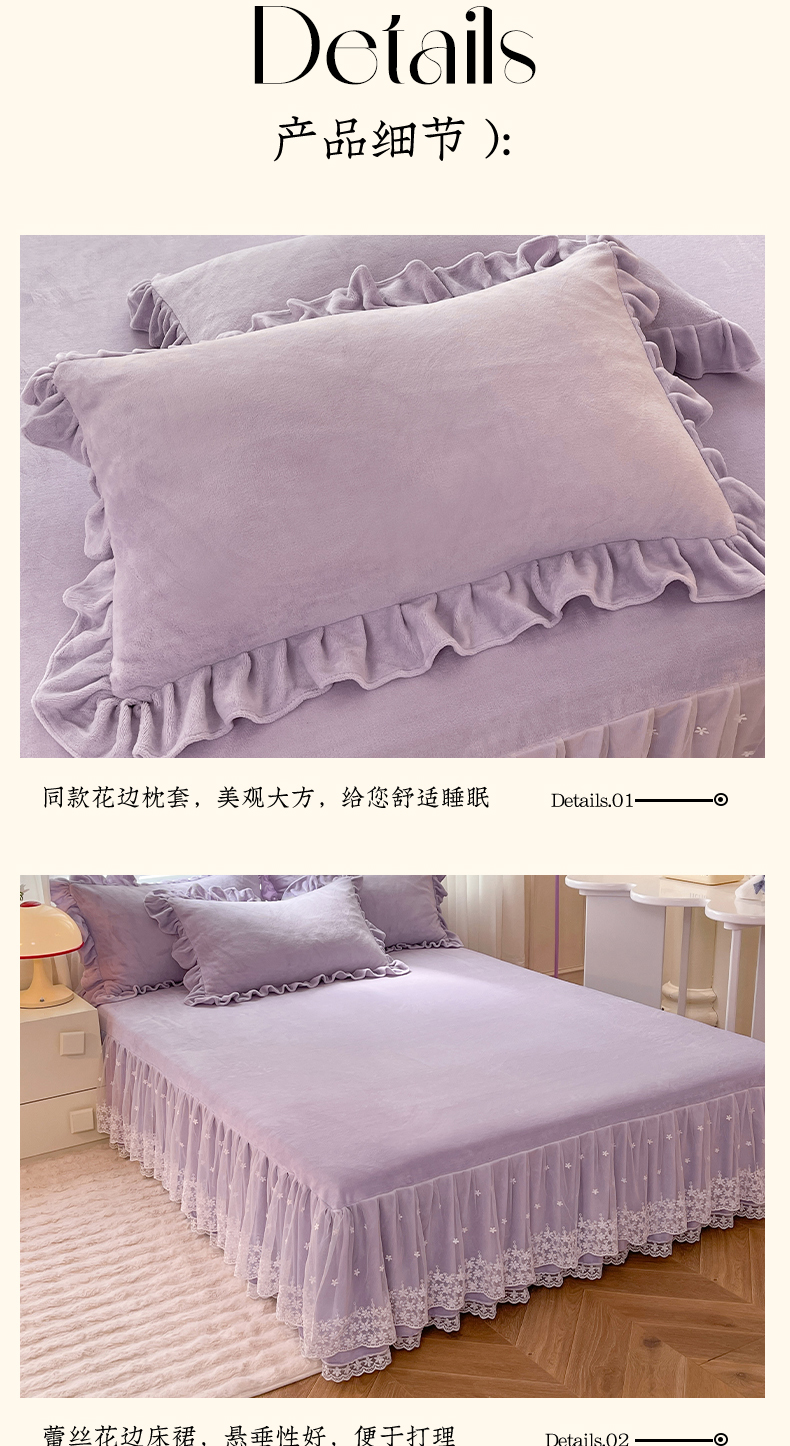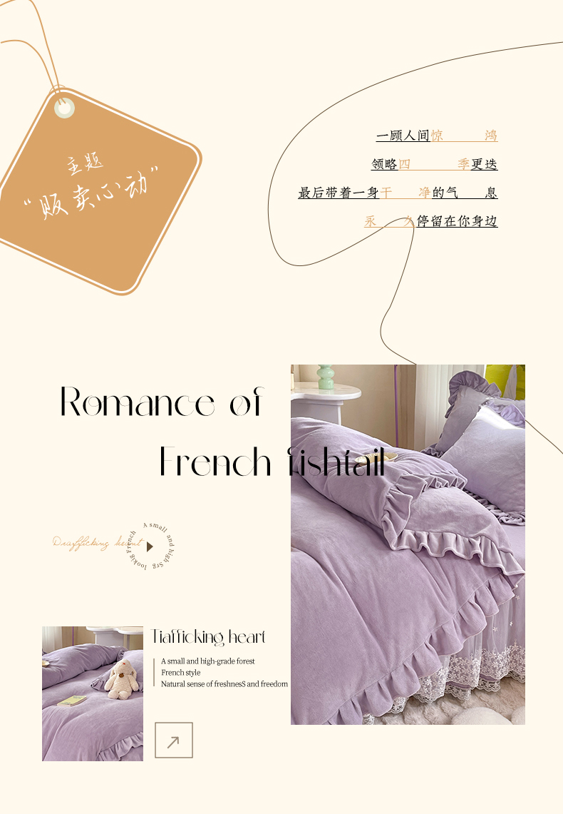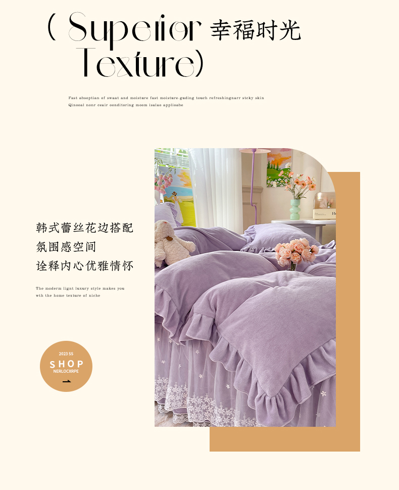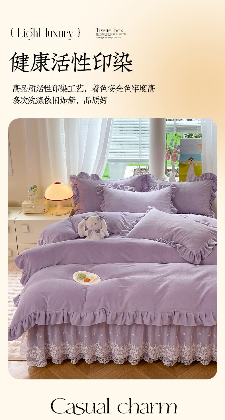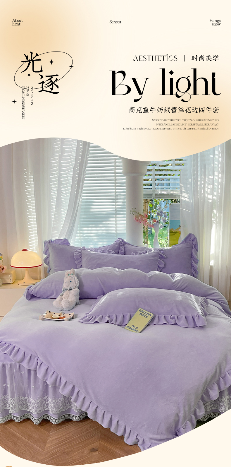 商品名称:【8斤重】2025新款秋冬加厚牛奶绒床裙款四件套法式浪漫蕾丝花边工艺-遇见系列 遇见-浪漫紫