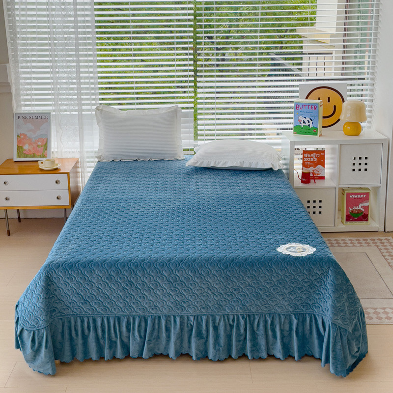 雅眠居 2023秋冬新款纯色牛奶绒床盖床裙款蕾丝边素色婴儿绒床盖 爱心-宝蓝