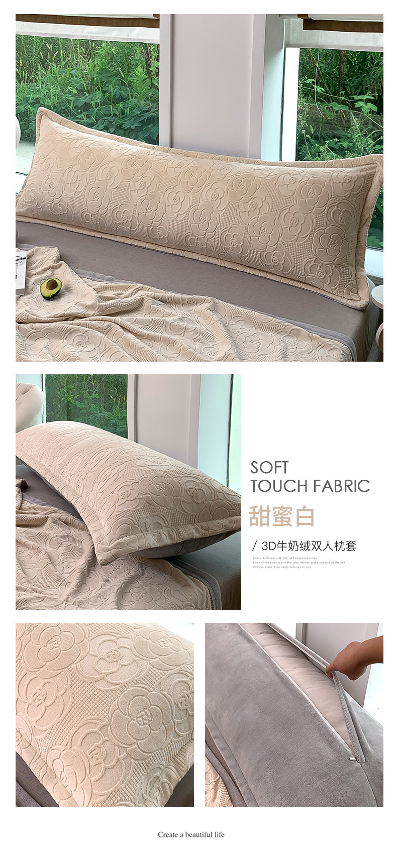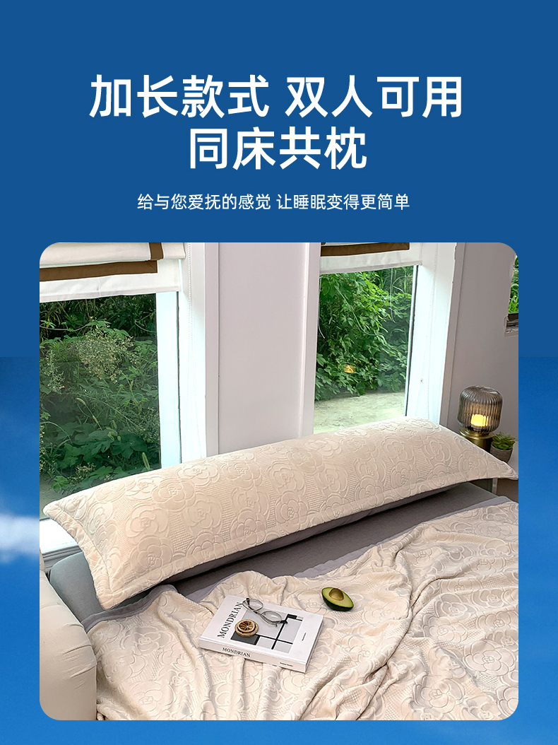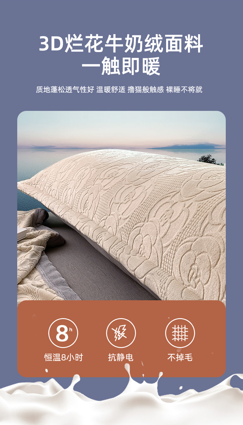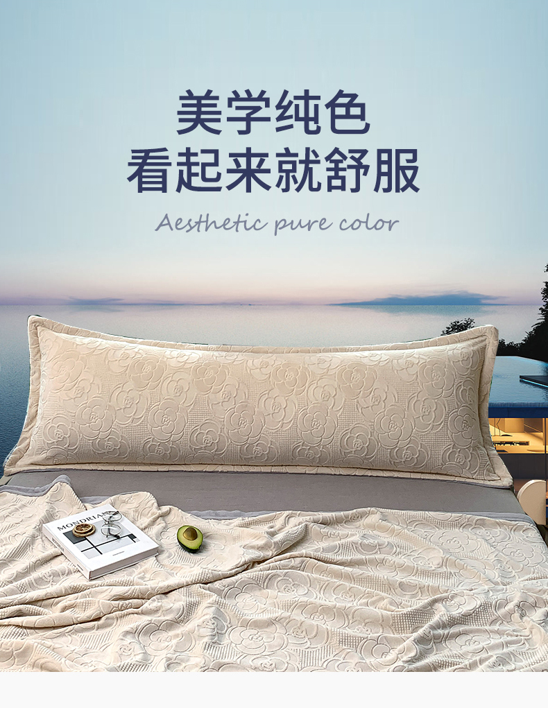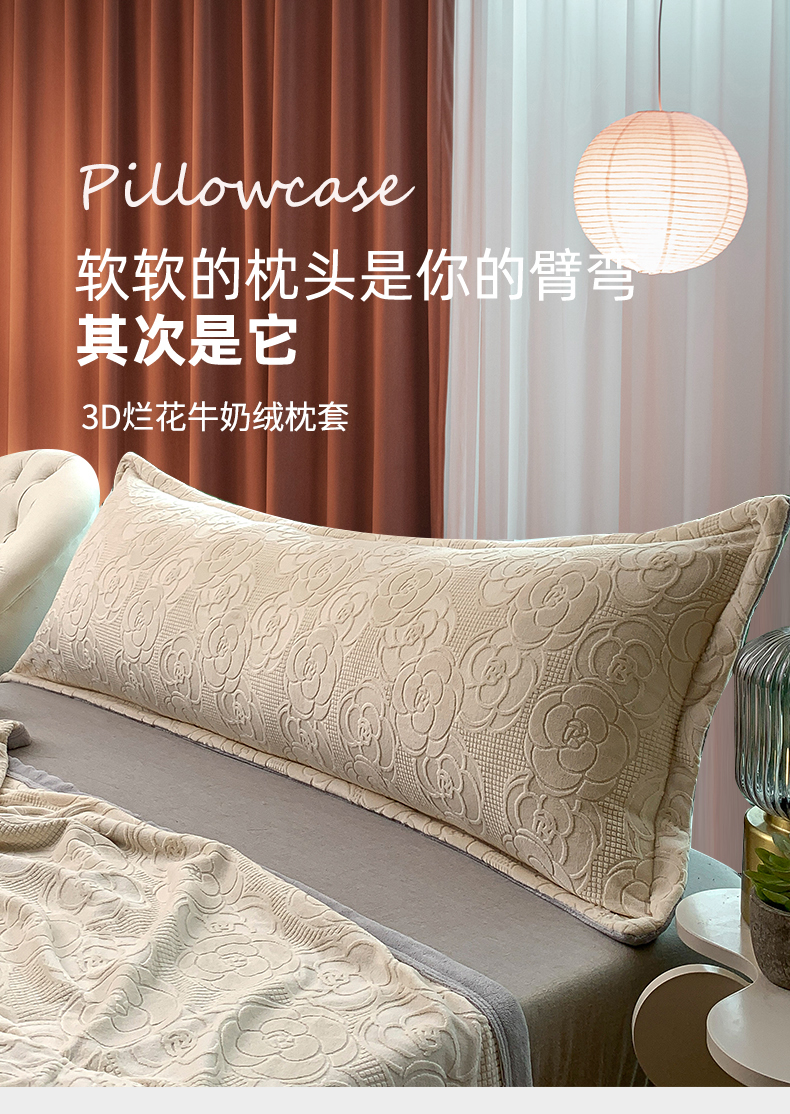 爱港 2023新款3D消光烂花牛奶绒长枕套,情侣双人枕套,男生保暖枕套 甜蜜白