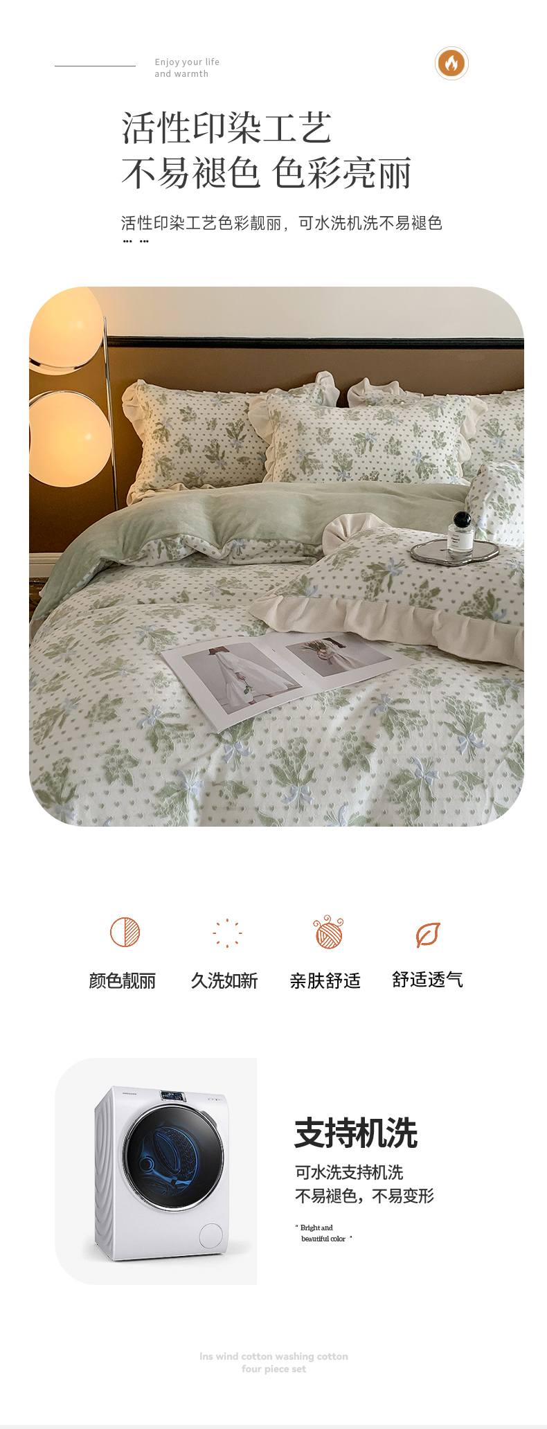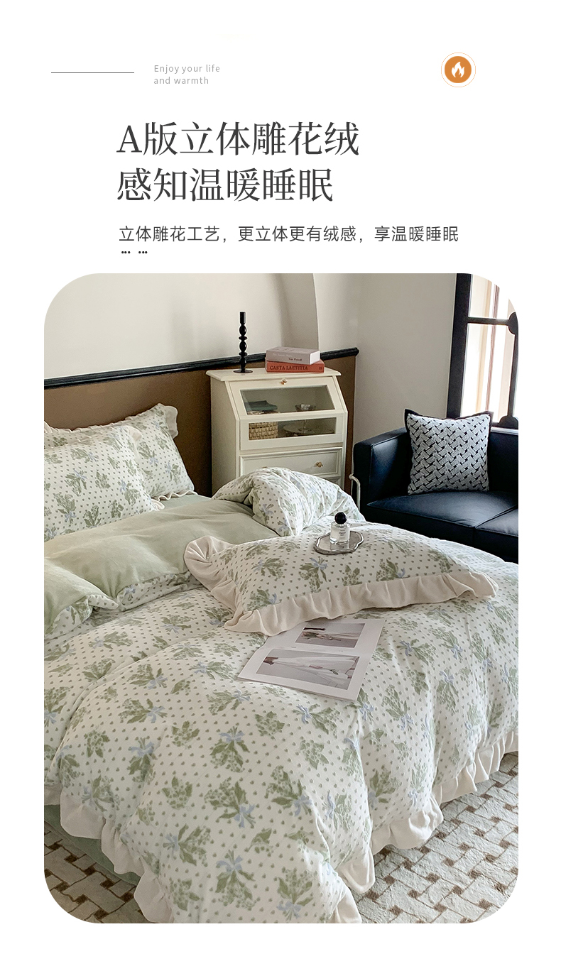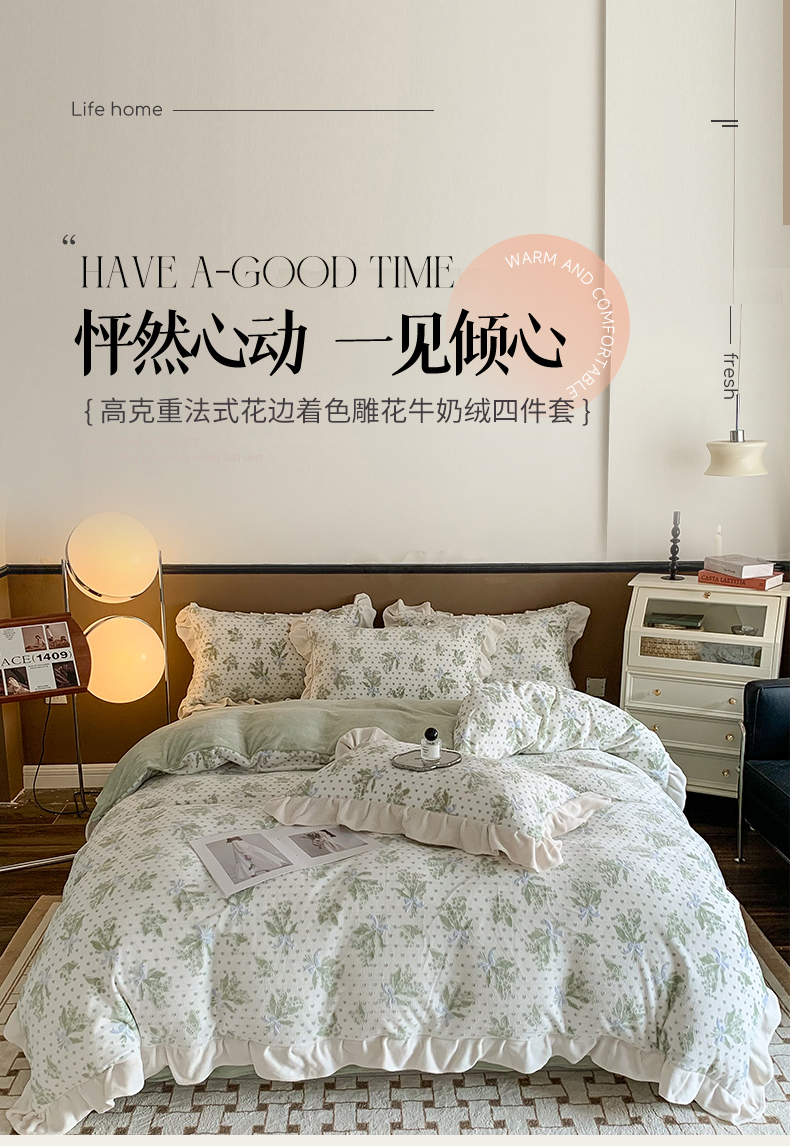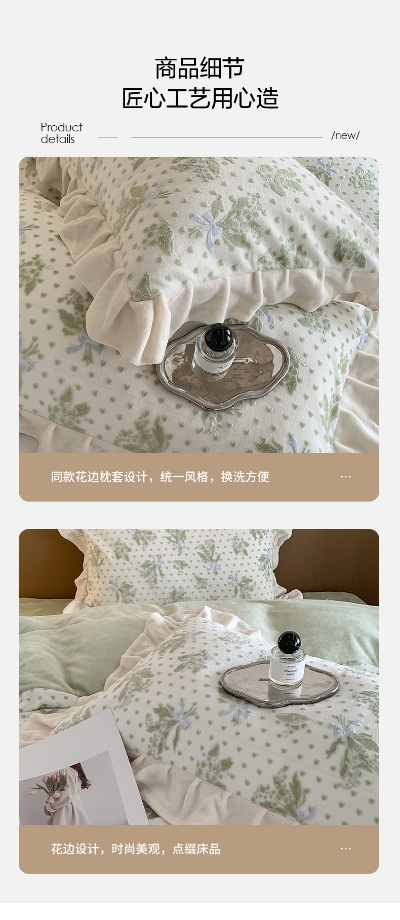 商品名称:潘朵拉 2023新款高克重法式花边着色雕花牛奶绒四件套 清浅(奶绿)