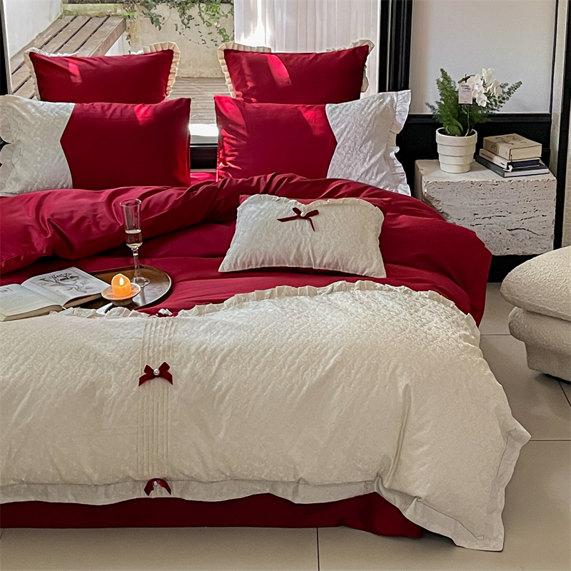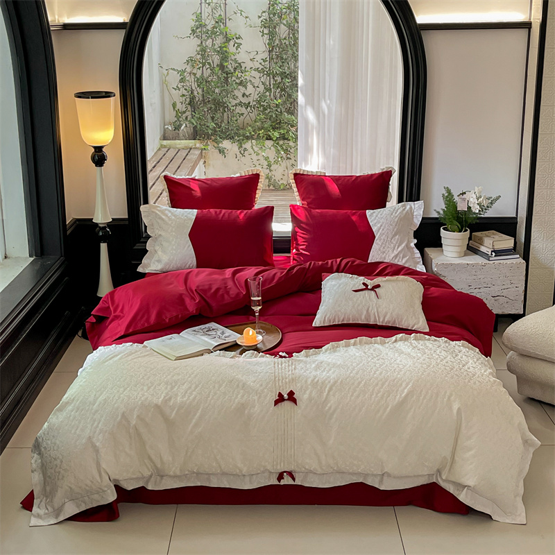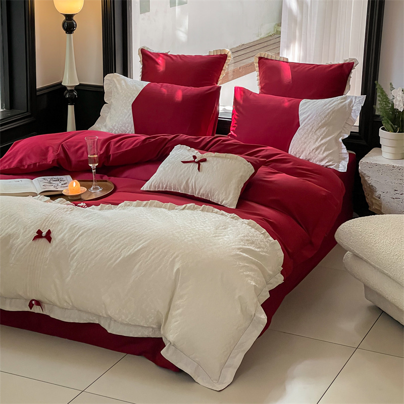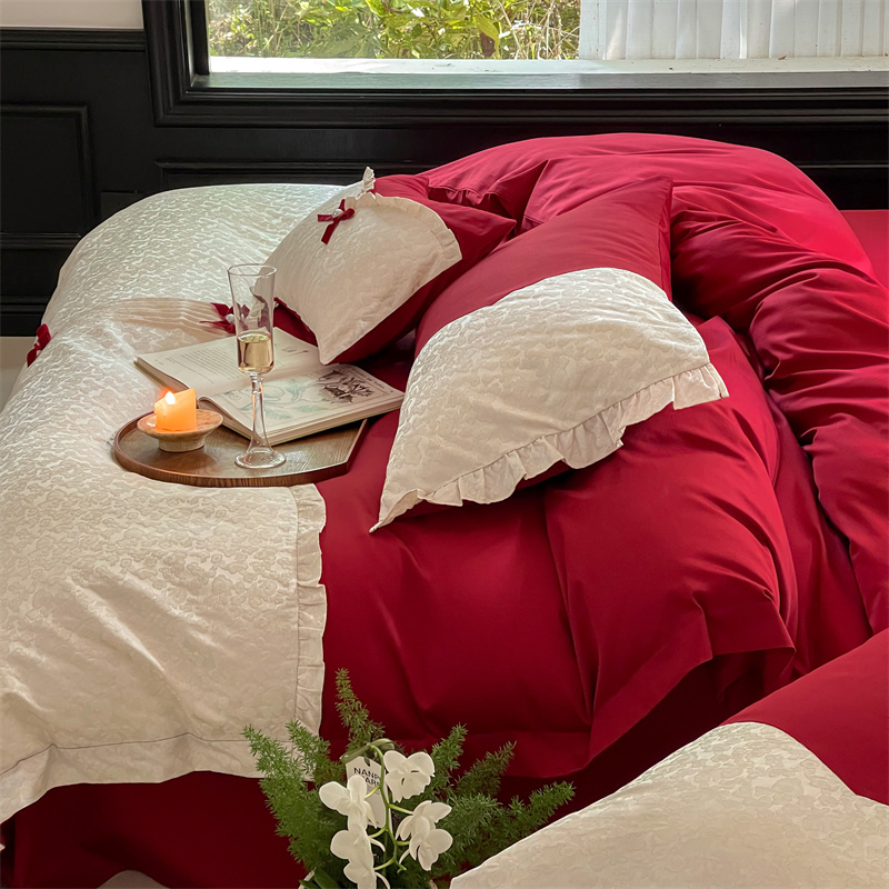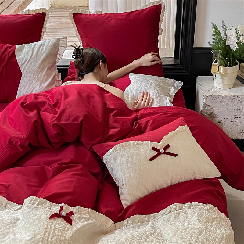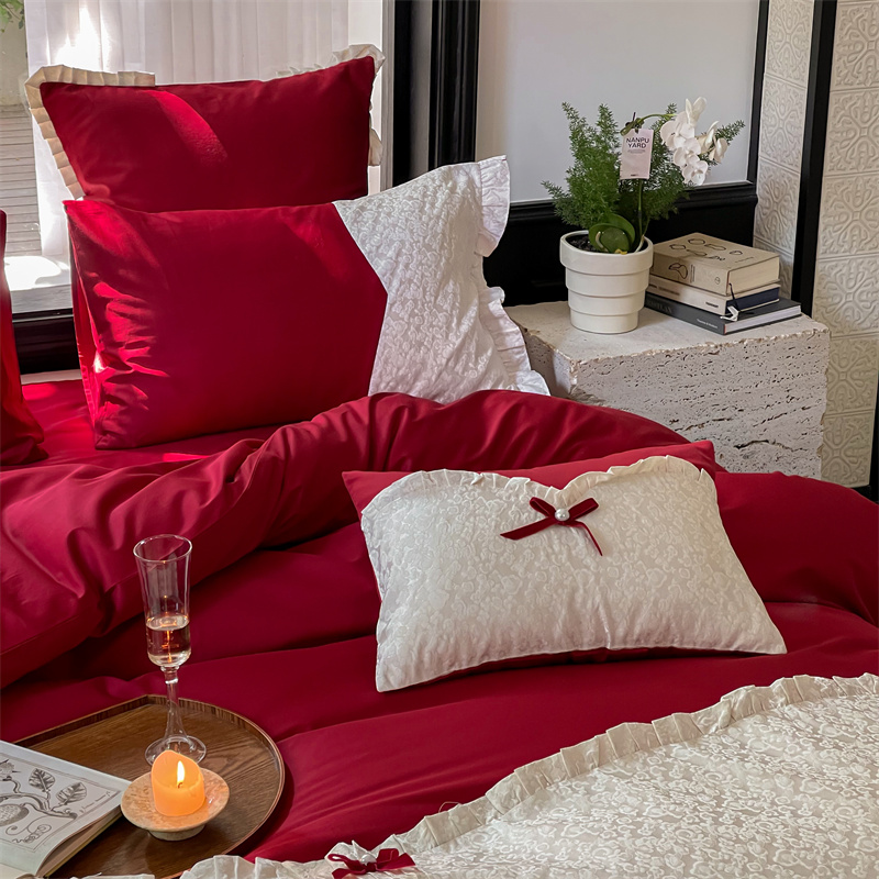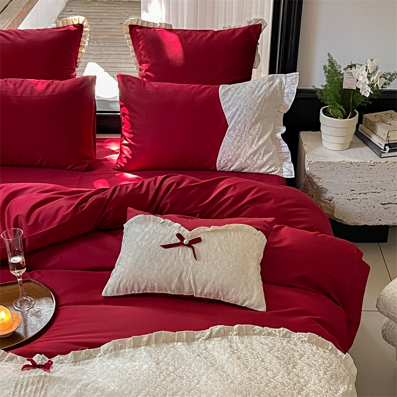 (总)优然居家纺 2025春夏新款木耳边喜字蝴蝶结小爱心复古红四件套-小欢喜,小欢喜