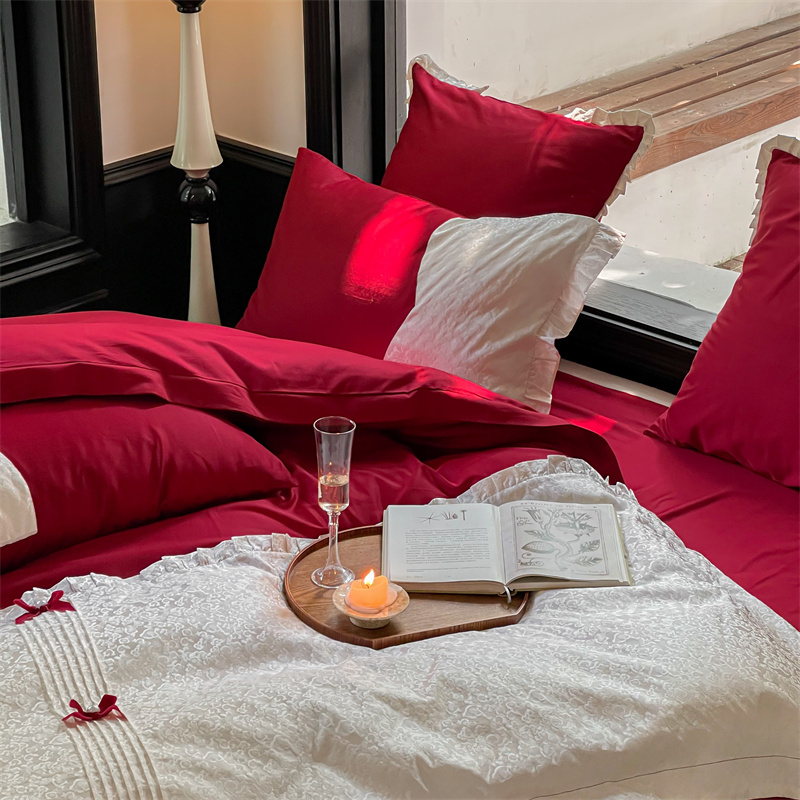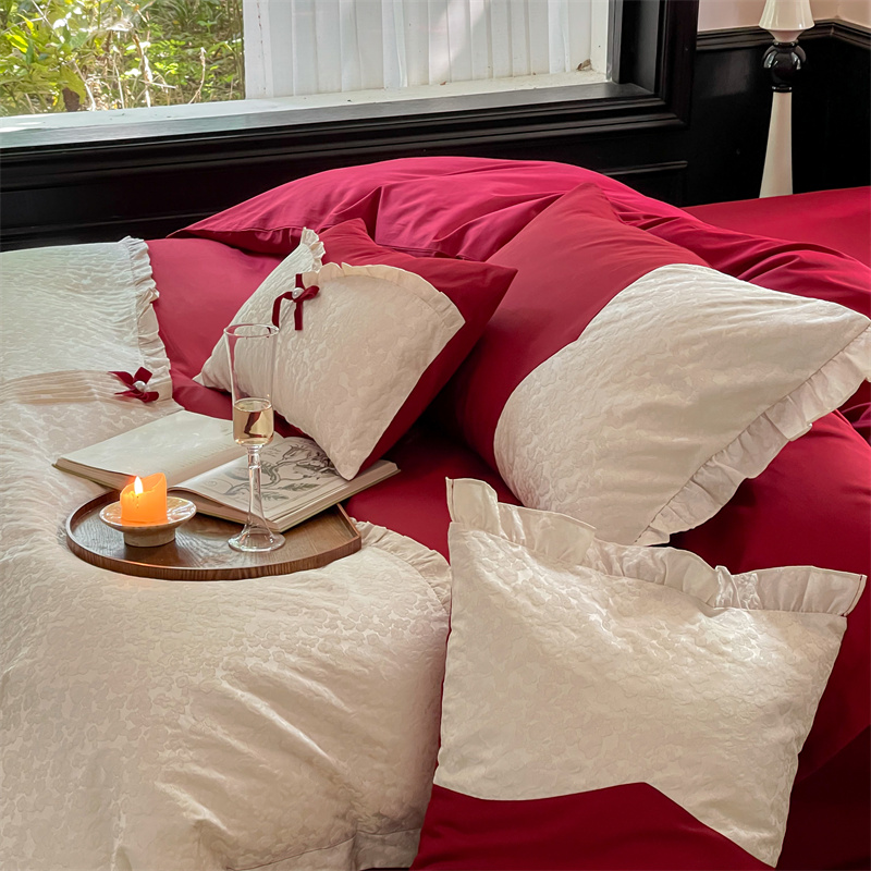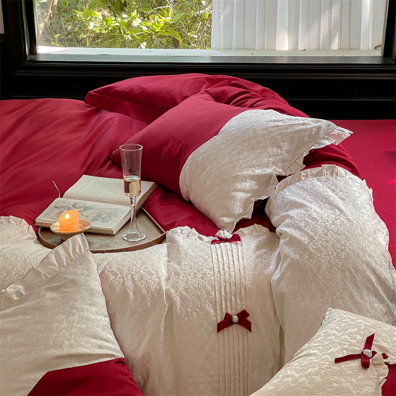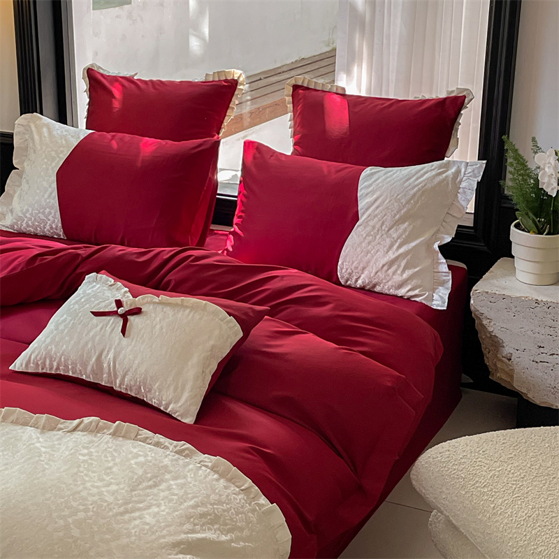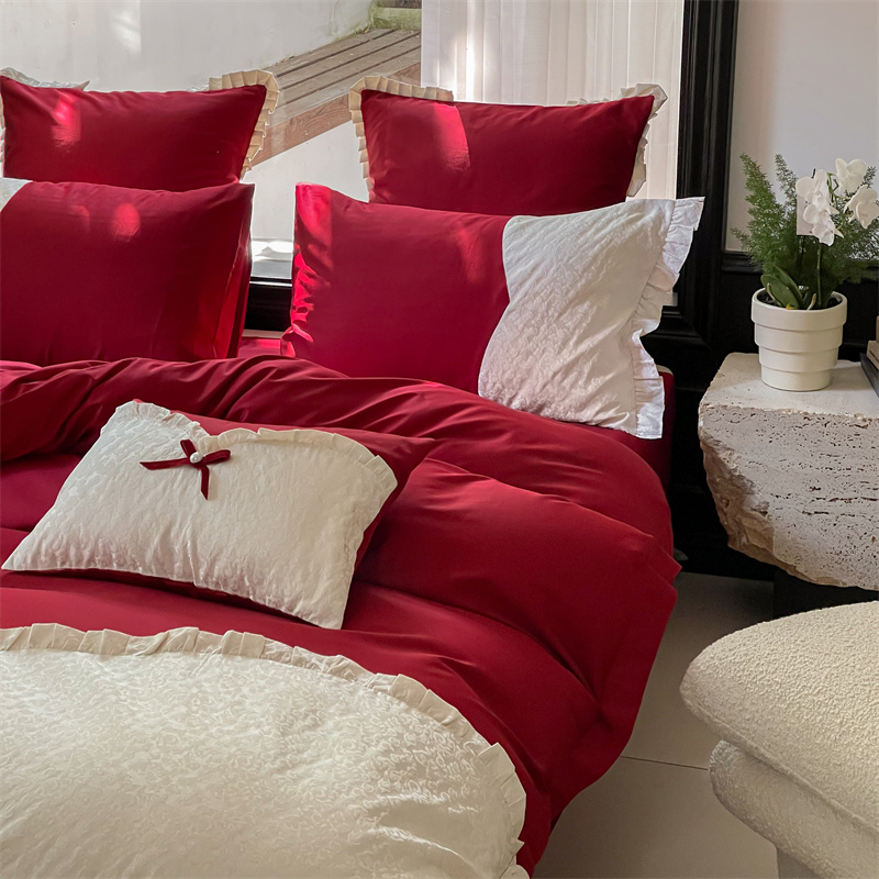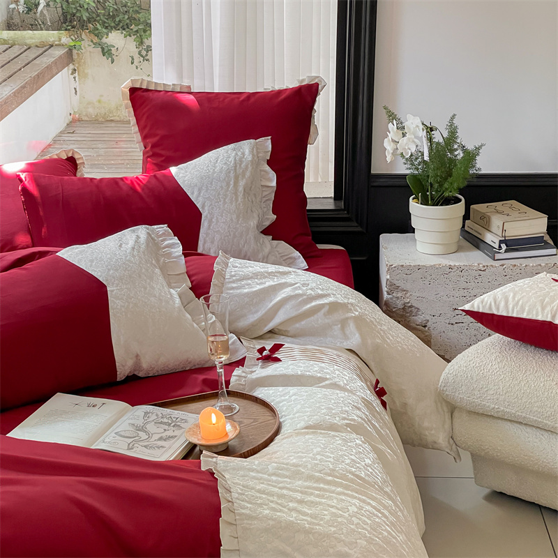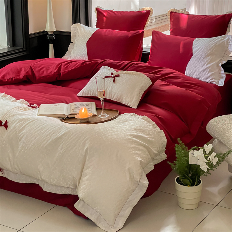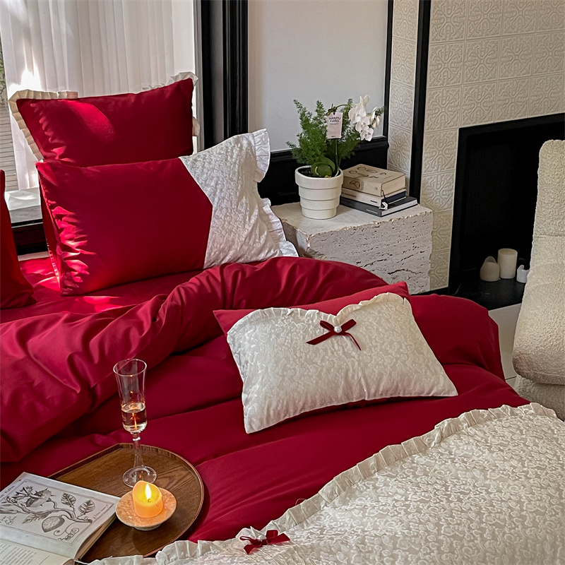 (总)优然居家纺 2025春夏新款木耳边喜字蝴蝶结小爱心复古红四件套-小欢喜,小欢喜