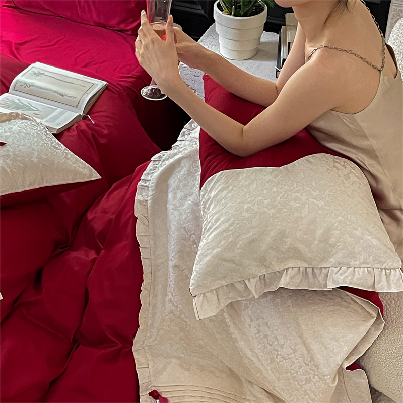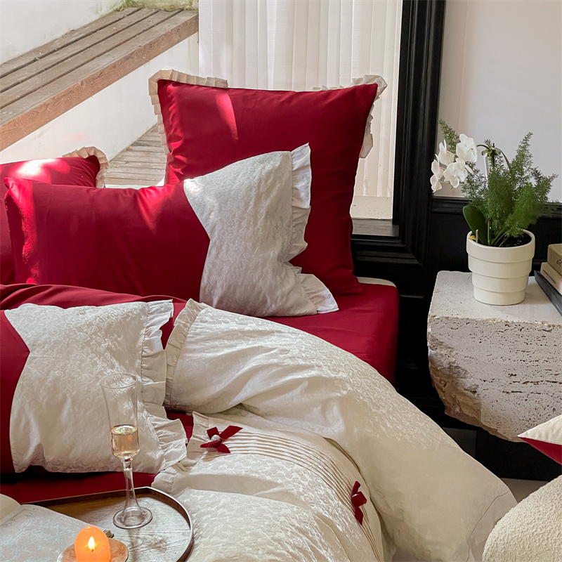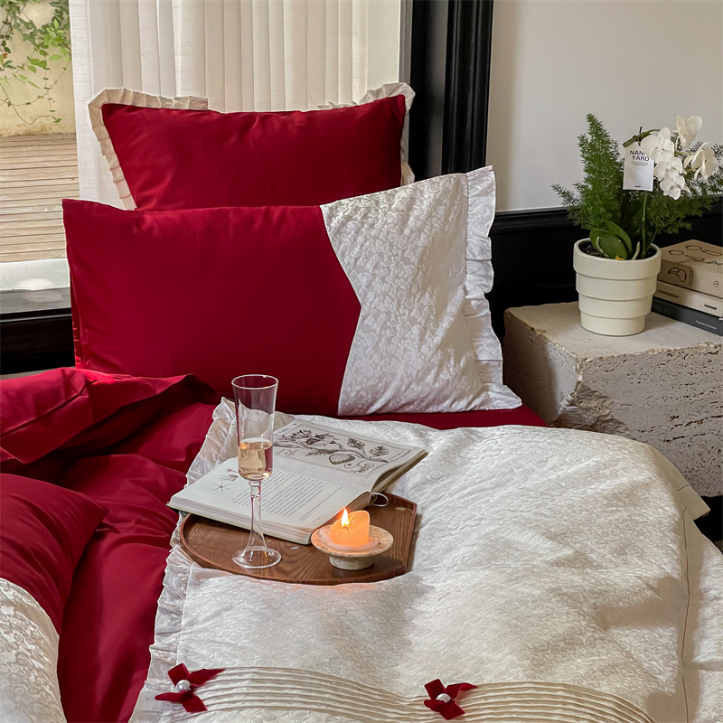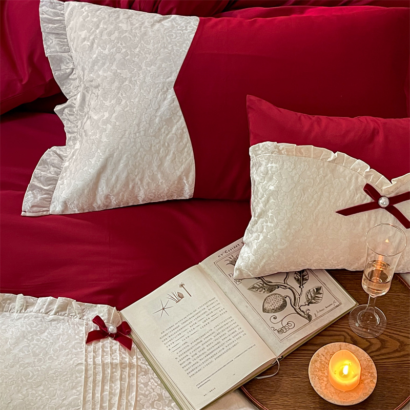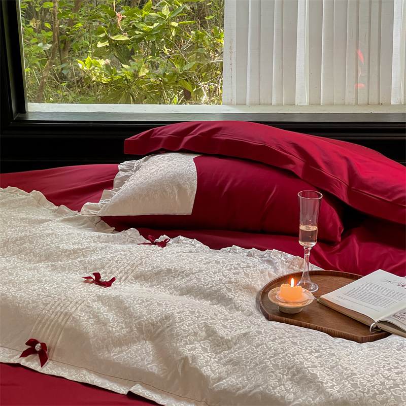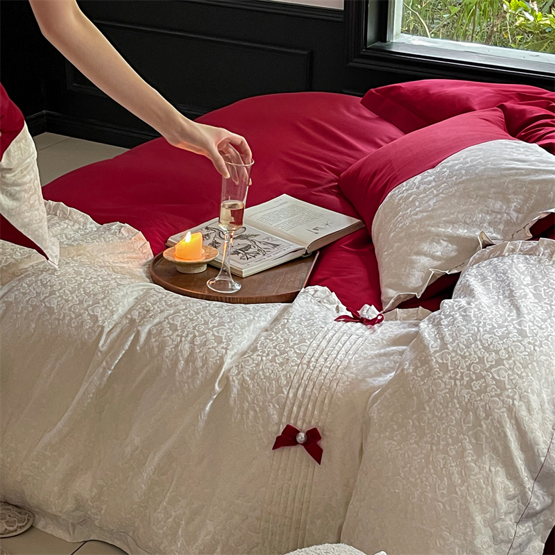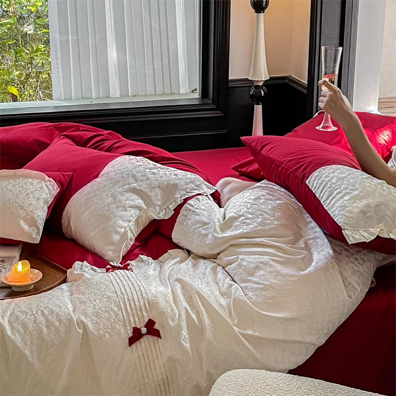 (总)优然居家纺 2025春夏新款木耳边喜字蝴蝶结小爱心复古红四件套-小欢喜,小欢喜