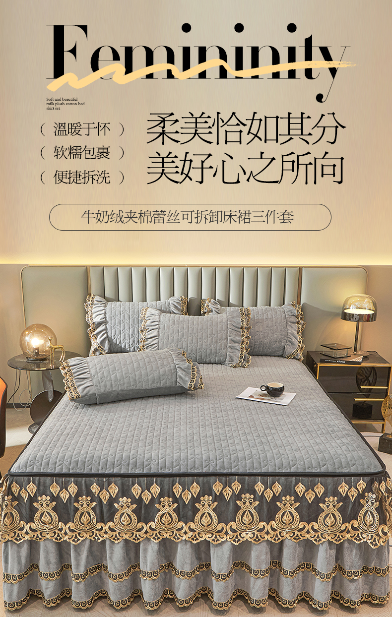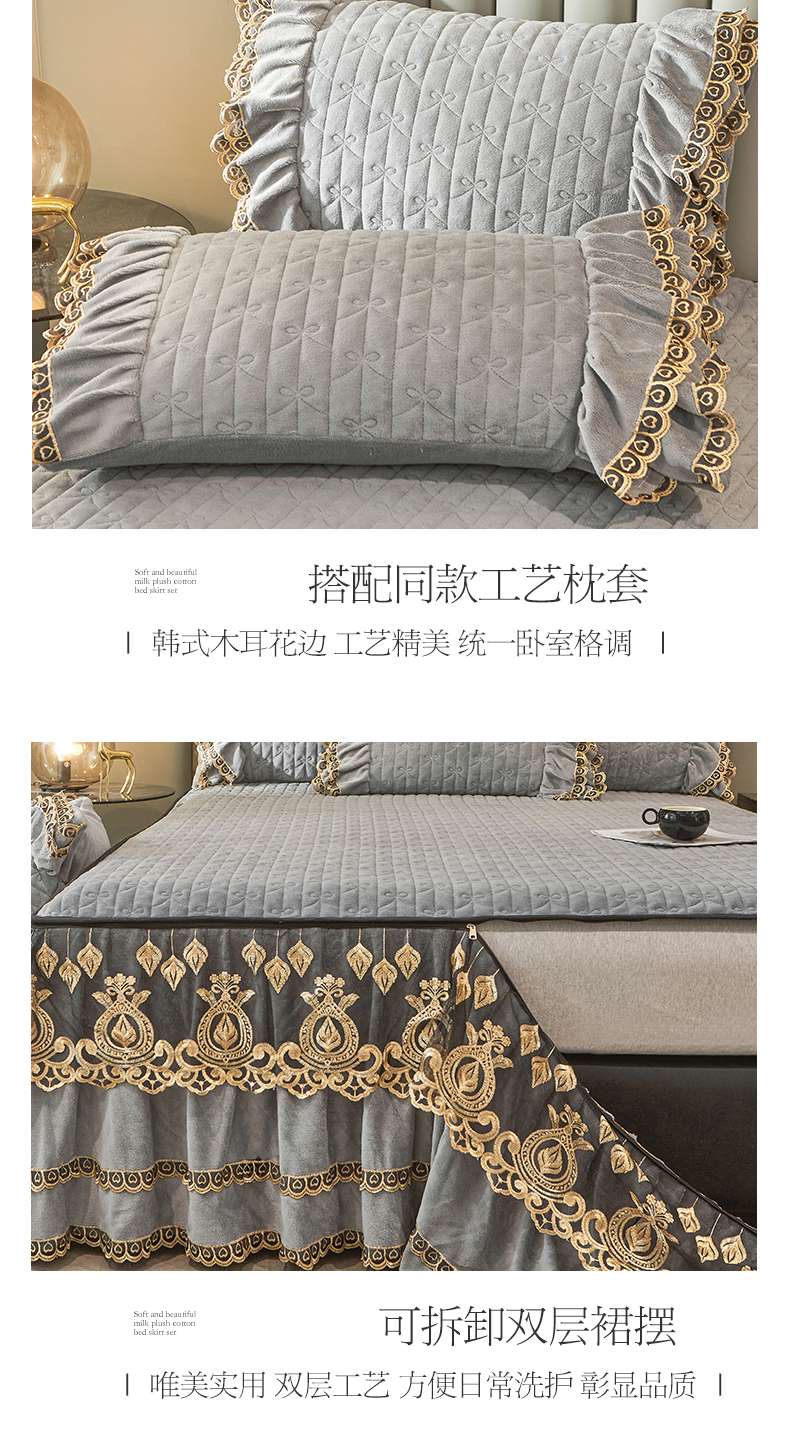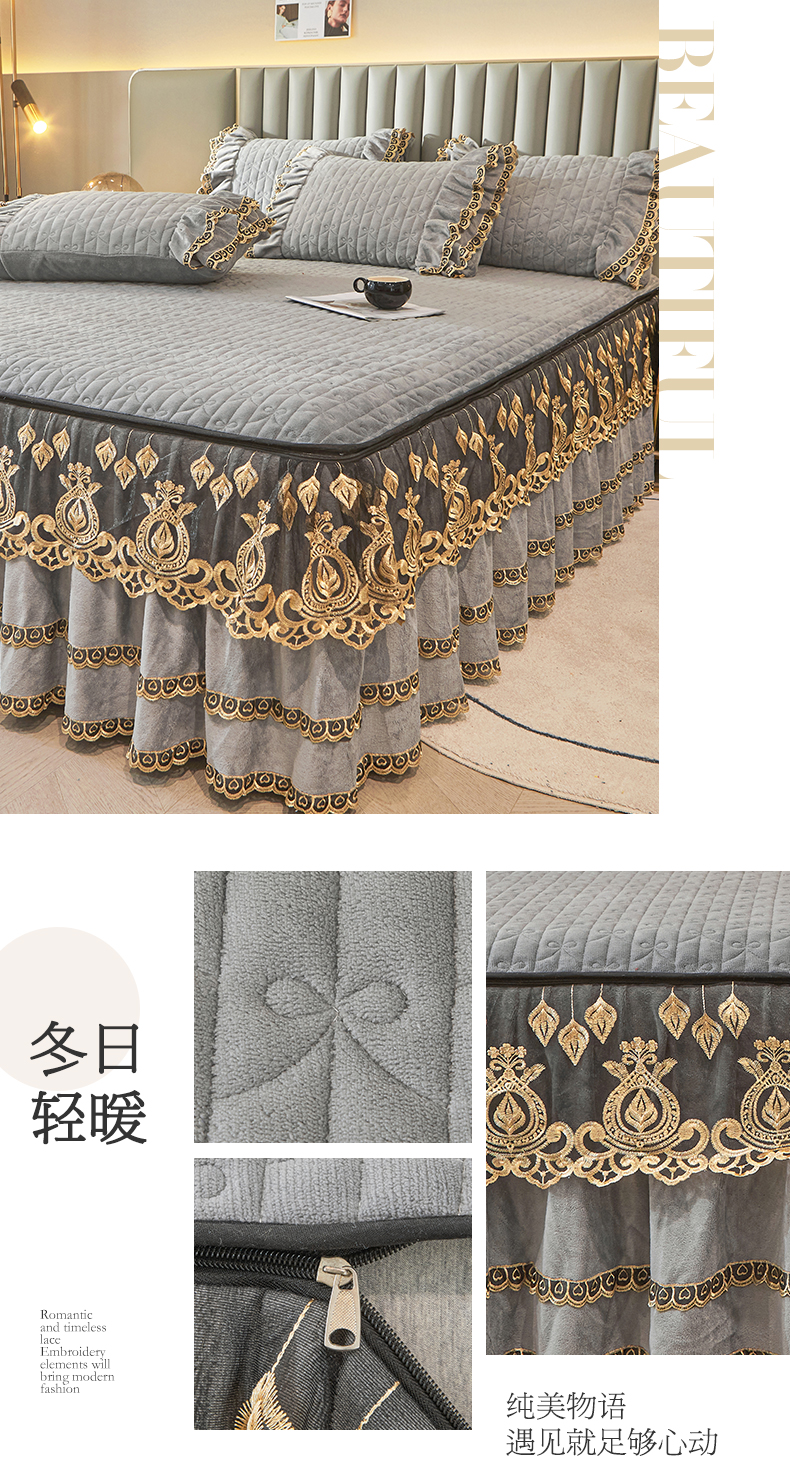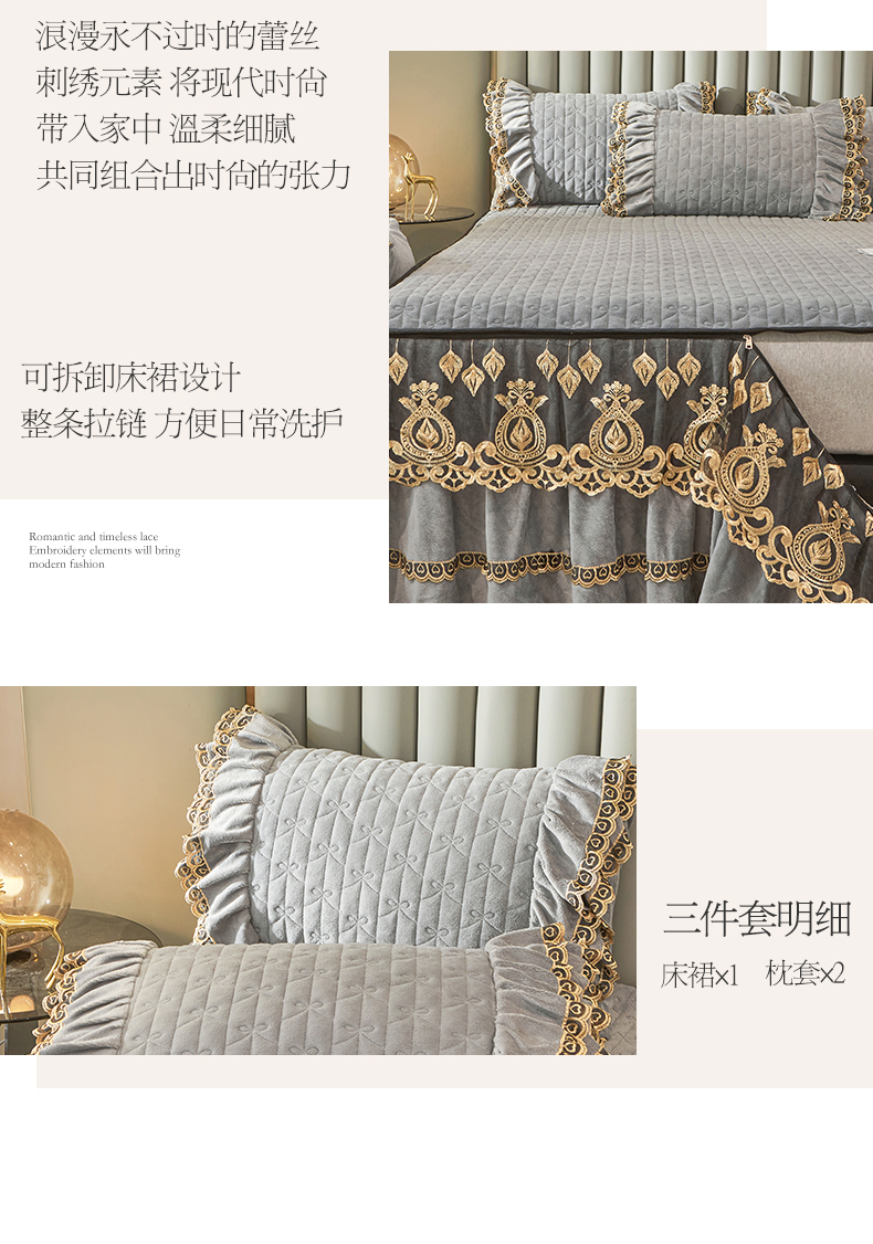 商品名称:虹星家纺 2023新款牛奶绒夹棉蕾丝可拆卸床裙系列单床裙 梦幻巴黎 时尚灰