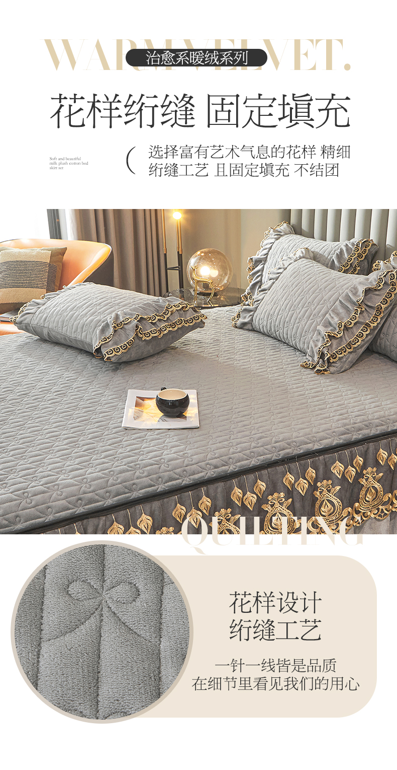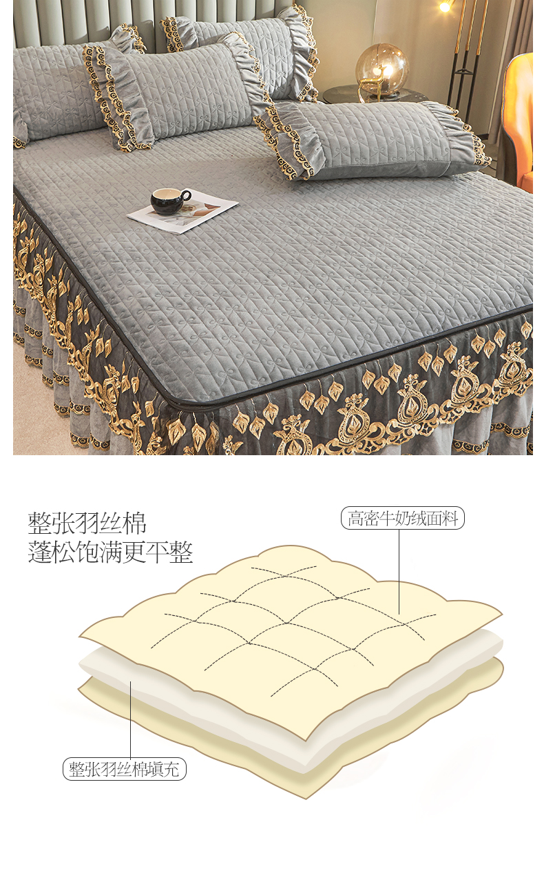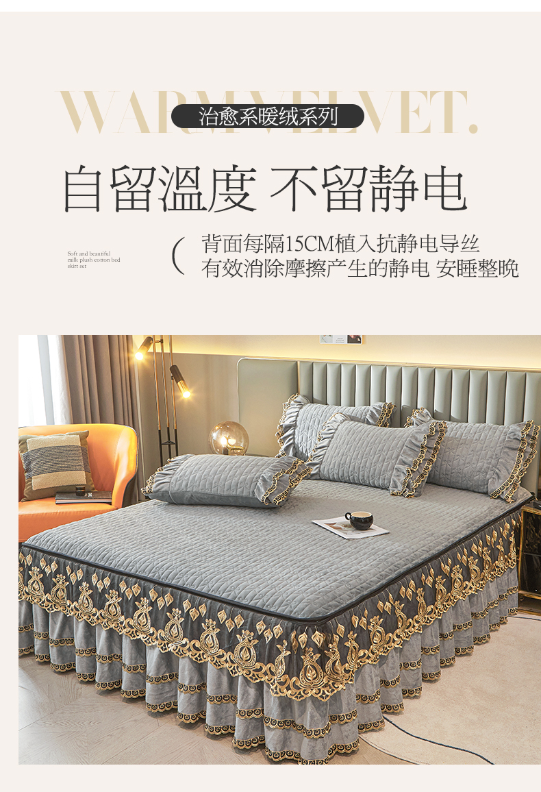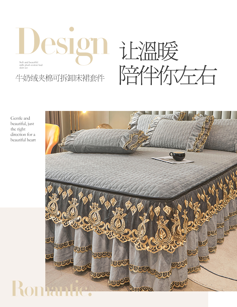 商品名称:虹星家纺 2023新款牛奶绒夹棉蕾丝可拆卸床裙系列单床裙 梦幻巴黎 时尚灰