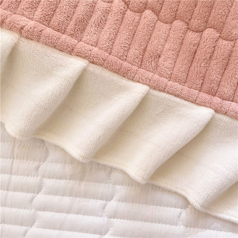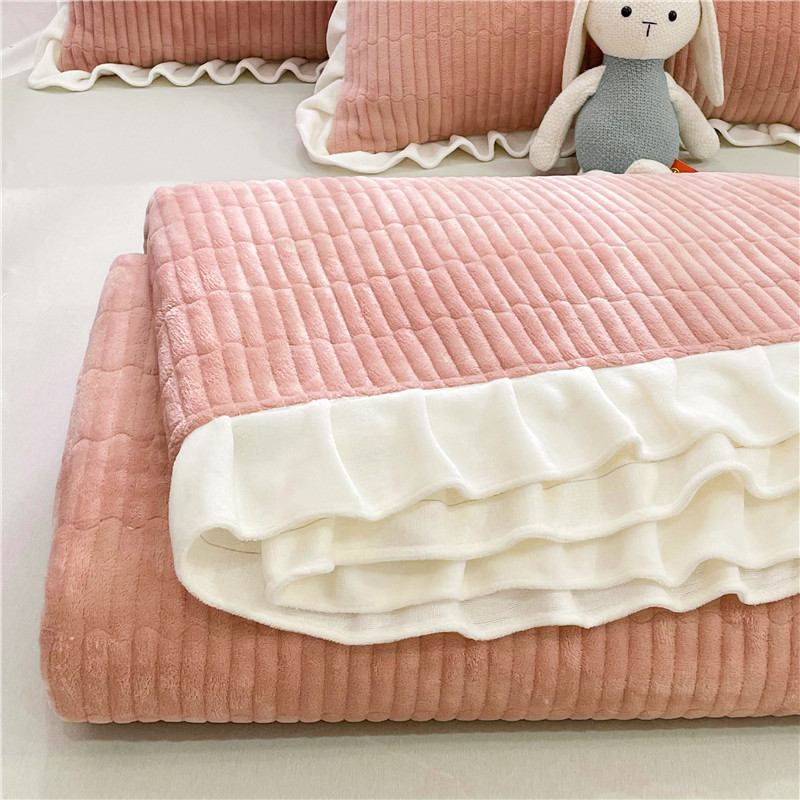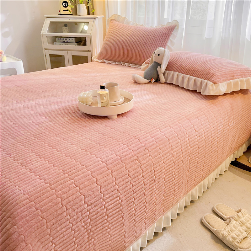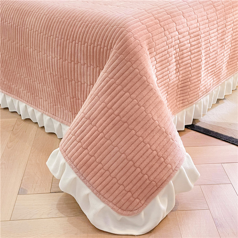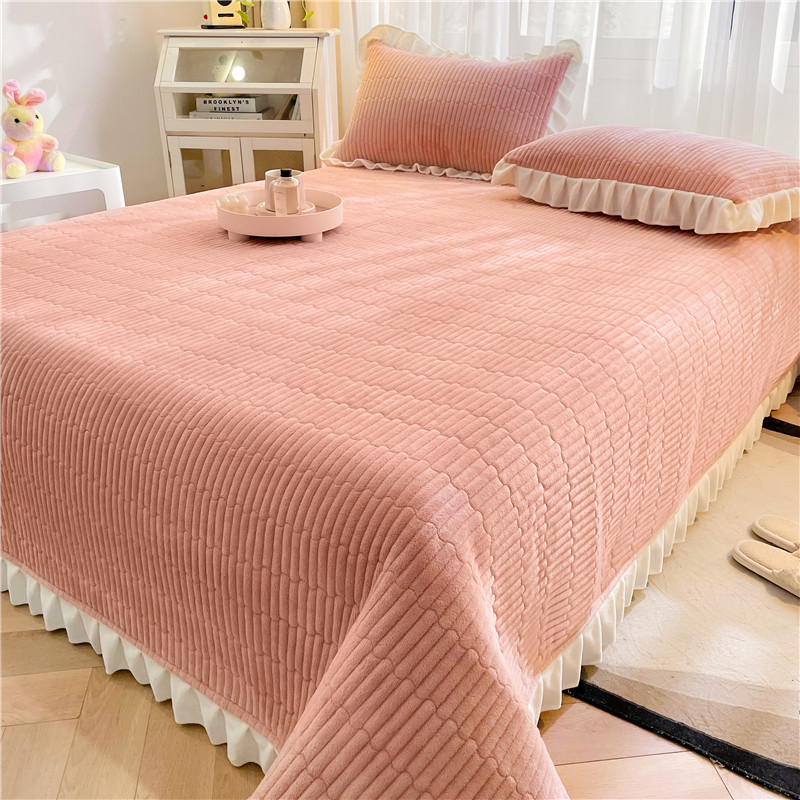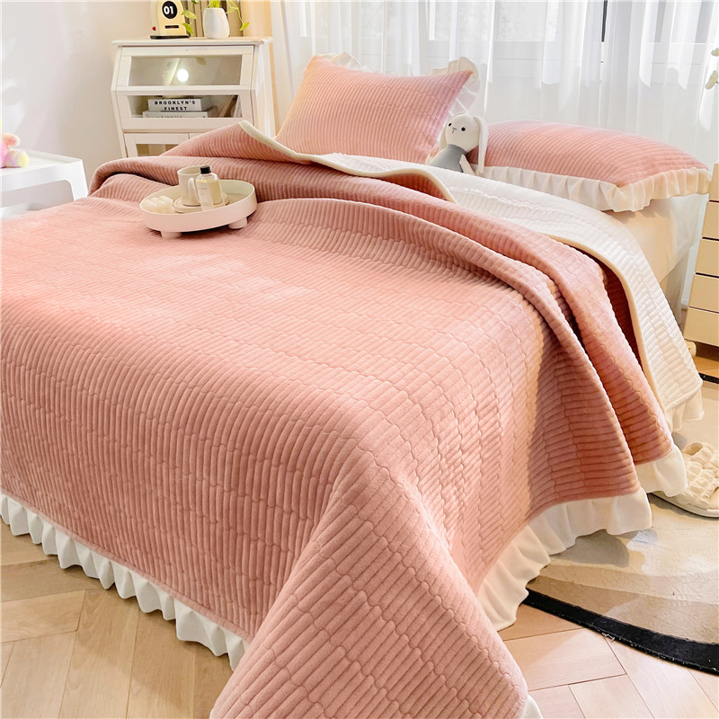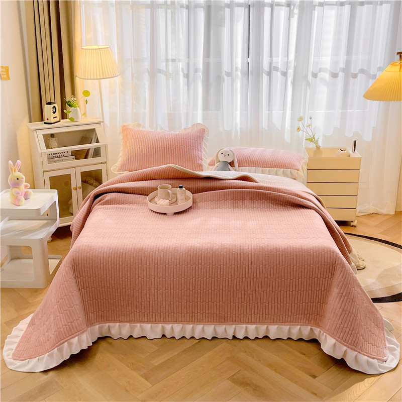 • 91家纺网 家纺一手货源 找家纺 喜居 2023新款纯色牛奶绒花边款床盖 粉豆沙