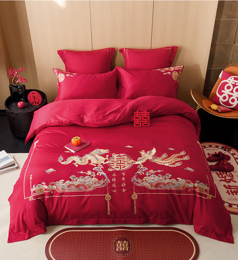 苏源家居 2024新款新婚喜庆大红龙凤重工刺绣圆角床单四件套 百年好合
